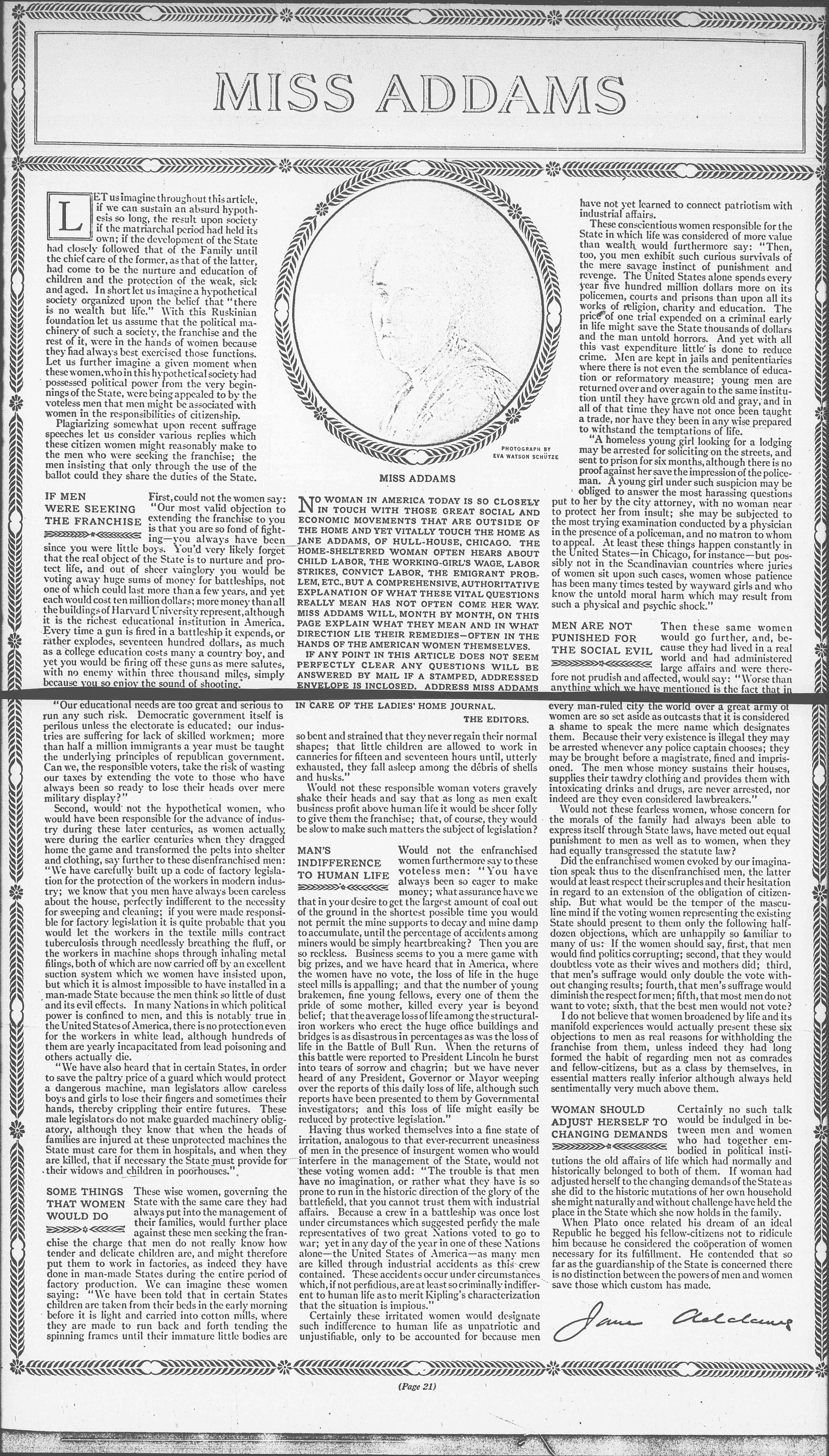 NO WOMAN IN AMERICA TODAY IS SO CLOSELY IN TOUCH WITH THOSE GREAT SOCIAL AND ECONOMIC MOVEMENTS THAT ARE OUTSIDE OF THE HOME AND YET VITALLY TOUCH THE HOME AS JANE ADDAMS, OF HULL-HOUSE, CHICAGO. THE HOME-SHELTERED WOMAN OFTEN HEARS ABOUT CHILD LABOR, THE WORKING-GIRL'S WAGE, LABOR STRIKES, CONVICT LABOR, THE EMIGRANT PROBLEM, ETC., BUT A COMPREHENSIVE, AUTHORITATIVE EXPLANATION OF WHAT THESE VITAL QUESTIONS REALLY MEAN HAS NOT OFTEN COME HER WAY. MISS ADDAMS WILL, MONTH BY MONTH, ON THIS PAGE EXPLAIN WHAT THEY MEAN AND IN WHAT DIRECTION LIE THEIR REMEDIES -- OFTEN IN THE HANDS OF THE AMERICAN WOMEN THEMSELVES.