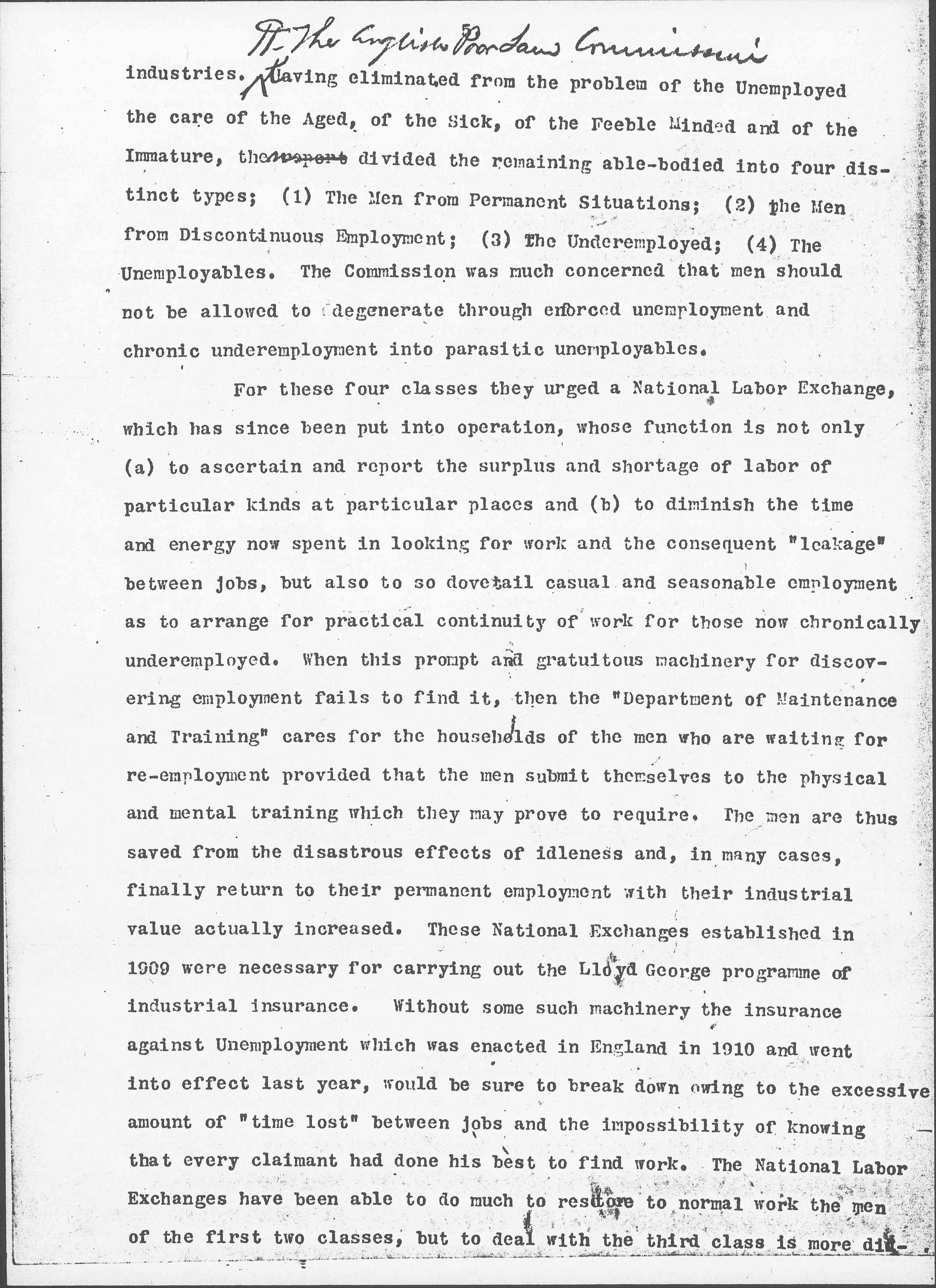 <The English Poor Law Commission>, having eliminated from the problem of the Unemployed the care of the Aged, of the Sick, of the Feeble Minded and of the Immature, the report divided the remaining able-bodied into four distinct types; (1) The Men from Permanent Situations; (2) the Men from Discontinous Employment; (3) The Underemployed; (4) The Unemployables. The Commission was much concerned that men should not be allowed to degenerate through enforced unemployment and chronic underemployment into parasitic unemployables.