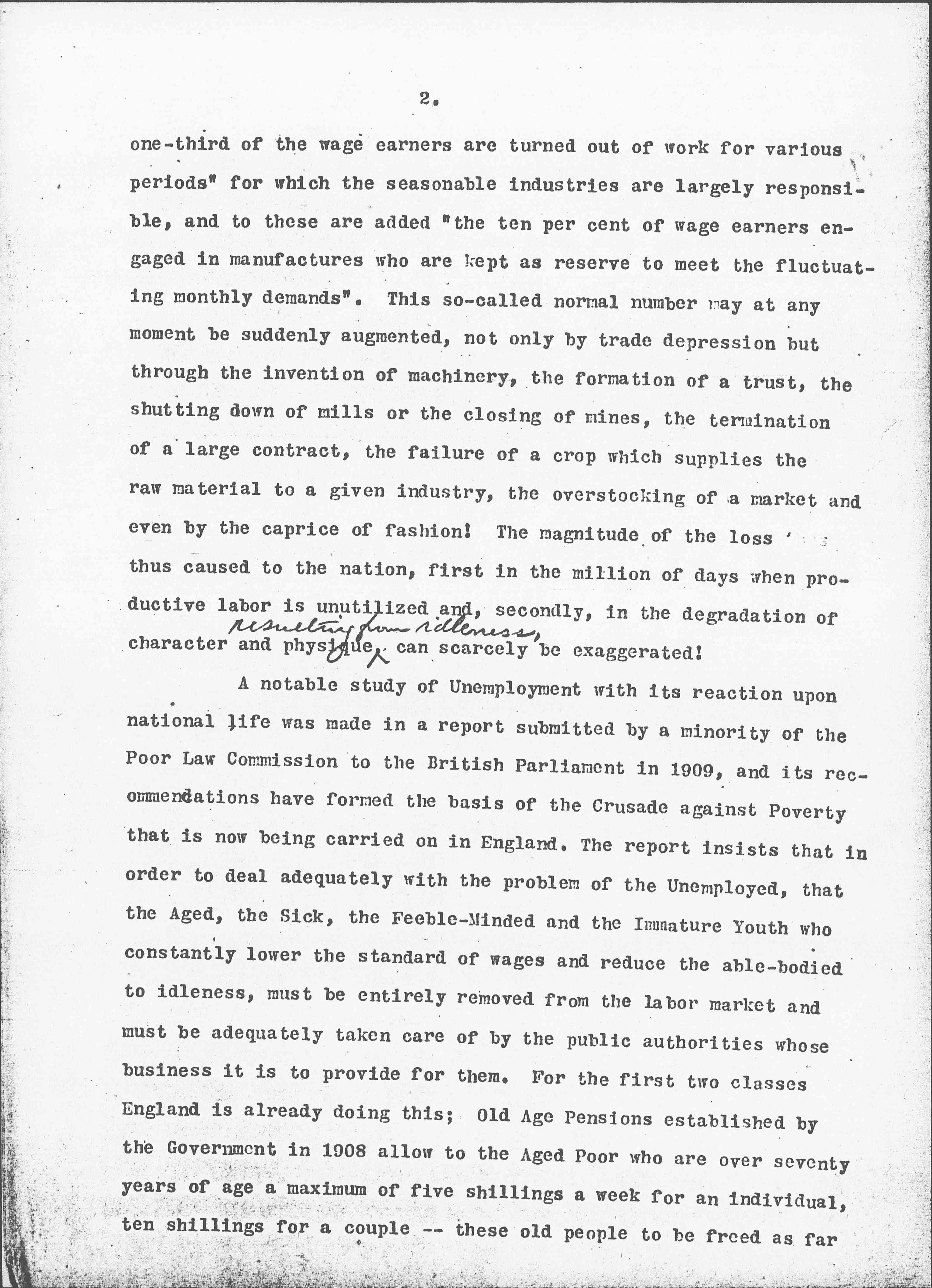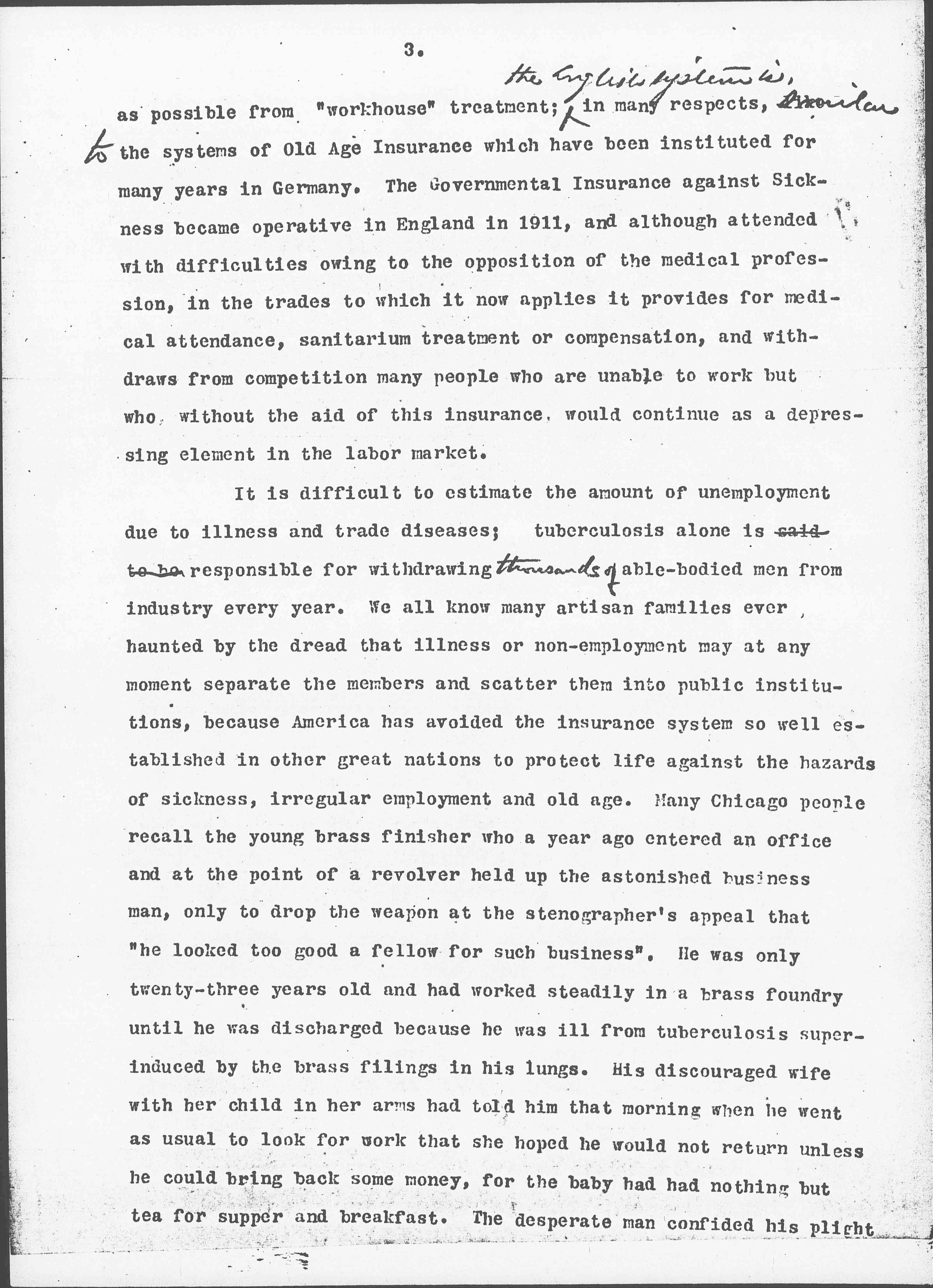 A notable study of Unemployment with its reaction upon national life was made in a report submitted by a minority of the Poor Law Commission to the British Parliament in 1909, and its recommendations have formed the basis of the Crusade against Poverty that is now being carried on in England. The report insists that in order to deal adequately with the problem of the Unemployed, that the Aged, the Sick, the Feeble-Minded and the Immature Youth who constantly lower the standard of wages and reduce the able-bodied to idleness, must be entirely removed from the labor market and must be adequately taken care of by the public authorities whose business it is to provide for them. For the first two classes England is already doing this; Old Age Pensions established by the Government in 1908 allow to the Aged Poor who are over seventy years of age a maximum of five shillings a week for an individual, ten shillings for a couple -- these old people to be freed as far [page 3] as possible from "workhouse" treatment; <the English system is,> in many respects, <similar to> the systems of Old Age Insurance which have been instituted for many years in Germany. The Governmental Insurance against Sickness became operative in England in 1911, and although attended with difficulties owing to the opposition of the medical profession, in the trades to which it now applies it provides for medical attendance, sanitarium treatment or compensation, and withdraws from competition many people who are unable to work but who, without the aid of this insurance, would continue as a depressing element in the labor market.