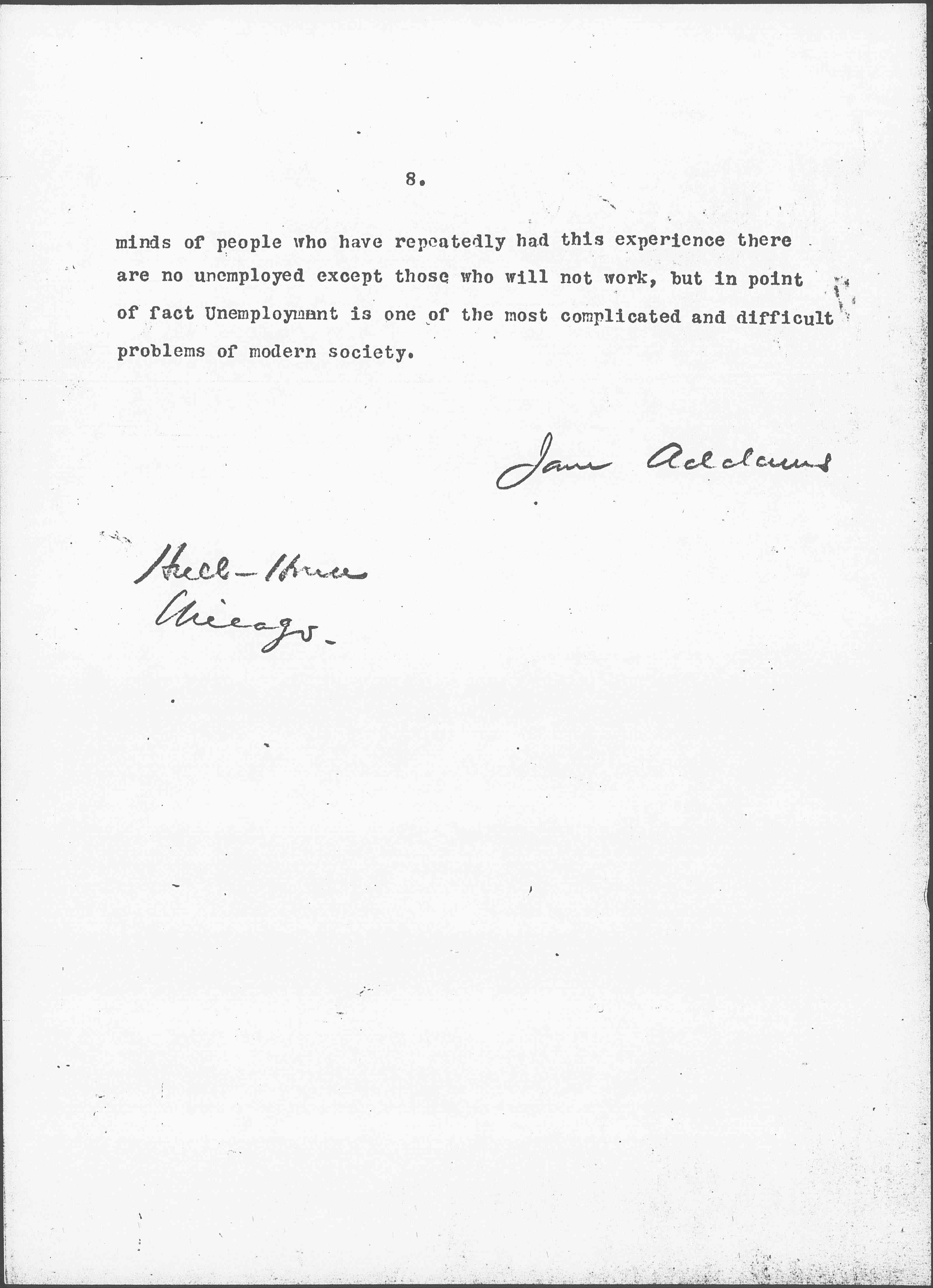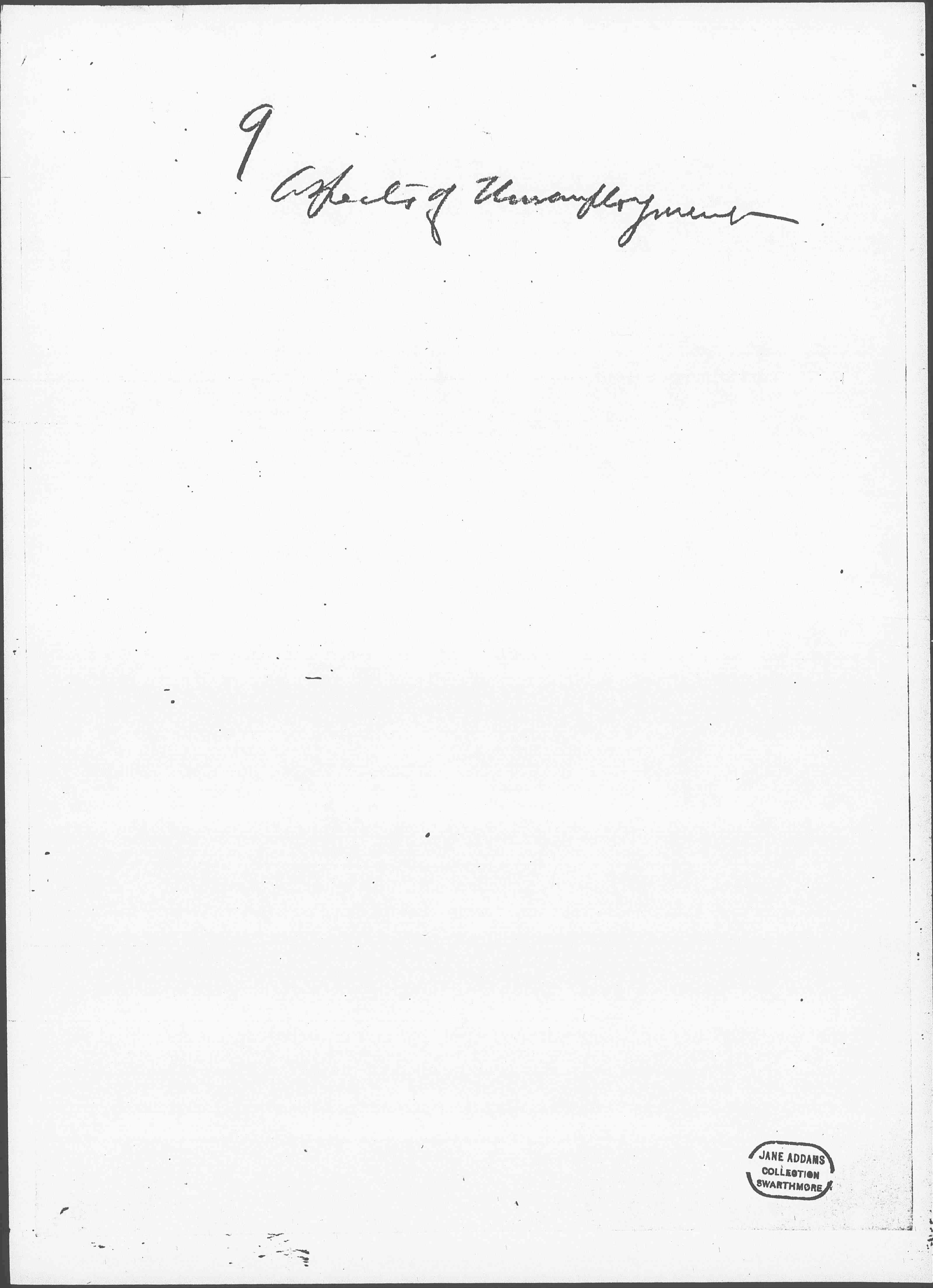 In addition to the older men there are thousands of others suffering the enforced idleness and prolonged privation due to unemployment. Even in a prosperous year "from one-quarter to [page 2] one-third of the wage earners are turned out of work for various periods" for which the seasonable industries are largely responsible, and to these are added "the ten per cent of wage earners engaged in manufactures who are kept as reserve to meet the fluctuating monthly demands". This so-called normal number may at any moment be suddenly augmented, not only by trade depression but through the invention of machinery, the formation of a trust, the shutting down of mills or the closing of mines, the termination of a large contract, the failure of a crop which supplies the raw material to a given industry, the overstocking of a market and even by the caprice of fashion! The magnitude of loss thus caused to the nation, first in the million of days when productive labor is unutilized and, secondly, in the degradation of character and physique <resulting from idleness,> can scarcely be exaggerated!
