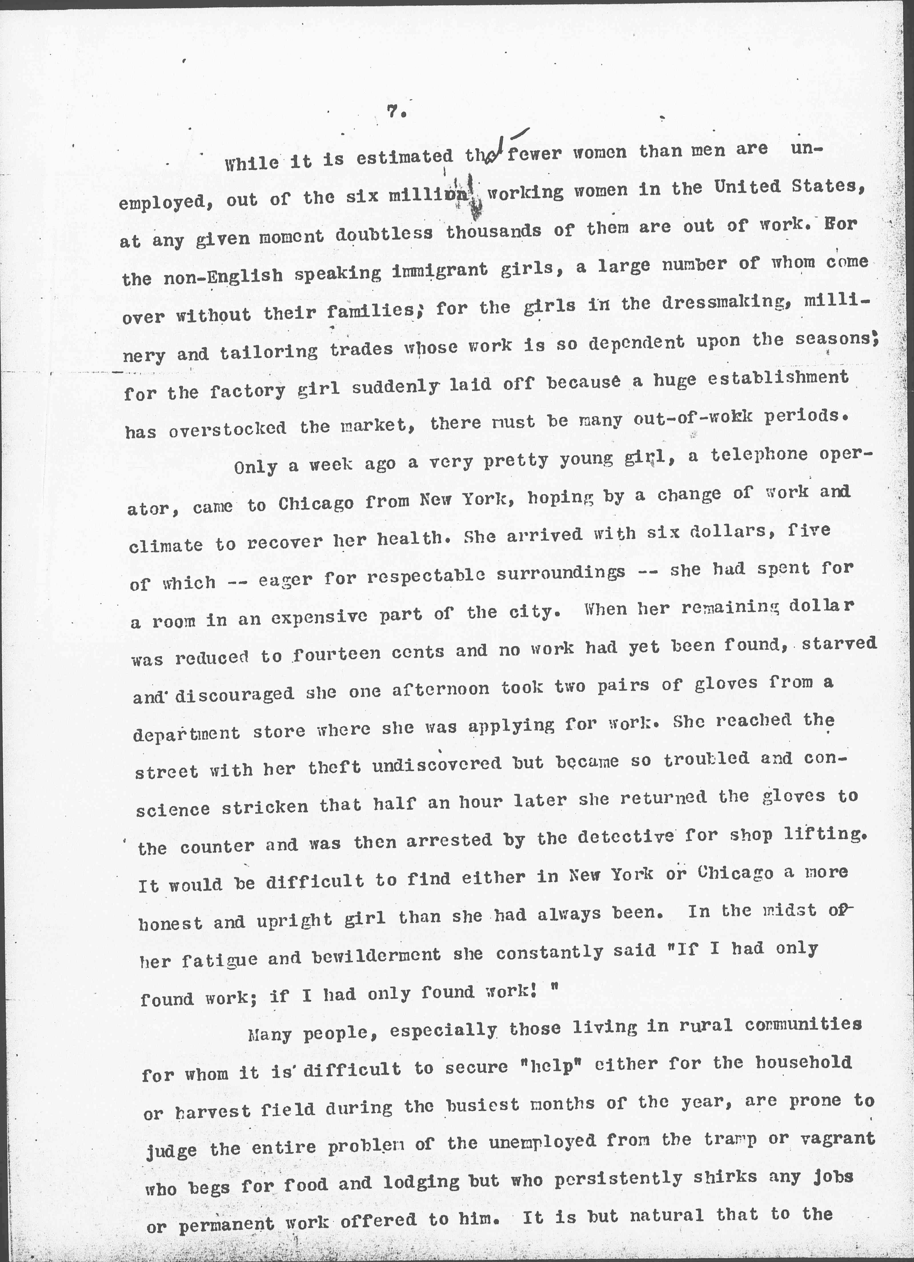 Only a week ago a very pretty young girl, a telephone operator, came to Chicago from New York, hoping by a change of work and climate to recover her health. She arrived with six dollars, five of which -- eager for respectable surroundings -- she had spent for a room in an expensive part of the city. When her remaining dollar was reduced to fourteen cents and no work had yet been found, starved and discouraged she one afternoon took two pairs of gloves from a department store where she was applying for work. She reached the street with her theft undiscovered but became so troubled and conscience stricken that half an hour later she returned the gloves to the counter and was then arrested by the detective for shop lifting. It would be difficult to find either in New York or Chicago a more honest and upright girl than she had always been. In the midst of her fatigue and bewilderment she constantly said "If I had only found work; if I had only found work!"