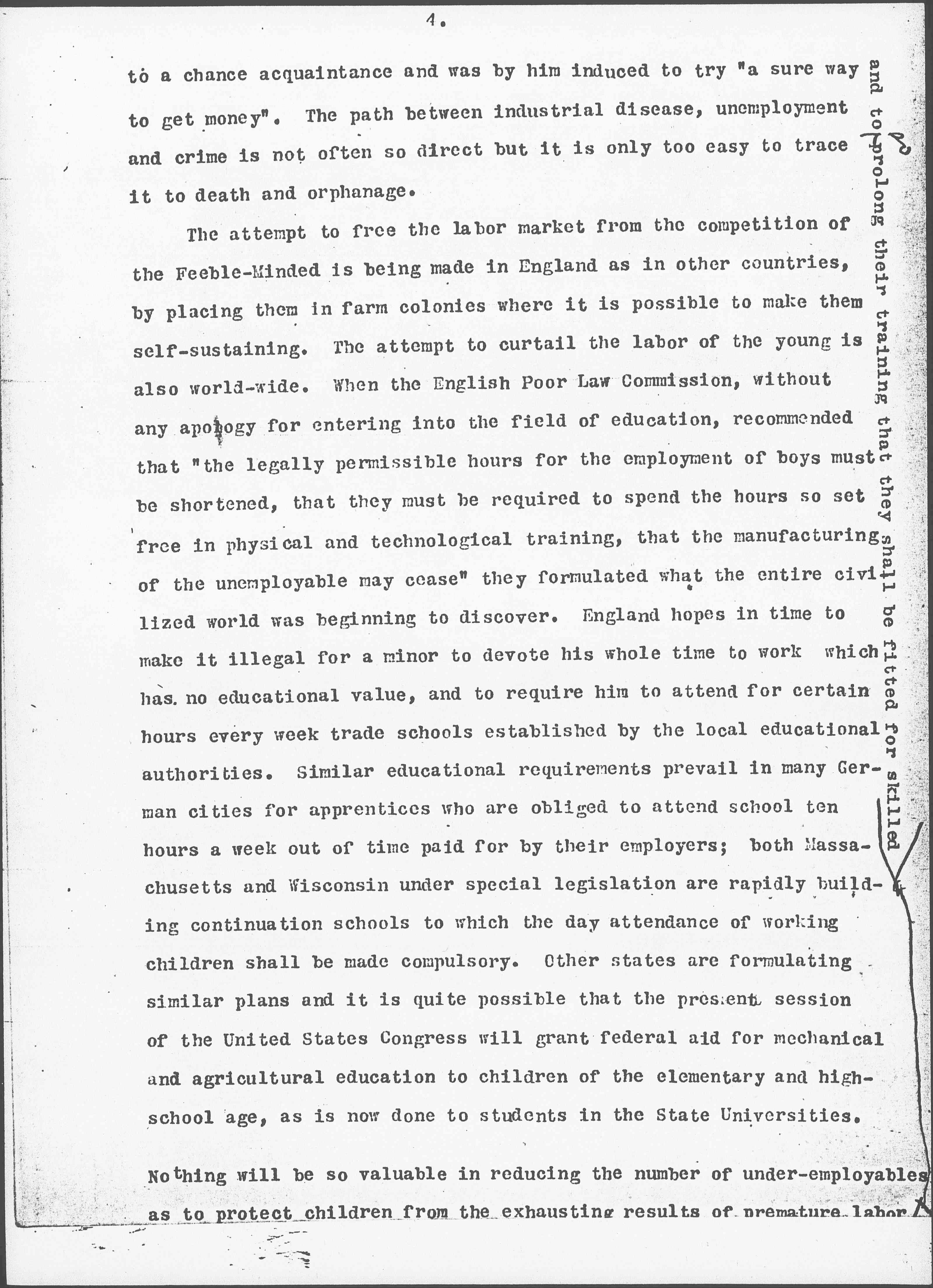 Nothing will be so valuable in reducing the number of under-employables as to protect children from the exhausting results of premature labor [written up right margin] and to <so> prolong their training that they shall be fitted for skilled [page 5] industries.