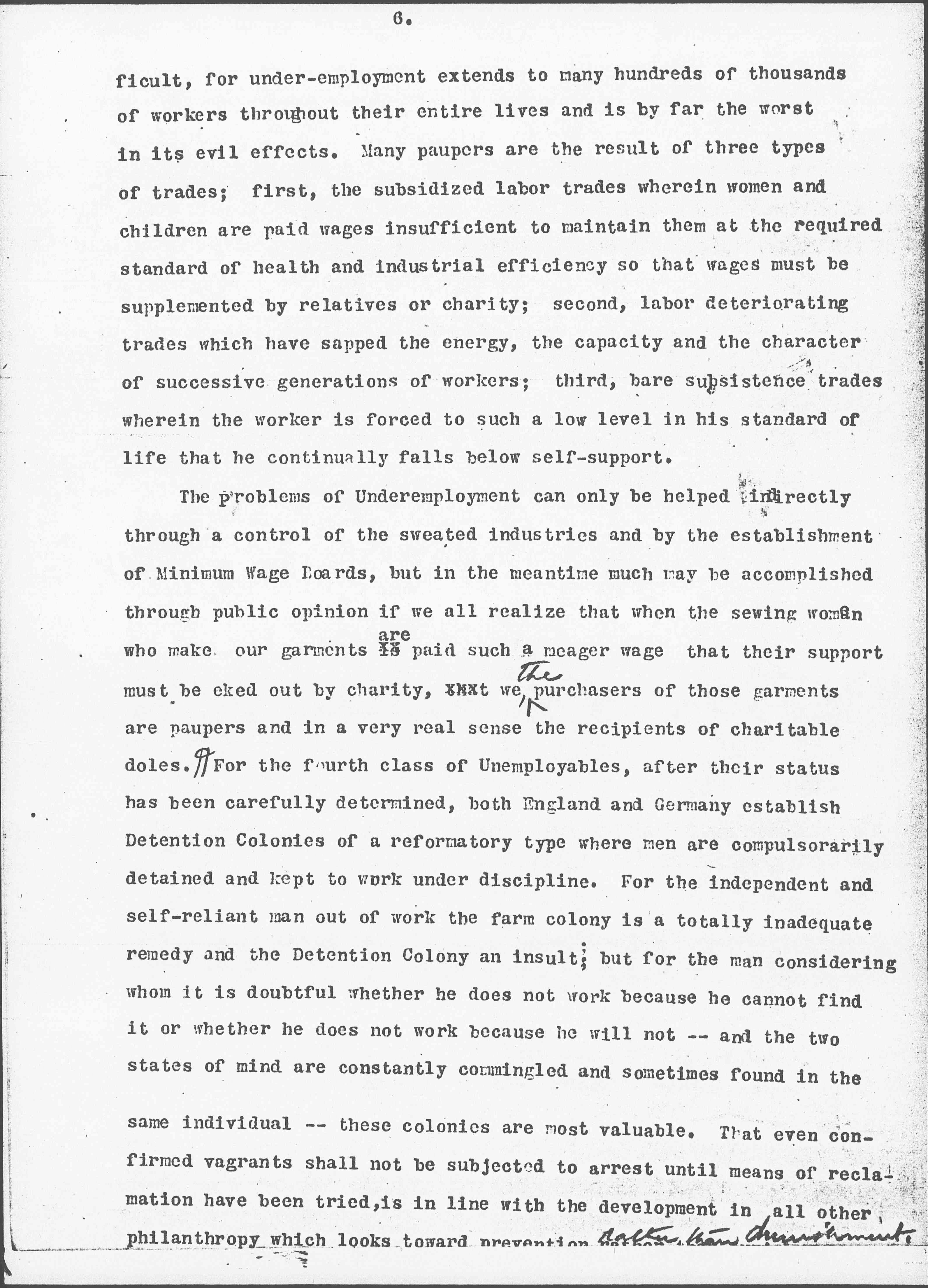 For these four classes they urged a National Labor Exchange, which has since been put into operation, whose function is not only (a) to ascertain and report the surplus and shortage of labor of particular kinds at particular places and (b) to diminish the time and energy now spent in looking for work and the consequent "leakage" between jobs, but also to so dovetail casual and seasonable employment as to arrange for practical continuity of work for those now chronically underemployed. When this prompt and gratuitous machinery for discovering employment fails to find it, then the "Department of Maintenance and Training" cares for the households of the men who are waiting for re-employment provided that the men submit themselves to the physical and mental training which they may prove to require. The men are thus saved from the disastrous effects of idleness and, in many cases, finally return to their permanent employment with their industrial value actually increased. These National Exchanges established in 1909 were necessary for carrying out the Lloyd George [program] of industrial insurance. Without some such machinery the insurance against Unemployment which was enacted in England in 1910 and went into effect last year, would be sure to break down owing to the excessive amount of "time lost" between jobs and the impossibility of knowing that every claimant had done his best to find work. The National Labor Exchanges have been able to do much to restore to normal work the men of the first two classes, but to deal with the third class is more difficult, [page 6] for under-employment extends to many hundreds of thousands of workers throughout their entire livesv and is by far the worst in its evil effects. Many paupers are the result of three types of trades; first, the subsidized labor trades wherein women and children are paid wages insufficient to maintain them at the required standard of health and industrial efficiency so that wages must be supplemented by relatives or charity; second, labor deteriorating trades which have sapped the energy, the capacity and the character of successive generations of workers; third, bare subsistence trades wherein the worker is forced to such a low level in his standard of life that he continually fails below self-support.