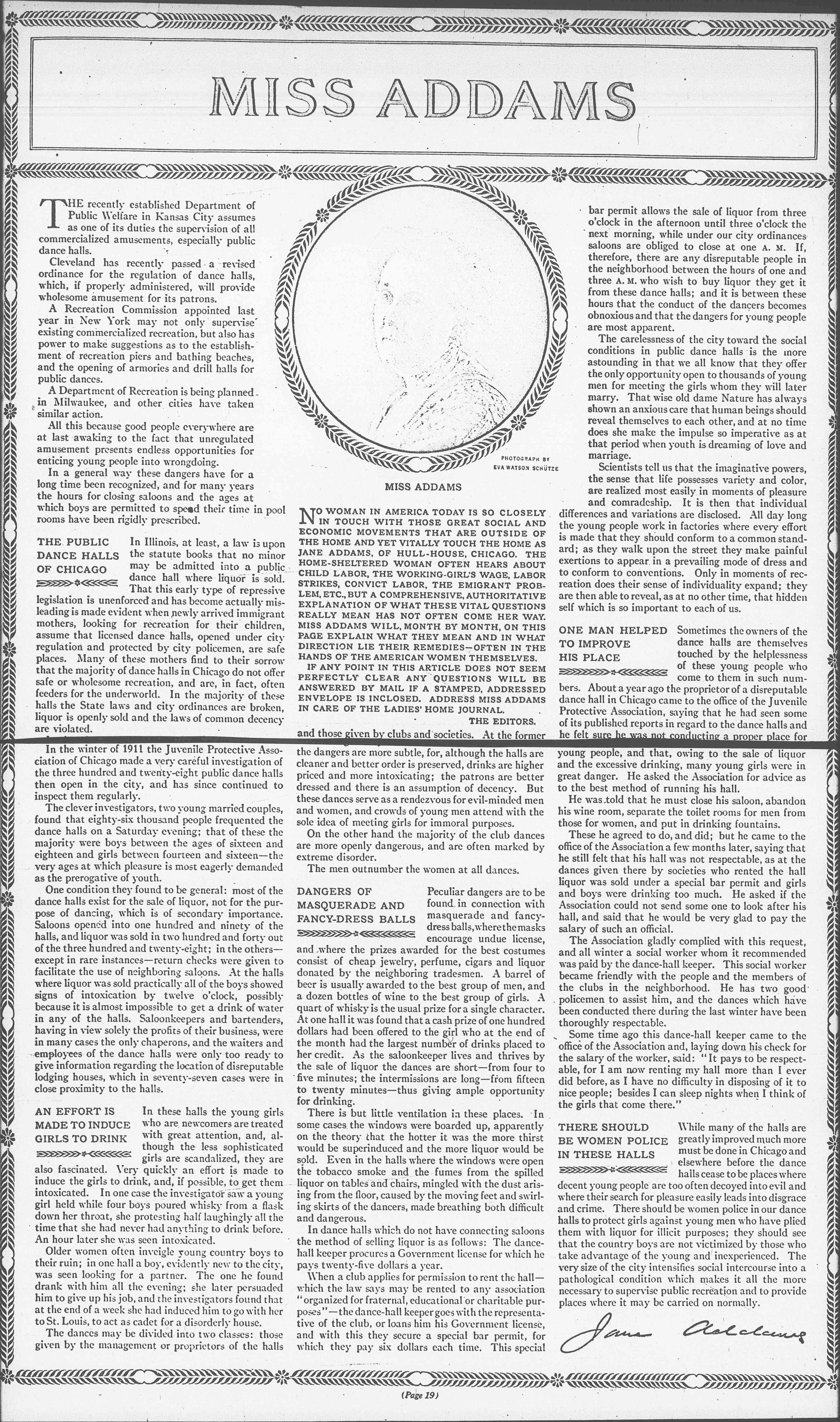 NO WOMAN IN AMERICA TODAY IS SO CLOSELY IN TOUCH WITH THOSE GREAT SOCIAL AND ECONOMIC MOVEMENTS THAT ARE OUTSIDE OF THE HOME AND YET VITALLY TOUCH THE HOME AS JANE ADDAMS, OF HULL-HOUSE, CHICAGO. THE HOME-SHELTERED WOMAN OFTEN HEARS ABOUT CHILD LABOR, THE WORKING-GIRL'S WAGE, LABOR STRIKES, CONVICT LABOR, THE EMIGRANT PROBLEM, ETC., BUT A COMPREHENSIVE, AUTHORITATIVE EXPLANATION OF WHAT THESE VITAL QUESTIONS REALLY MEAN HAS NOT OFTEN COME HER WAY. MISS ADDAMS WILL, MONTH BY MONTH, ON THIS PAGE EXPLAIN WHAT THEY MEAN AND IN WHAT DIRECTION LIE THEIR REMEDIES -- OFTEN IN THE HANDS OF THE AMERICAN WOMEN THEMSELVES.