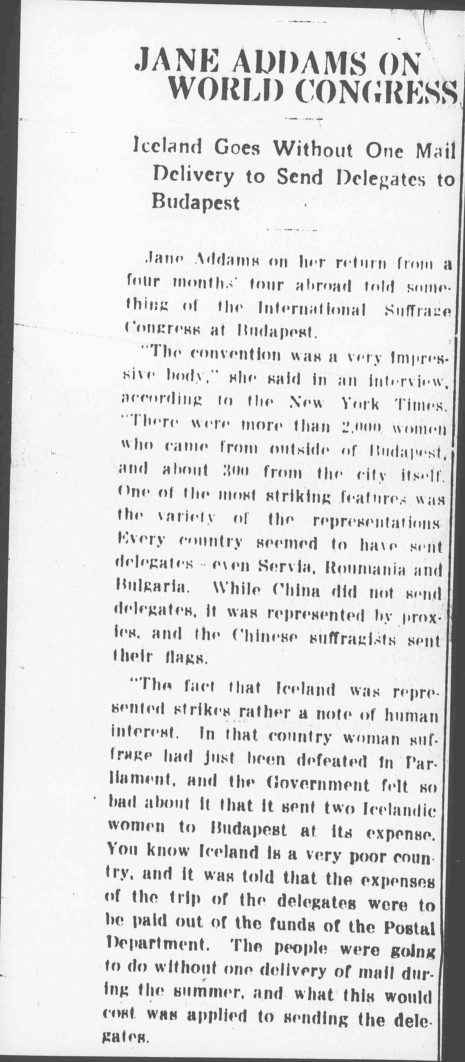 "The fact that Iceland was represented strikes rather a note of human interest. In that country woman suffrage had just been defeated in Parliament, and the Government felt so bad about it that it sent two Icelandic women to Budapest at its expense. You know Iceland is a very poor country, and it was told that the expenses of the trip of the delegates were to be paid out of the funds of the Postal Department. The people were going to do without one delivery of mail during the summer, and what this would cost was applied to sending the delegates. [page 2]