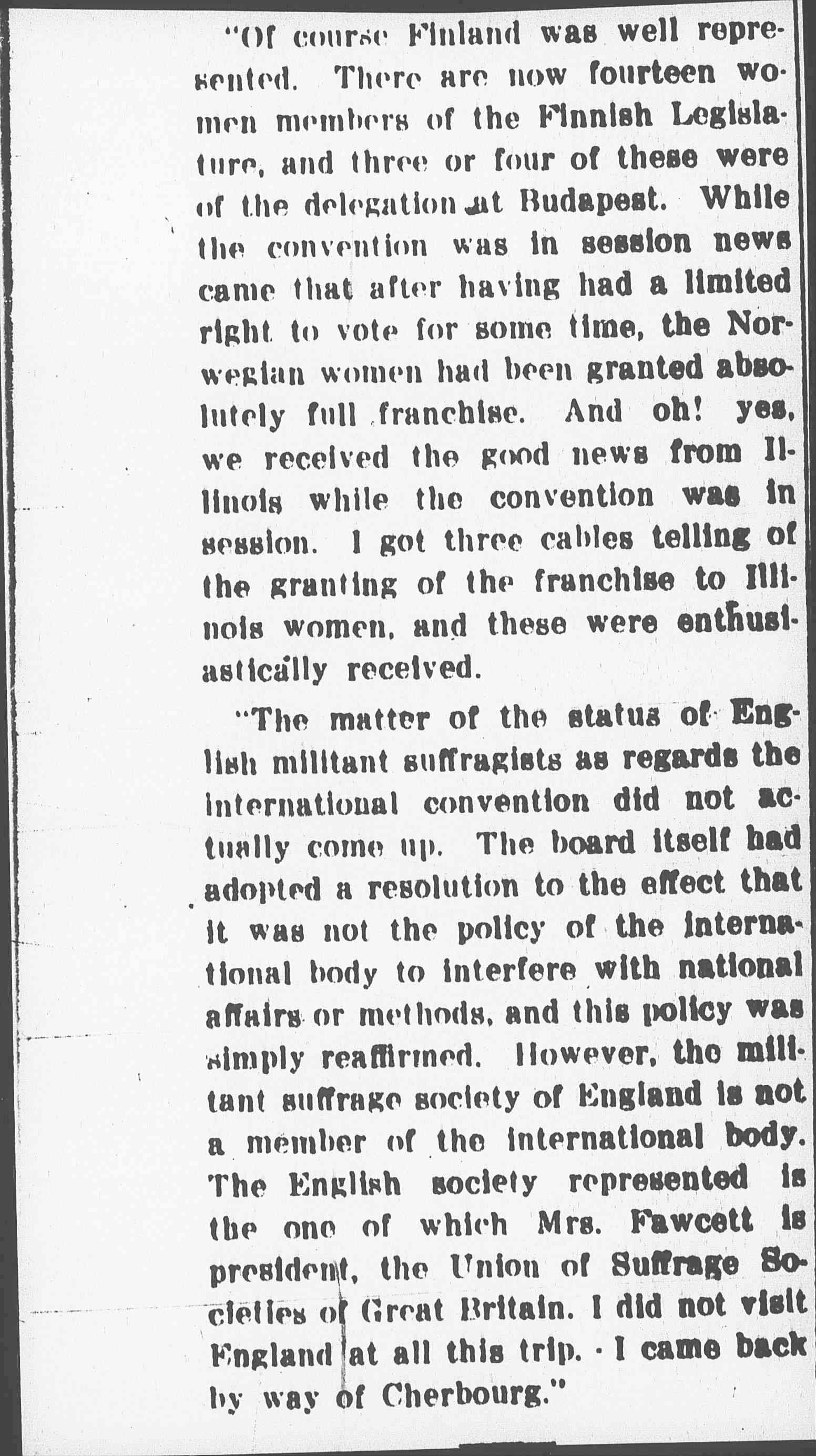 "The matter of the status of English militant suffragists as regards the international convention did not actually come up. The board itself had adopted a resolution to the effect that it was not the policy of the international body to interfere with national affairs or methods, and this policy was simply reaffirmed. However, the militant suffrage society of England is not a member of the international body. The English society represented is the one of which Mrs. Fawcett is president, the Union of Suffrage Societies of Great Britain. I did not visit England at all this trip. I came back by way of Cherbourg."