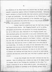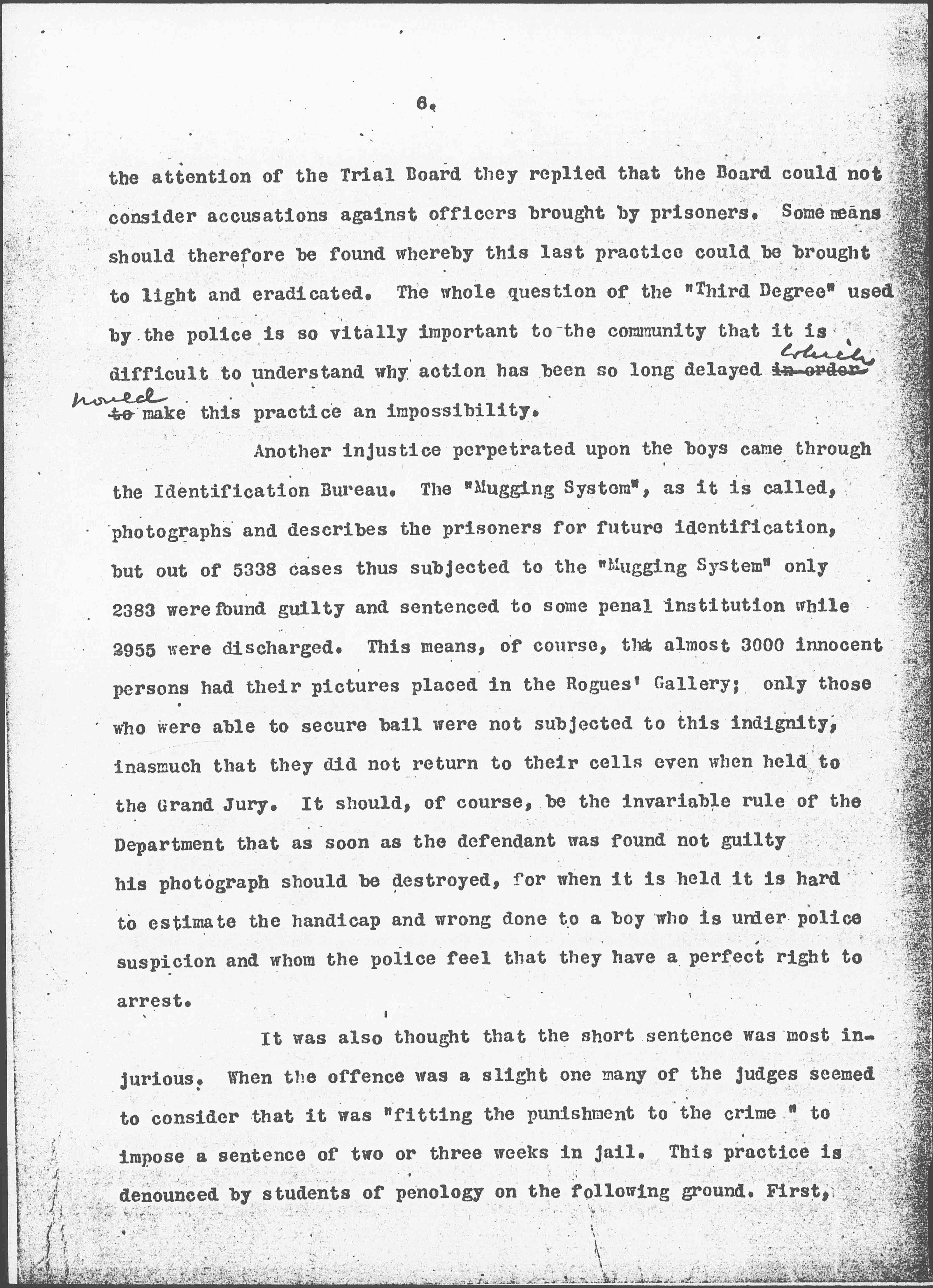 Worse than this, however, were the complaints of ten of the boys in the County Jail that in the police station they had been kicked, beaten and terrorized in order to force a confession. Certainly Case 53 had lost a tooth when a police lieutenant tried to make him confess by hitting him with his first while Case 63 had been beaten <in addition to a beating> had a bucket of cold water poured over him when the beating did not produce the wished for effect. When these cases were brought to [page 6] the attention of the Trial Board they replied that the Board could not consider accusations against officers brought by prisoners. Some means should therefore be found whereby this last practice could be brought to light and eradicated. The whole question of the "Third Degree" used by the police is so vitally important to the community that it is difficult to understand why action has been so long delayed in order to <which would> make this practice an impossibility.