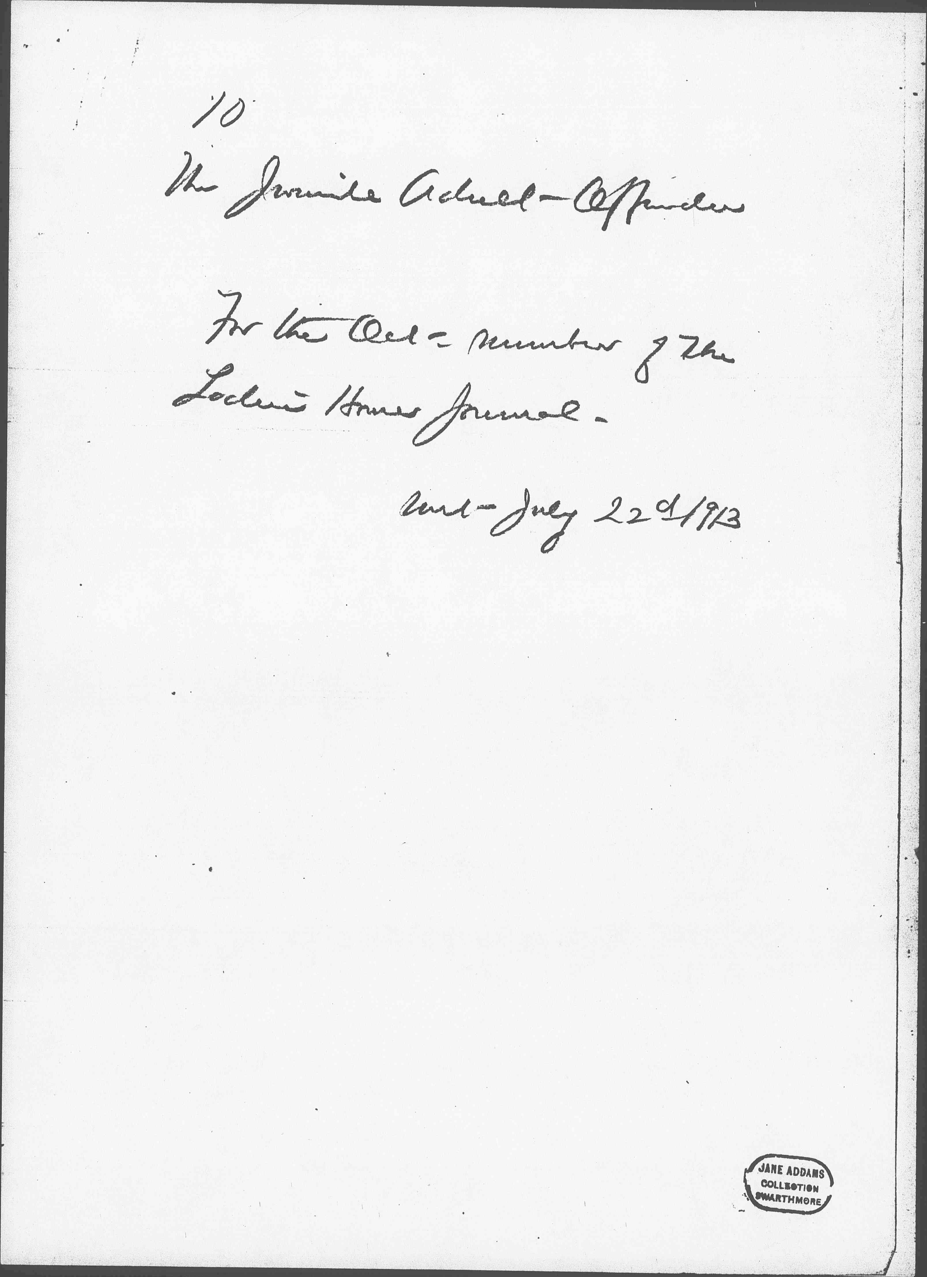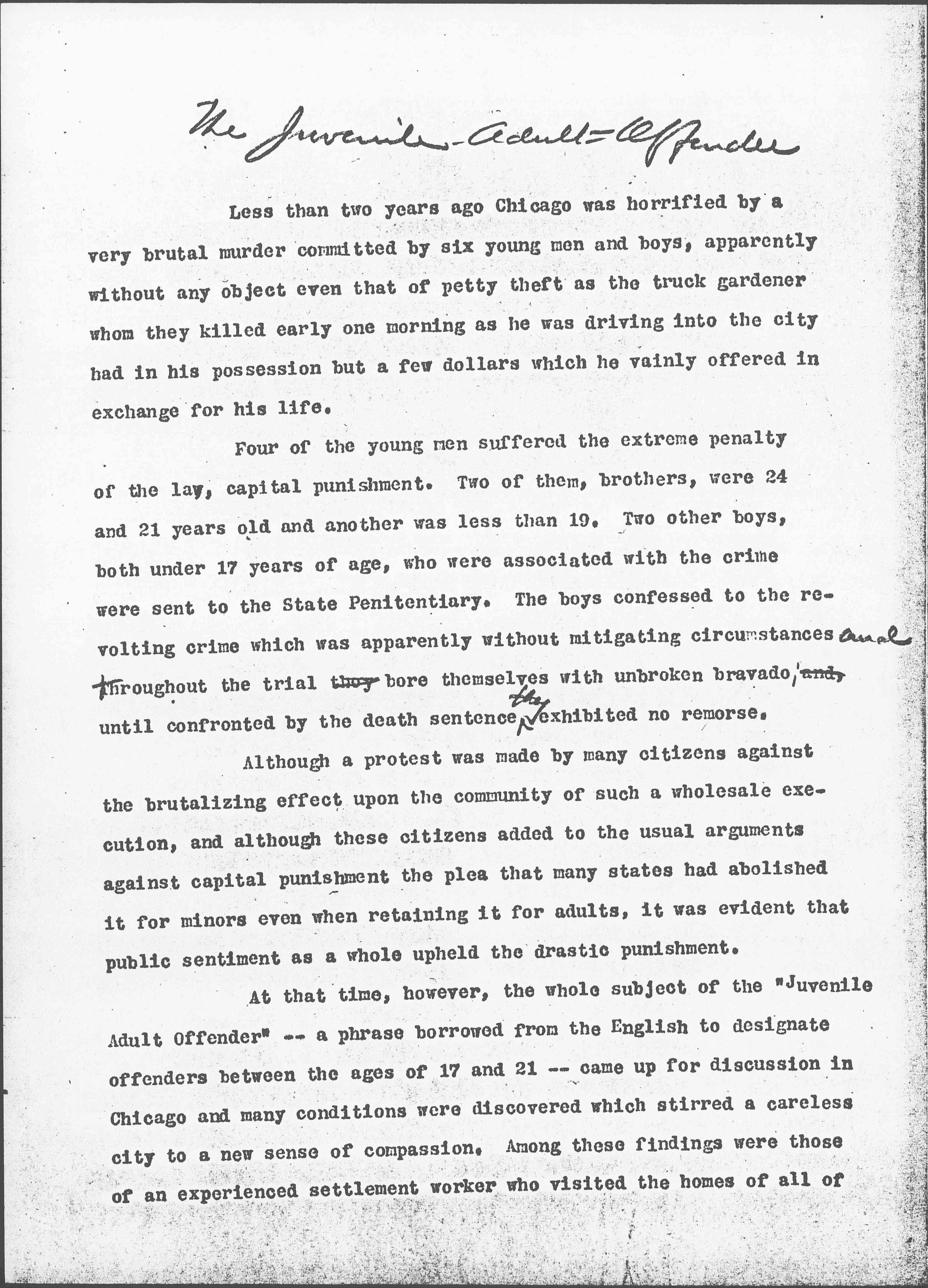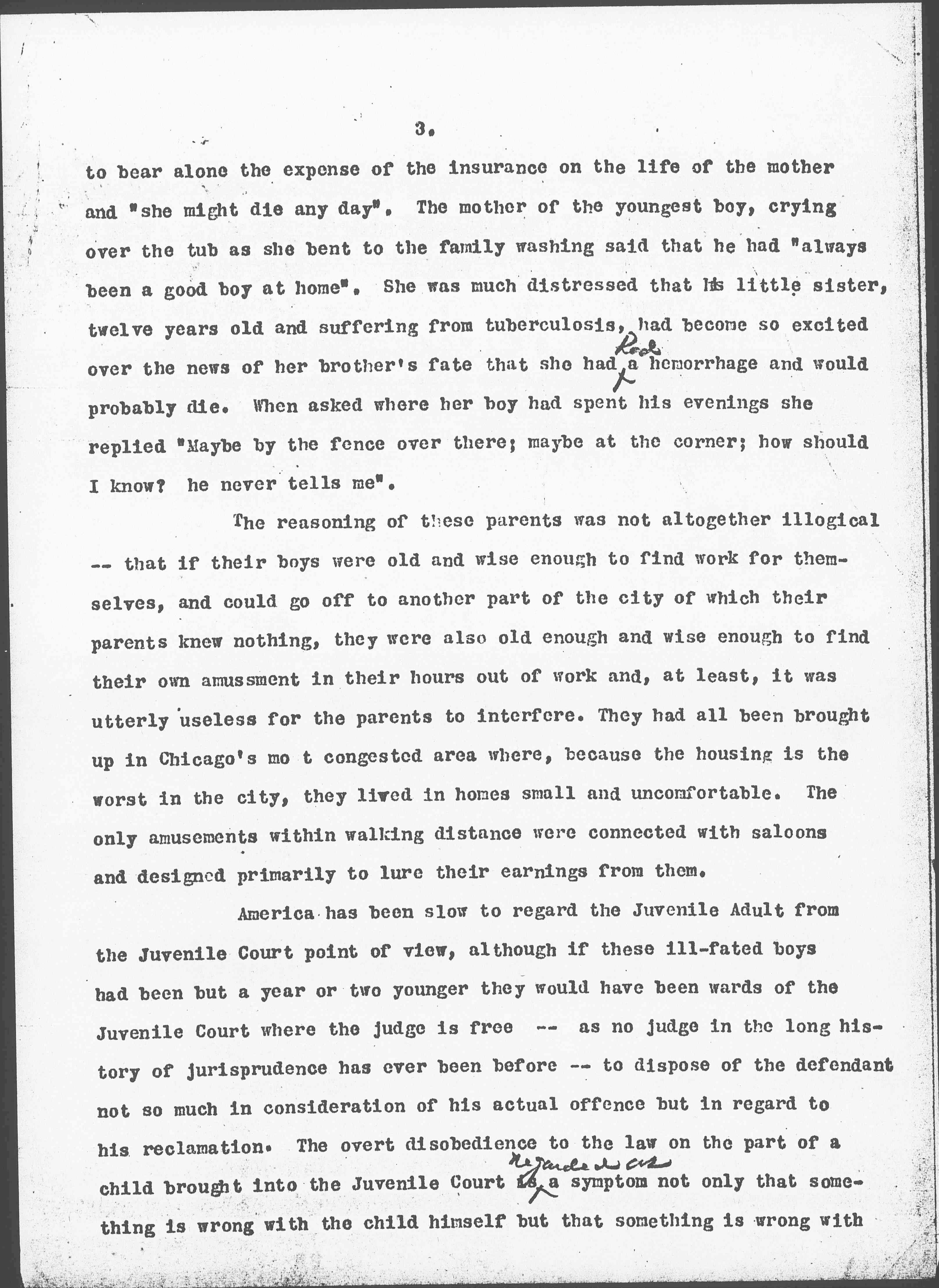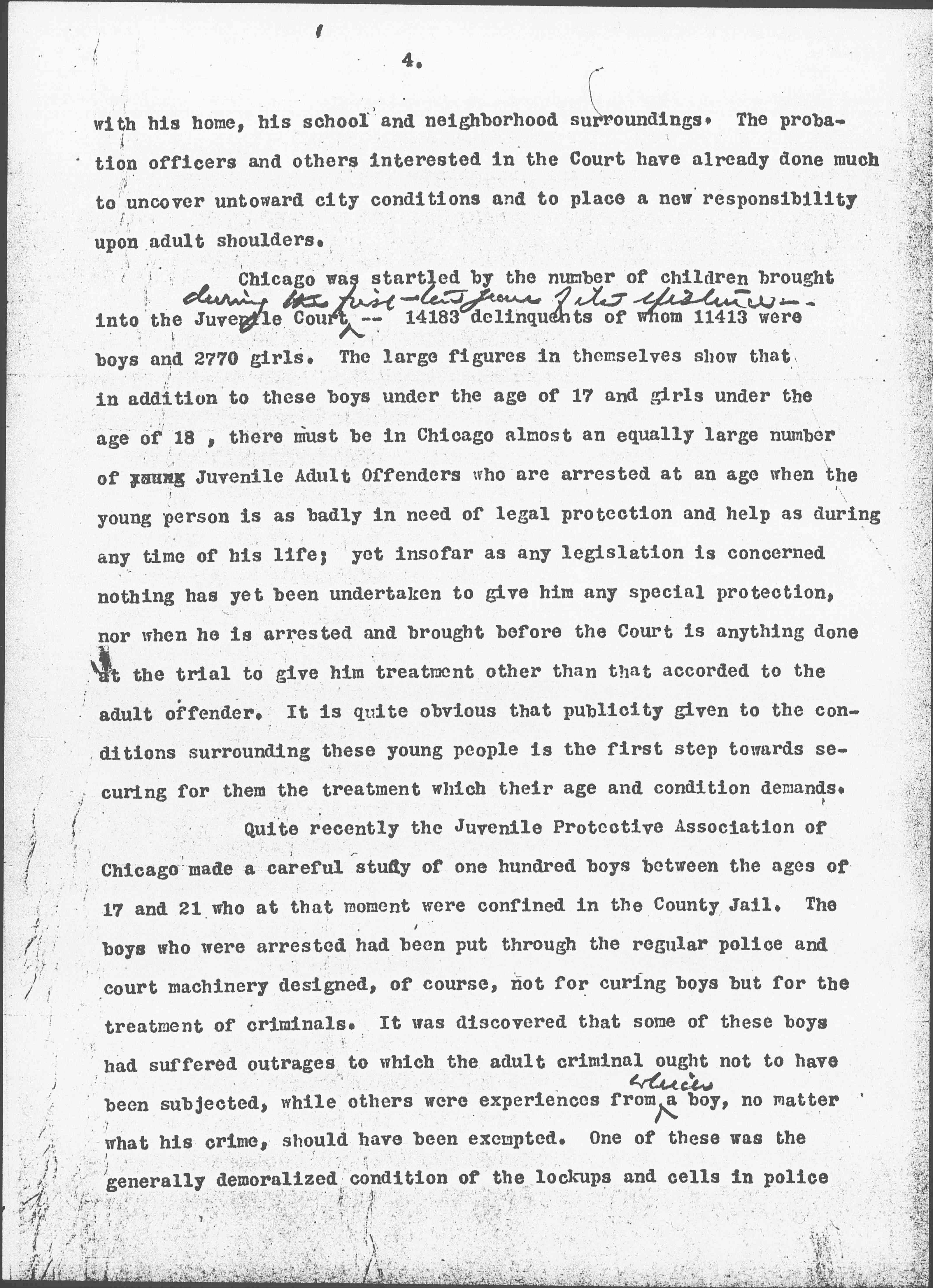 America has been slow to regard the Juvenile Adult from the Juvenile Court point of view, although if these ill-fated boys had been but a year or two younger they would have been wards of the Juvenile Court where the judge is free -- as no judge in the long history of jurisprudence has ever been before -- to dispose if the defendant not so much in consideration of his actual [offense] but in regard to his reclamation. The overt disobedience to the law on the part of a child brought into the Juvenile Court is <regarded as> a sympton not only that something is wrong with the child himself but that something is wrong with [page 4] with his home, his school and neighborhood surroundings. The probation officers and other interested in the Court have already done much to uncover untoward city conditions and to place a new responsibility upon adult shoulders.