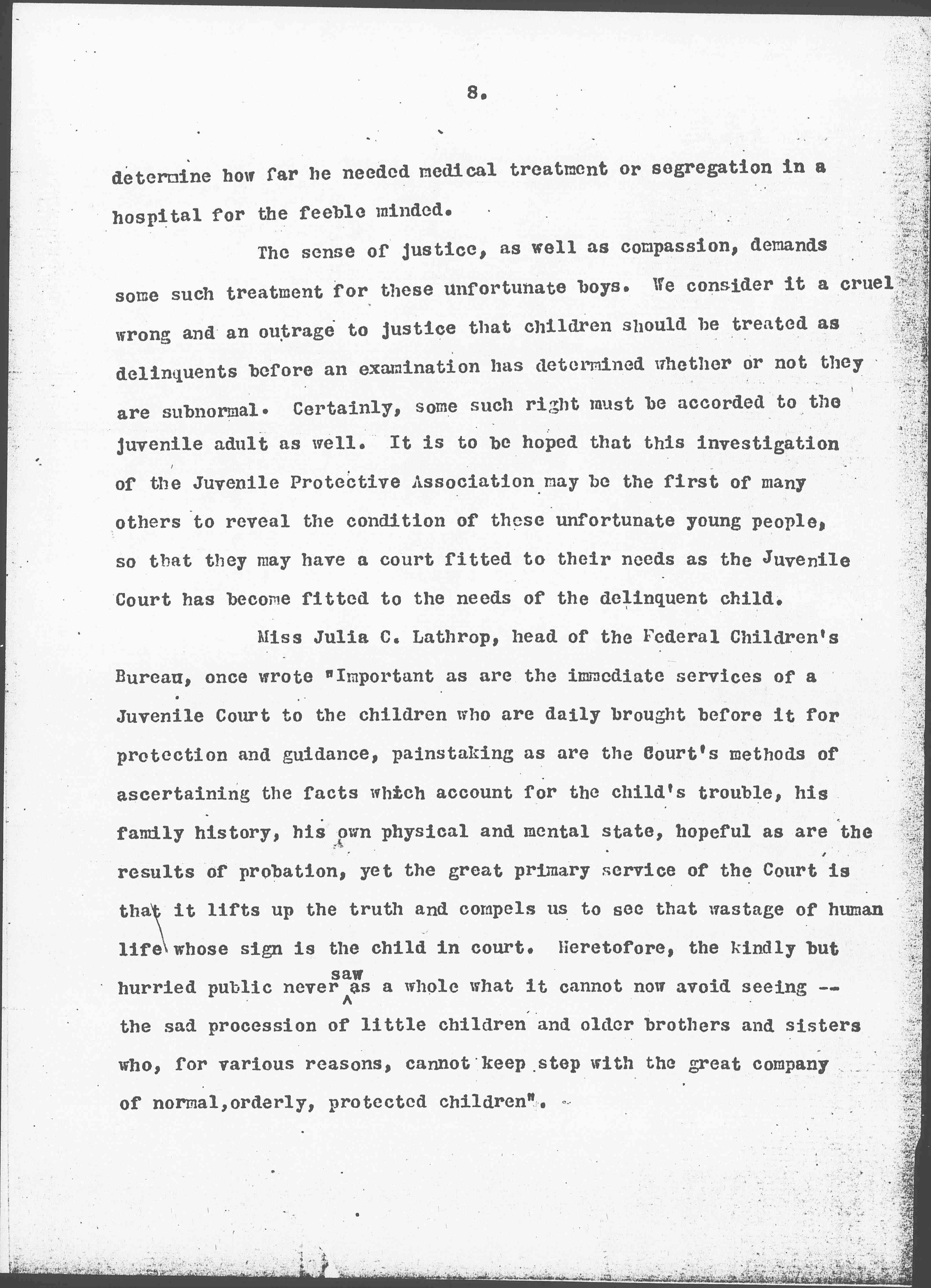 It was not surprising that when the Juvenile Protective Association made a study of the health conditions of these one hundred boys it disclosed the fact that a large number were mentally defective and that many more were undernourished and underdeveloped. Were the juvenile adult offender treated in a separate court presided over by a judge who had at his command a well organized psychopathic department, as the Juvenile Court of Chicago now has, it would give to every defendant who there was reason to believe was defective or abnormal, a thorough examination so that the judge might [page 8] determine how far he needed medical treatment or segregation in a hospital for the feeble minded.