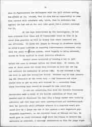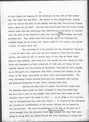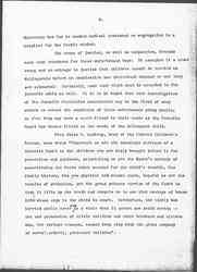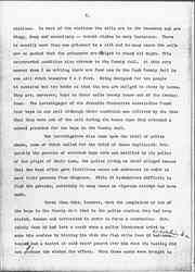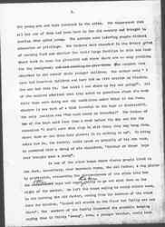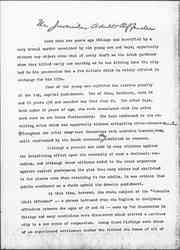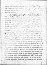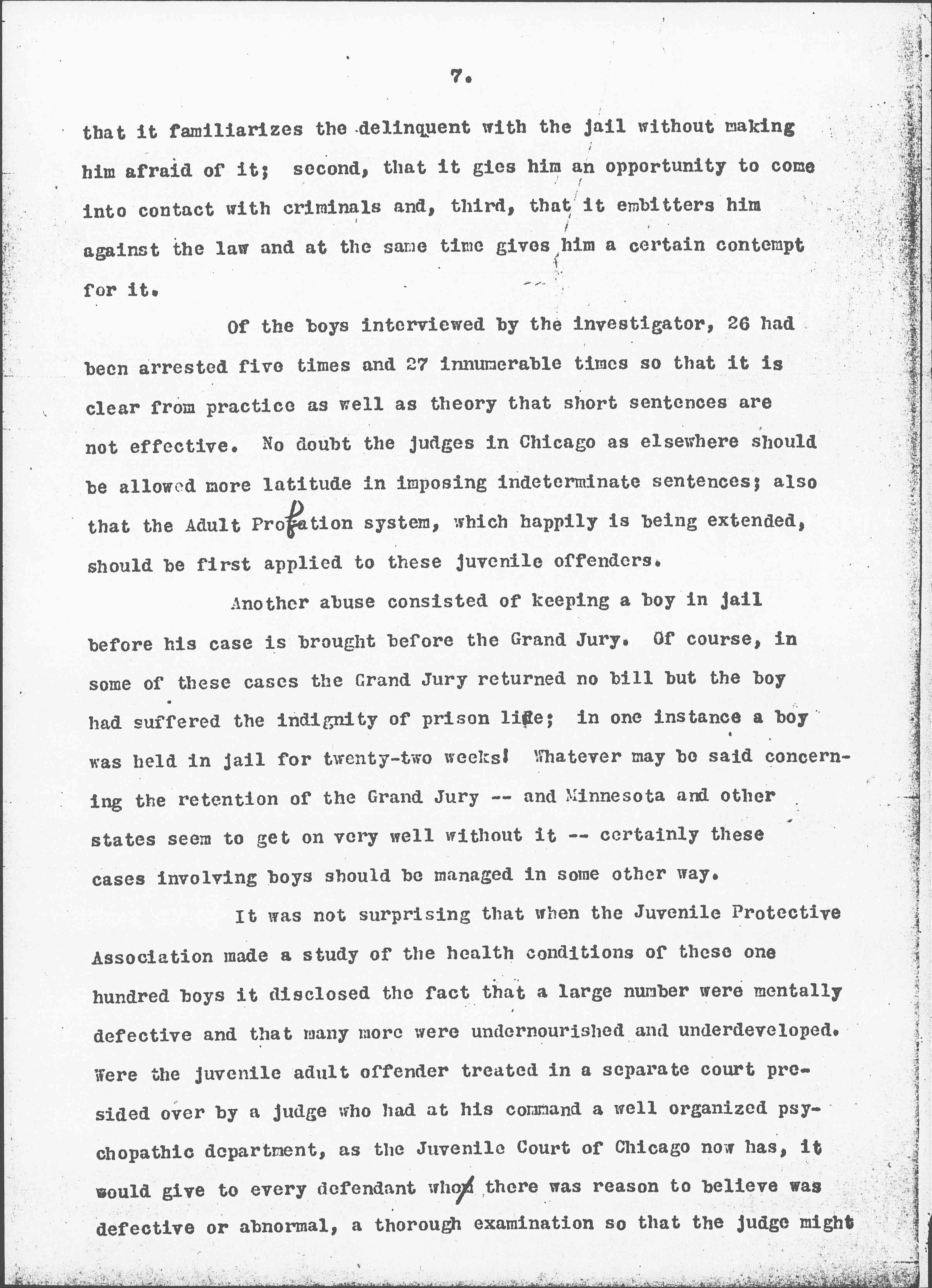 Quite recently the Juvenile Protective Association of Chicago made a careful study of one hundred boys between the ages of 17 and 21 who at that moment were confined in the County Jail. The boys who were arrested had been put through the regular police and court machinery designed, of course, not for curing boys but for the treatment of criminals. It was discovered that some of these boys had suffered outrages to which the adult criminal ought not to have been subjected, while others were experiences from <which> a boy, no matter what his crime, should have been exempted. One of these was the generally demoralized condition of the lockups and cells in police [page 5] stations. In most of the stations the cells are in the basement and are dingy, damp and unsanitary -- vermin ridden in many instances. There is usually more than one prisoner in a cell and in many cases the cells are so packed that the prisoners are obliged to stand all night. This overcrowded condition also extends to the County Jail. At this very moment when I am writing there are four men in the Cook County Jail is one cell which measures 7 x 9 feet. Being designed for two people it contains but two bunks so that the men are obliged to sleep by turns. They are, moreover, kept in their cells twenty hours out of the twenty-four. The [investigator] of the Juvenile Protective Association found four boys in one cell although their condition was relieved by the fact that they were out of the cell during the hours when they attended a school provided for the boys in the County Jail.