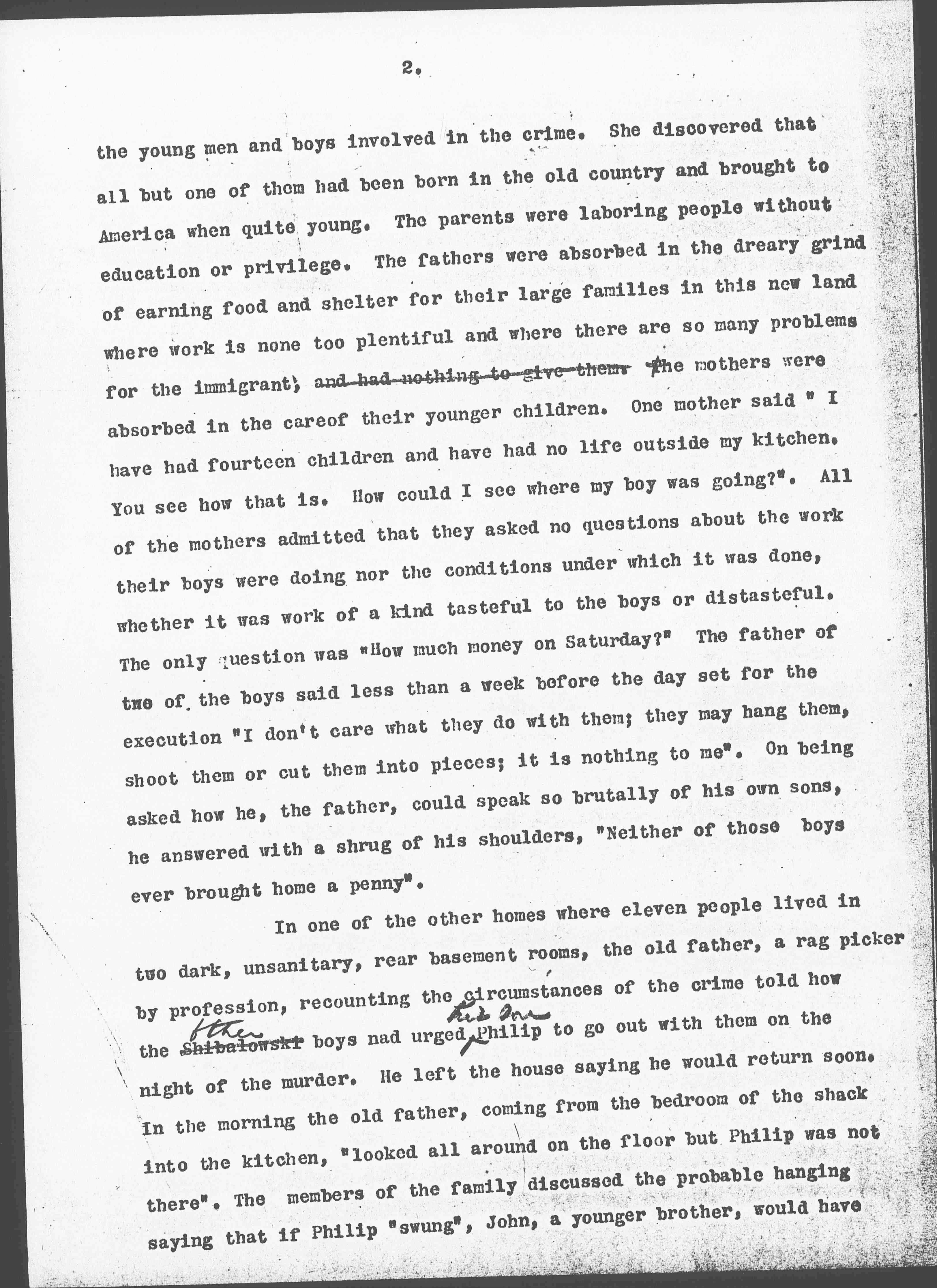At the time, however, the whole subject of the "Juvenile Adult Offender" -- a phrase borrowed from the English to designate offenders between the ages of 17 and 21 -- came up for the discussion in Chicago and many conditions were discovered which stirred a careless city to a new sense of compassion. Among these findings were those of an experienced settlement worker who visited the homes of all of [page 2] the young men and boys involved in the crime. She discovered that all but one of them had been born in the old country and brought to America when quite young. The parents were laboring people without education or privilege. The fathers were absorbed in the dreary grind of earning food and shelter for their large families in this new land where work is none too plentiful and where there are so many problems for the immigrant; and had nothing to give them. the mothers were absorbed in the care of their younger children. One mother said "I have had fourteen children and have had no life outside my kitchen. You see how that is. How could I see where my boy was going?" All of the mothers admitted that they asked no questions about the work their boys were doing nor the conditions under which it was done, whether it was work of a kind tasteful to the boys or distasteful. The only question was "How much money on Saturday?" The father of two of the boys said less than a week before the day set for the execution "I don't care what they do with them; they may hang them, shoot them or cut them into pieces; it is nothing to me." On being asked how he, the father, could speak so brutally of his own sons, he answered with a shrug of his shoulders, "Neither of those boys ever brought home a penny."