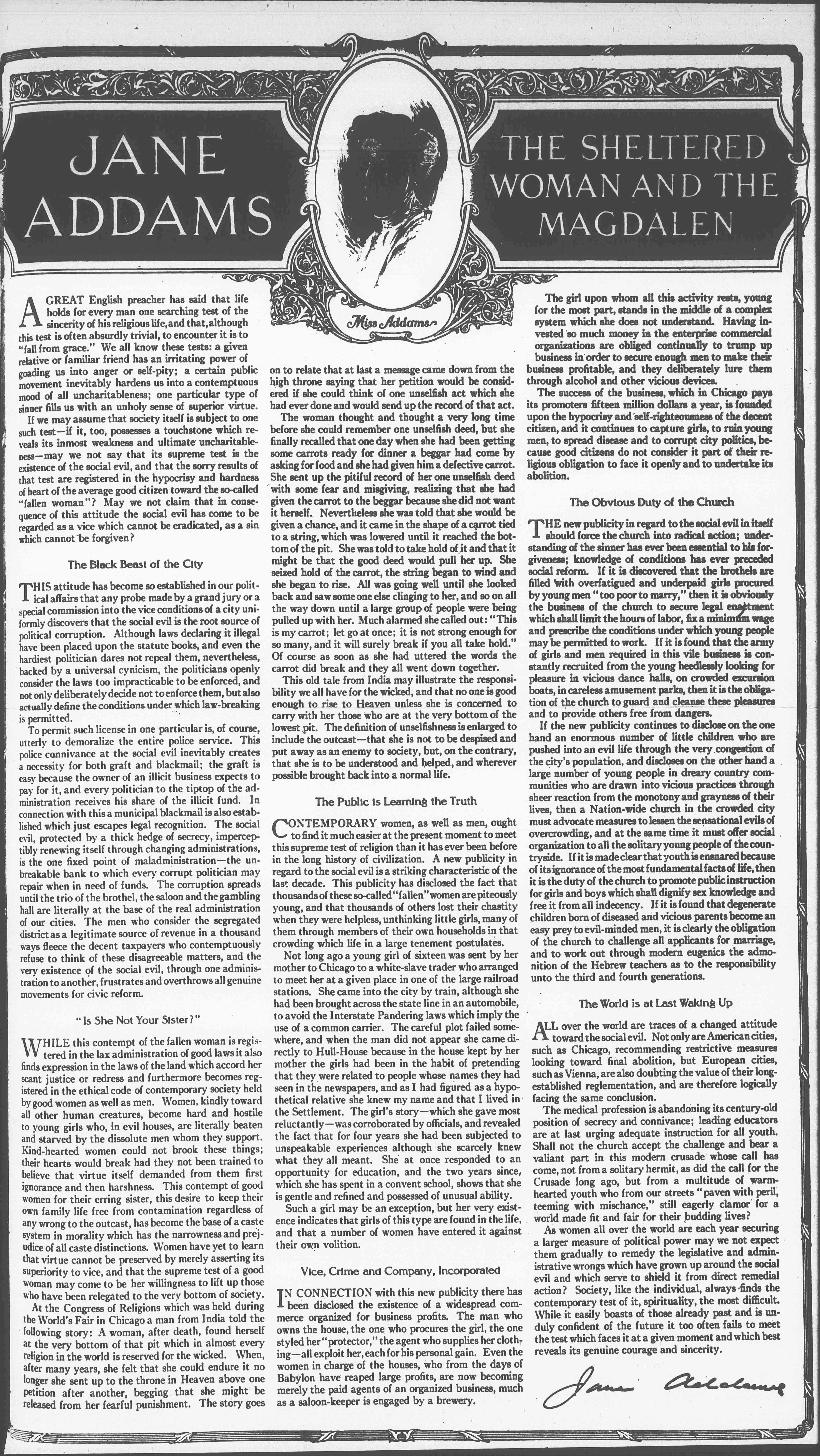THE new publicity in regard to the social evil in itself should force the church into radical action; understanding of the sinner has ever been essential to his forgiveness; knowledge of conditions has ever preceded social reform. If it is discovered that the brothels are filled with [over-fatigued] and underpaid girls procured by young men "too poor to marry," then it is obviously the business of the church to secure legal enactment which shall limit the hours of labor, fix a minimum wage and prescribe the conditions under which young people may be permitted to work. If it is found that the army of girls and men required in this vile business is constantly recruited from the young heedlessly looking for pleasure in vicious dance halls, on crowded excursion boats, in careless amusement parks, then it is the obligation of the church to guard and cleanse these pleasures and to provide others free from dangers.