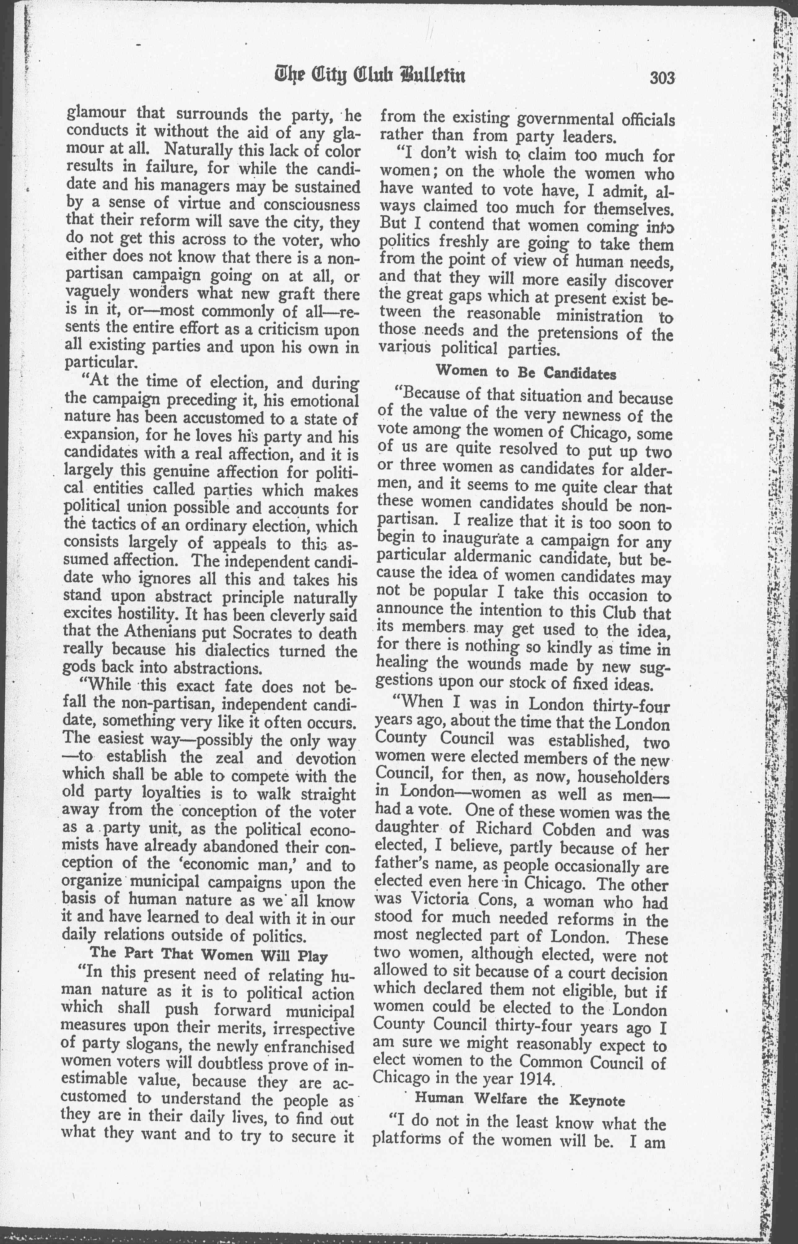 "I take it that I have been asked to participate in this discussion largely because the women of Illinois have a vote in municipal affairs. While I have no possible right to speak for any woman's vote but my own, I think I am quite justified in saying that the sentiment among the majority of the women with whom I have talked ever since the good news came that we possessed the vote, has been in favor of non-partisanship in municipal affairs and in the election of alderman. This is not for theoretical reasons but simply because for so long a time women have studied municipal matters from the point of view of municipal needs and not from the point of view of party success, that it is quite impossible for them to change that viewpoint all at once.