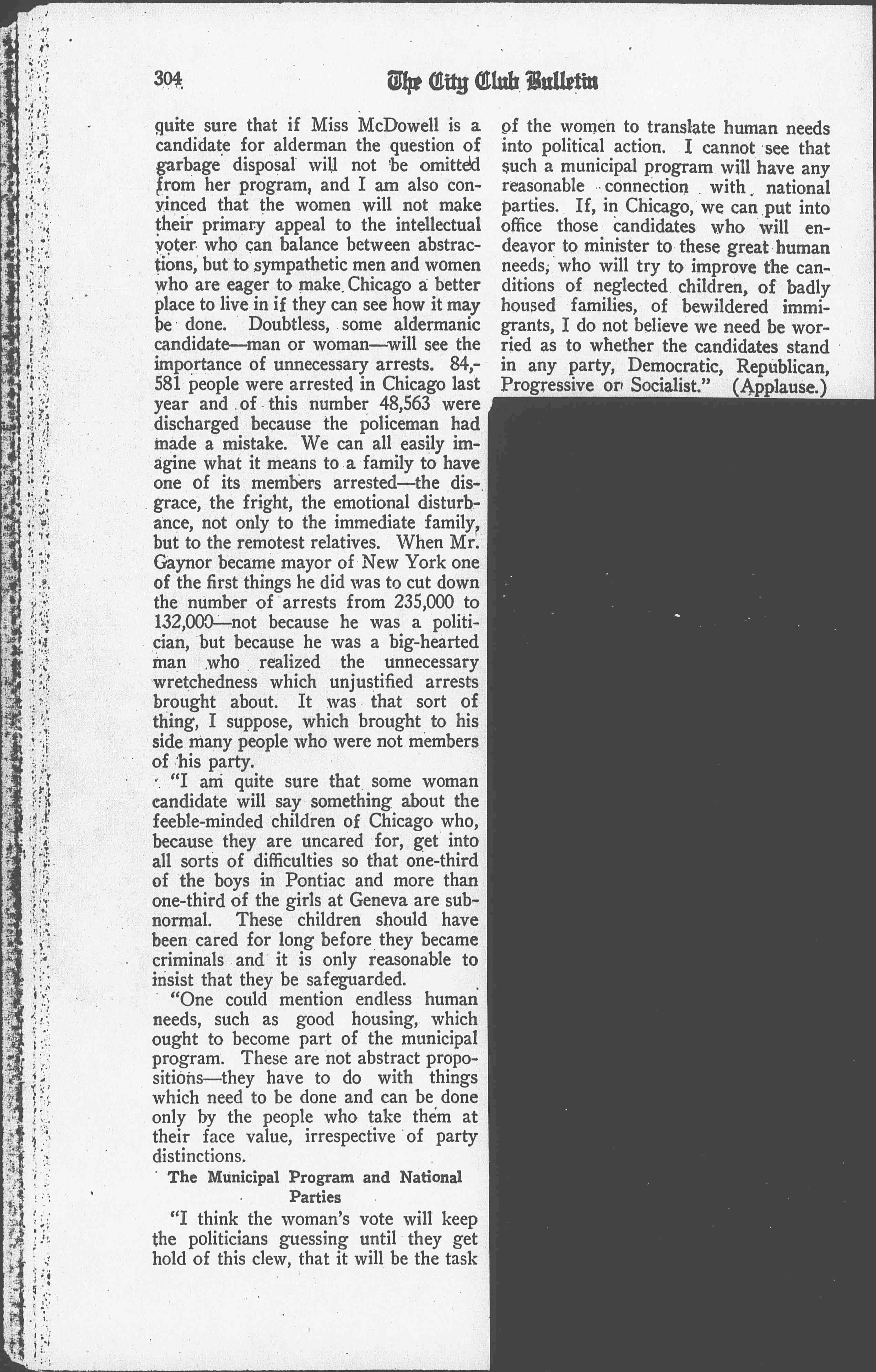 "I do not in the least know what the platforms of the women will be. I am [page 4] quite sure that if Miss McDowell is a candidate for alderman the question of garbage disposal will not be omitted from her program, and I am also convinced that the women will not make their primary appeal to the intellectual voter who can balance between abstractions, but to sympathetic men and women who are eager to make Chicago a better place to live in if they can see how it may be done. Doubtless, some aldermanic candidate -- man or woman -- will see the importance of unnecessary arrests. 84,581 people were arrested in Chicago last year and of this number 48,563 were discharged because the policeman had made a mistake. We can all easily imagine what it means to a family to have one of its members arrested -- the disgrace, the fright, the emotional disturbance, not only to the immediate family, but to the remotest relatives. When Mr. Gaynor became mayor of New York one of the first things he did was to cut down the number of arrests from 235,000 to 132,000 -- not because he was a politician, but because he was a big-hearted man who realized the unnecessary wretchedness which unjustified arrests brought about. It was that sort of thing, I suppose, which brought to his side many people who were not members of his party.