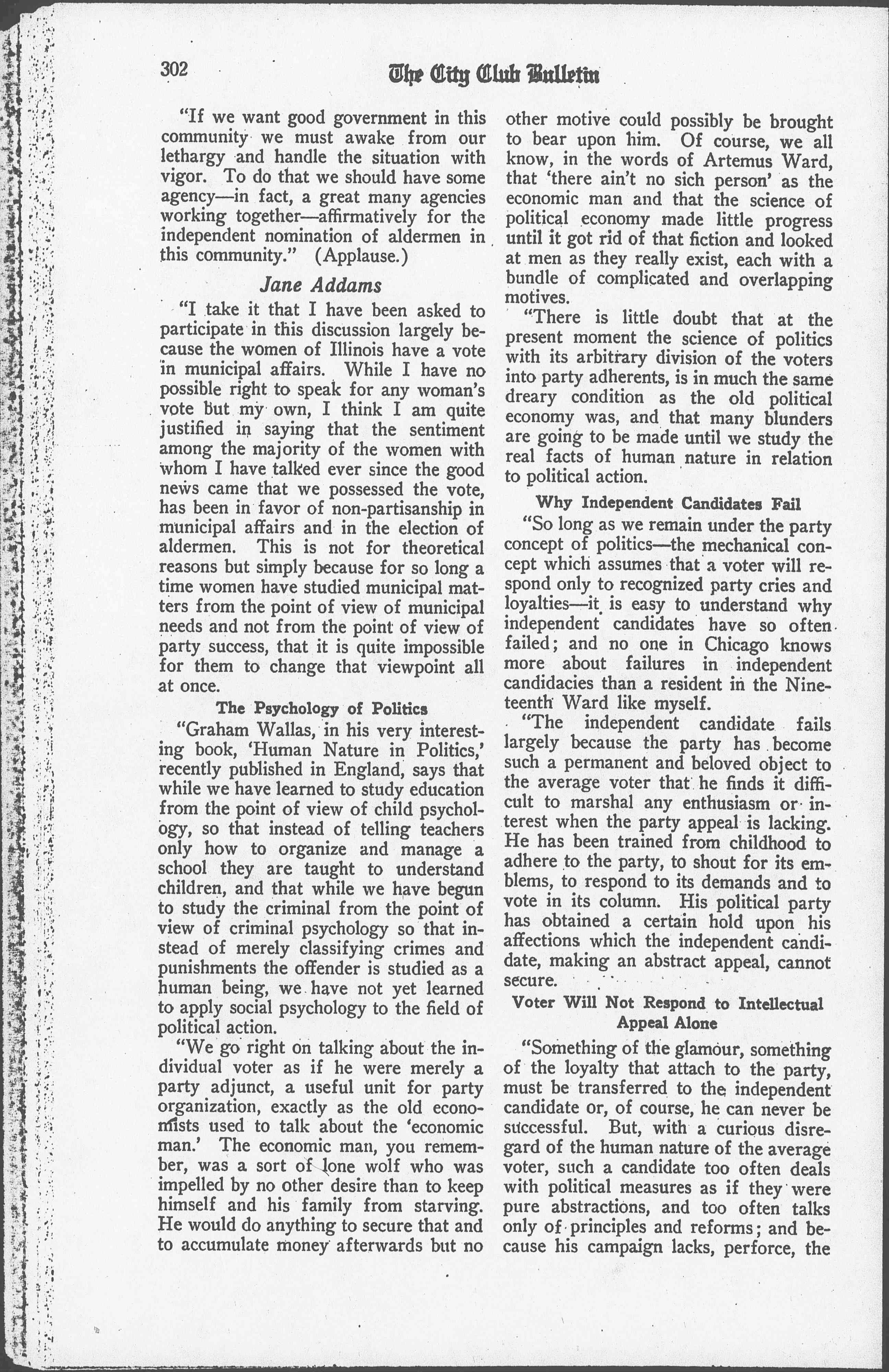 "I think the woman's vote will keep the politicians guessing until they get hold of this clew, that it will be the task of the women to translate human needs into political action. I cannot see that such a municipal program will have any reasonable connection with national parties. If, in Chicago, we can put into office those candidates who will endeavor to minister to these great human needs, who will try to improve the conditions of neglected children, of badly housed families, of bewildered immigrants, I do not believe we need be worried as to whether the candidates stand in any party, Democratic, Republican, Progressive or Socialist." (Applause.)