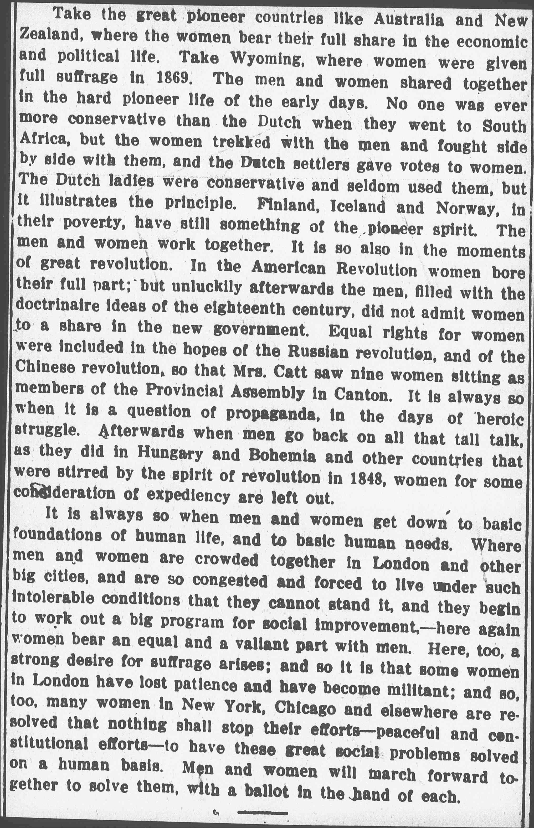 Take the great pioneer countries like Australia and New Zealand, where the women bear their full share in the economic and political life. Take Wyoming, where women were given full suffrage in 1869. The men and women shared together in the hard pioneer life of the early days. No one was ever more conservative than the Dutch when they went to South Africa, but the women trekked with the men and fought side by side with them, and the Dutch settlers gave votes to women. The Dutch ladies were conservative and seldom used them, but it illustrates the principle. Finland, Iceland and Norway, in their poverty, have still something of the pioneer spirit. The men and women work together. It is so also in the moments of great revolution. In the American Revolution women bore their full part; but unluckily afterwards the men, filled with the doctrinaire ideas of the eighteenth century, did not admit women to a share in the new government. Equal rights for women were included in the hopes of the Russian revolution, and of the Chinese revolution, so that Mrs. Catt saw nine women sitting as members of the Provincial Assembly in Canton. It is always so when it is a question of propaganda, in the days of heroic struggle. Afterwards when men go back on all that tall talk, as they did in Hungary and Bohemia and other countries that were stirred by the spirit of revolution in 1848, women for some consideration of expediency are left out.