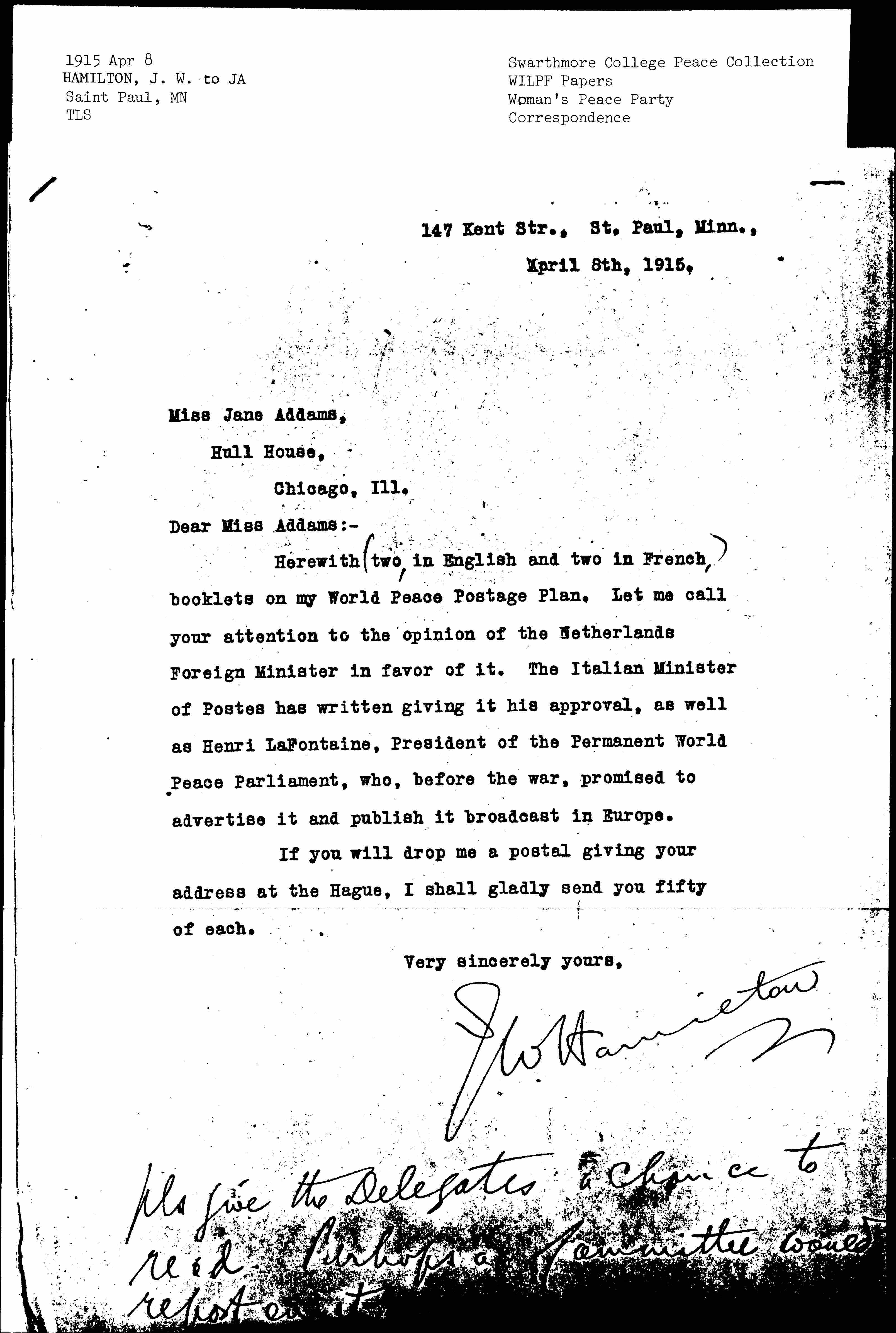 Herewith (two in English and two in French) booklets on my World Peace Postage Plan. Let me call your attention to the opinion of the Netherlands Foreign Minister in favor of it. The Italian Minister of Postes has written giving it his approval, as well as Henri La Fontaine, President of the Permanent World Peace Parliament, who, before the war, promised to advertise it and publish it broadcast in Europe.