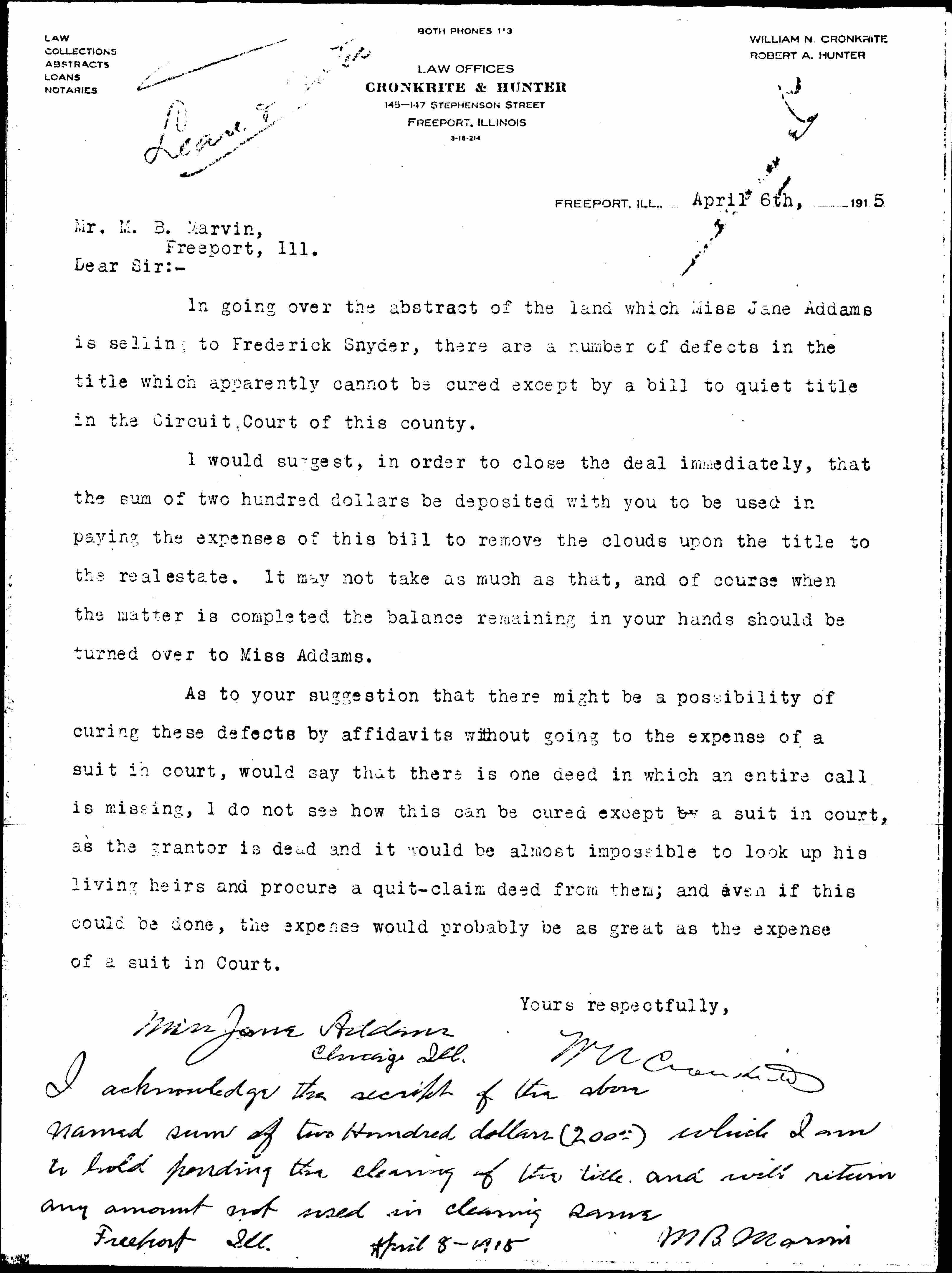 I acknowledge the receipt of the above named sum of two Hundred dollars ([200.00]) which I am to hold pending the clearing of the title and will return any amount not used in clearing same