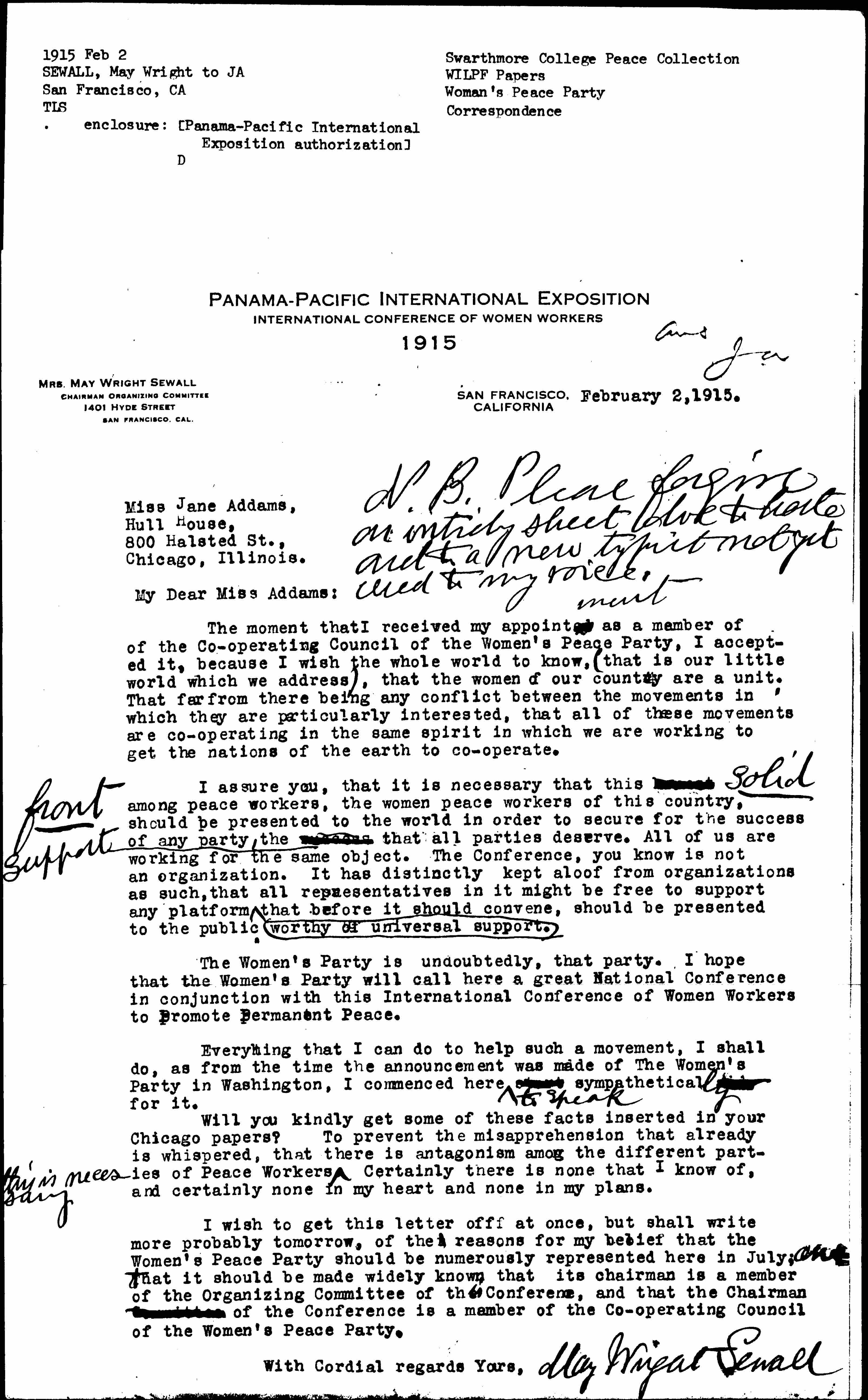 I assure you, that it is necessary that this [illegible] <solid front> among peace workers, the women peace workers of this country, should be presented to the world in order to secure for the success of any party, the <support> [illegible] that all parties deserve. All of us are working for the same object. The Conference, you know is not an organization. It has distinctly kept aloof from organizations as such, that all representatives in it might be free to support any platform worthy of universal support that before it should convene, should be presented to the public.