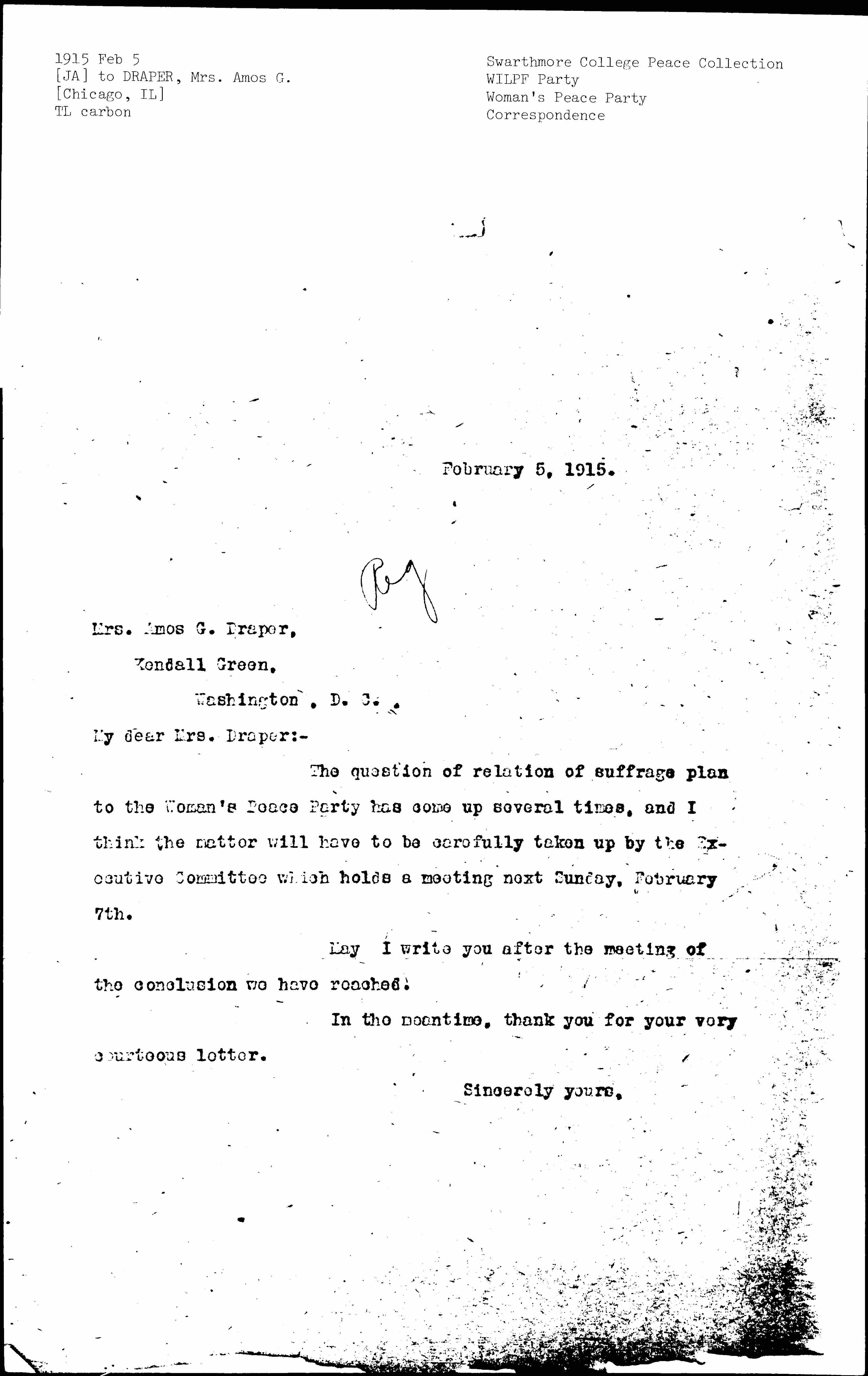 The question of relation of suffrage plan to the Woman's Peace Party has come up several times, and I think the matter will have to be carefully taken up by the Executive Committee which holds a meeting next Sunday, February 7th.