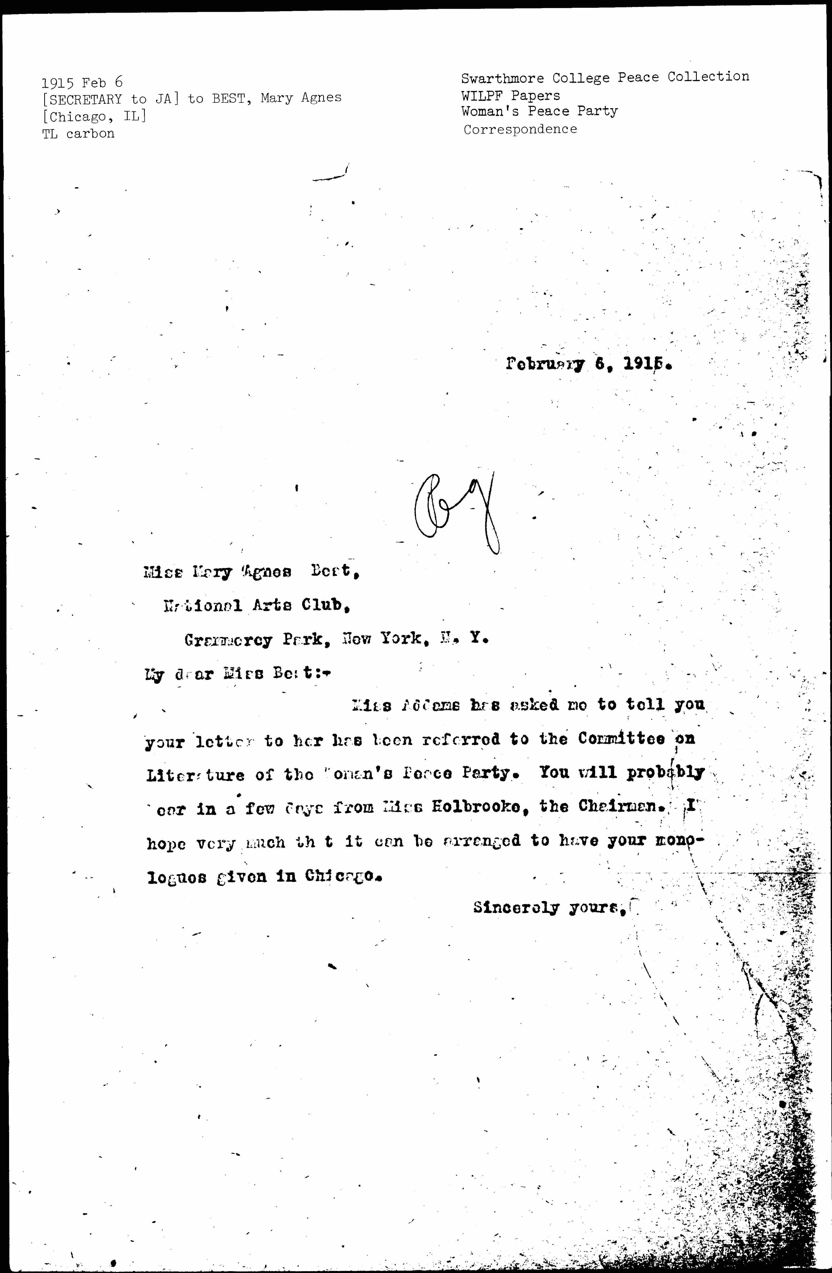 Miss Addams has asked me to tell you your letter to her has been referred to the Committee on Literature of the Woman's Peace Party. You will probably hear in a few days from Miss [Holbrook], the Chairman. I hope very much that it can be arranged to have your monologues given in Chicago.