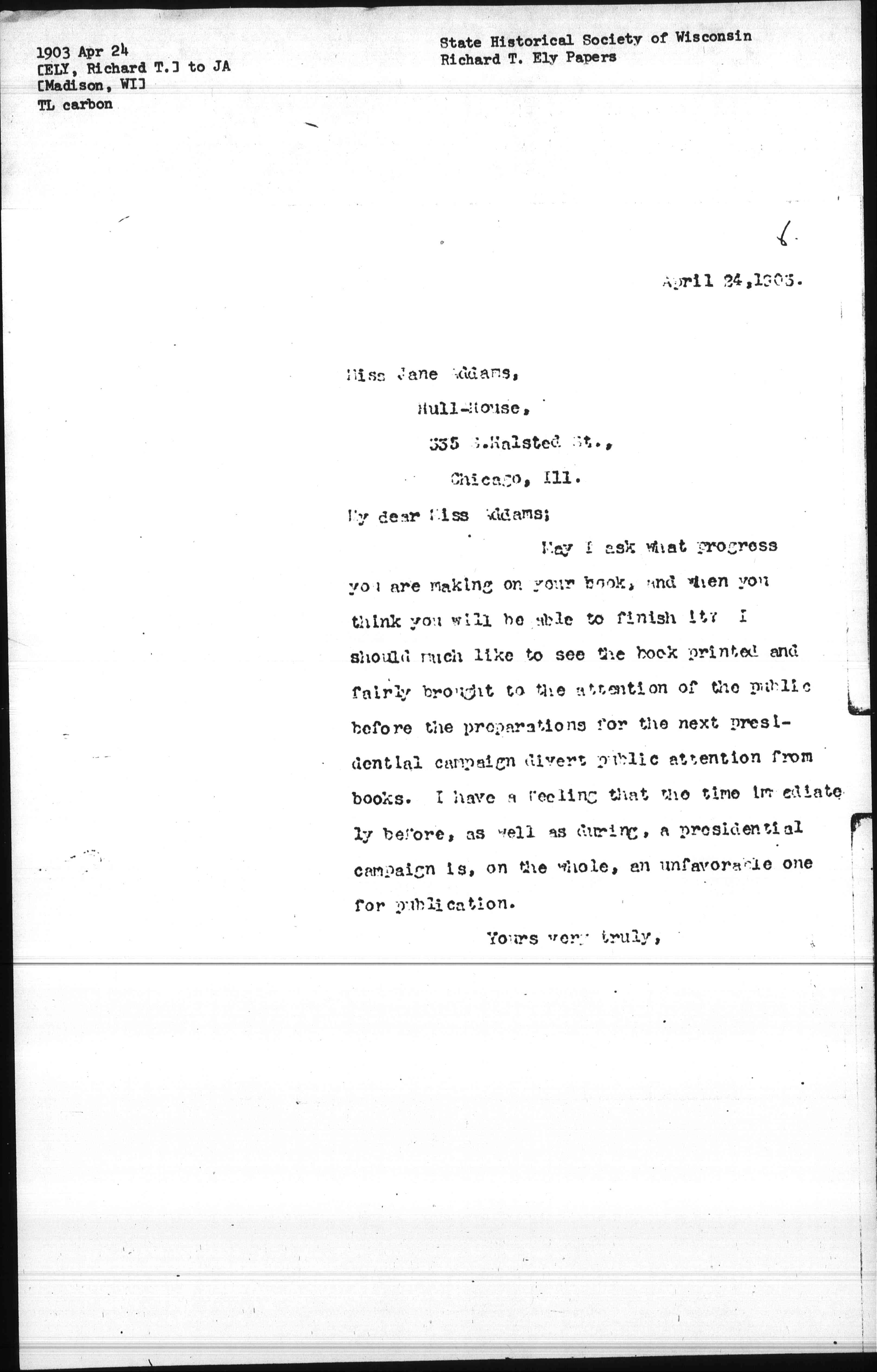 May I ask what progress you are making on your book, and when you think you will be able to finish it? I should much like to see the book printed and fairly brought to the attention of the public before the preparations for the next presidential campaign divert public attention from books. I have a feeling that the time immediately before, as well as during, a presidential campaign is, on the whole, an unfavorable one for publication.
