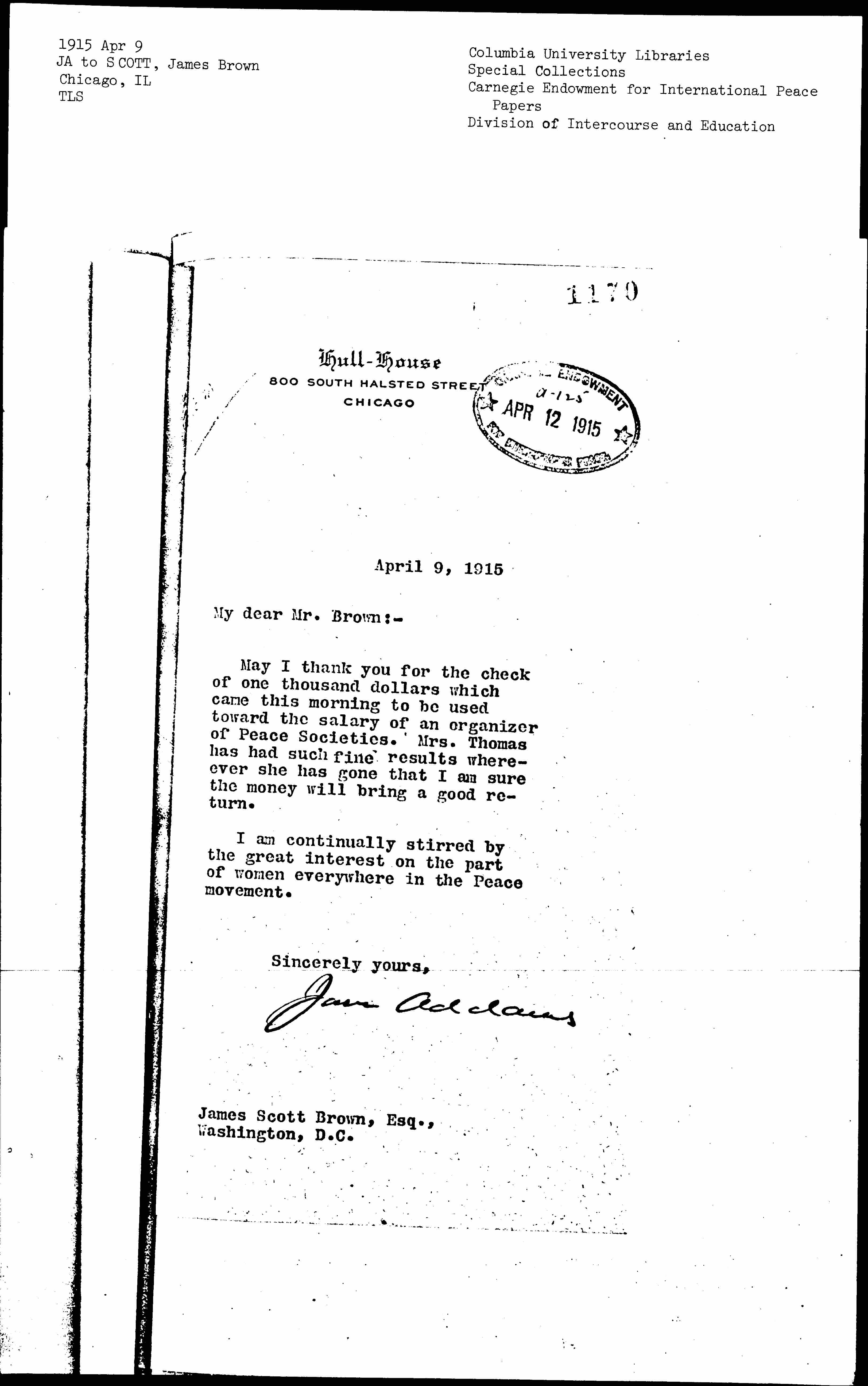 May I thank you for the check of one thousand dollars which came this morning to be used toward the salary of an organizer of Peace Societies. Mrs. Thomas has had such fine results wherever she has gone that I am sure the money will bring a good return.