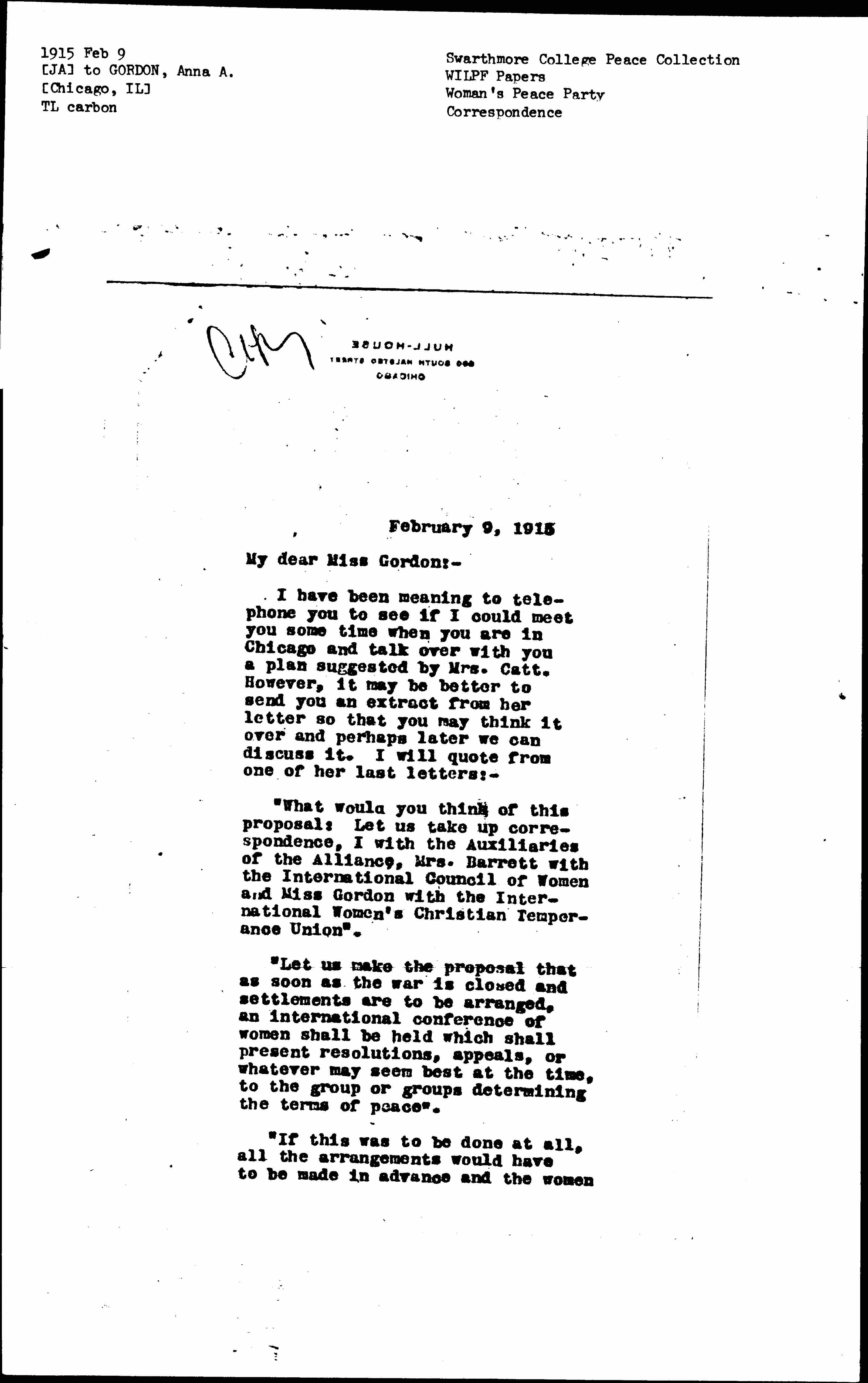 "If this was to be done at all, all the arrangements would have to be made in advance and the women [page 2] of the different countries would have to give their approval. I doubt very much if we can get word or delegates from many of them, but we ought to be able to gather the women from the chief of the warring countries. This looks to me to be more satisfactory than to attempt any international action at this time. If, meanwhile, we have developed our own American Woman's Peace Party to a status of real influence, it would go far as an international power. In any event, I am going to propose this as a tentative plan to the National Union of Great Britain. It would be only a private proposal".