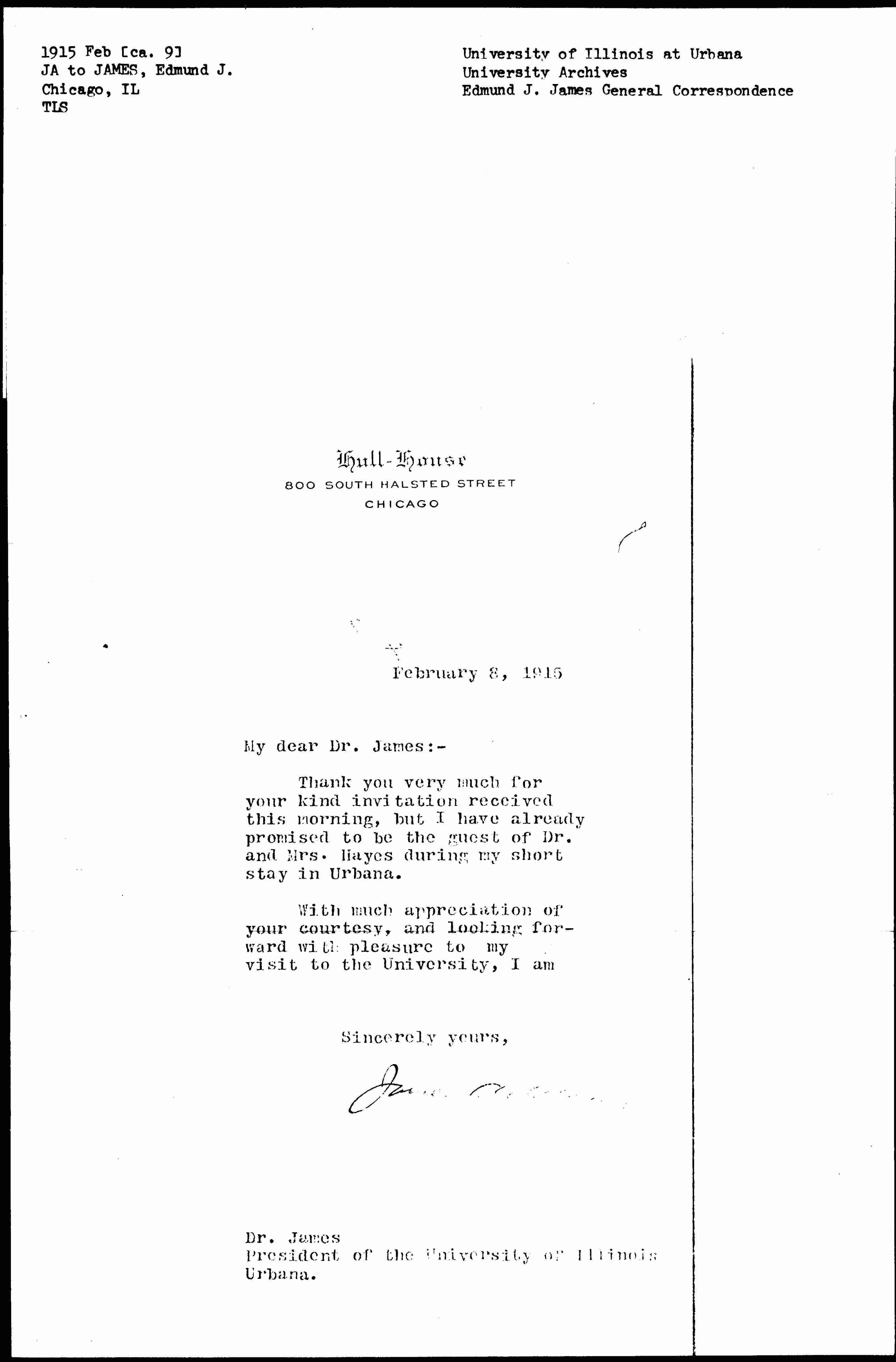 Thank you very much for your kind invitation received this morning, but I have already promised to be the guest of Dr. and Mrs. Hayes during my short stay in Urbana.
