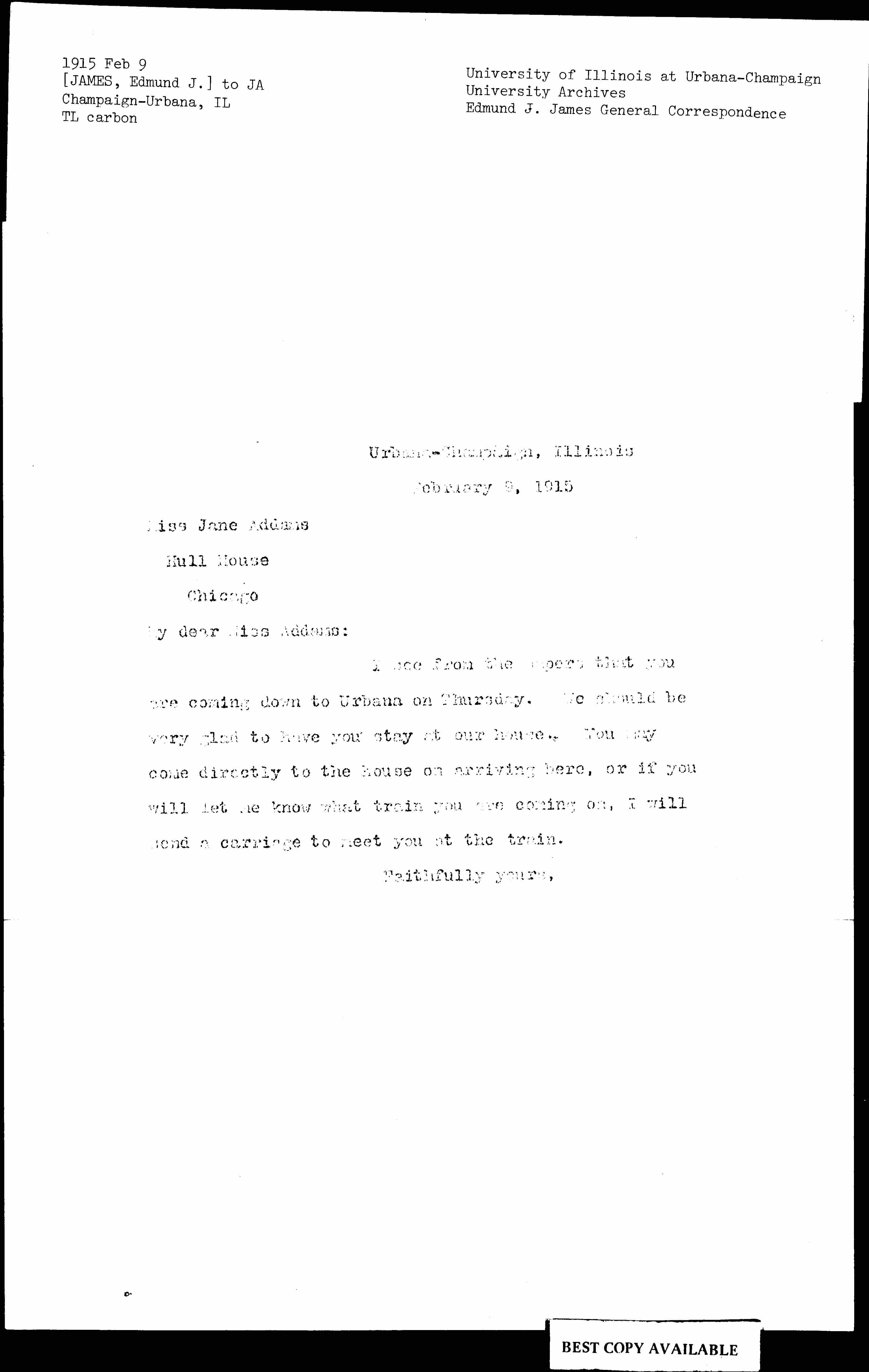 I see from the papers that you are coming down to Urbana on Thursday. We should be very glad to have you stay at our house. You may come directly to the house on arriving here, or if you will let me know what train you are coming on, I will send a carriage to meet you at the train.
