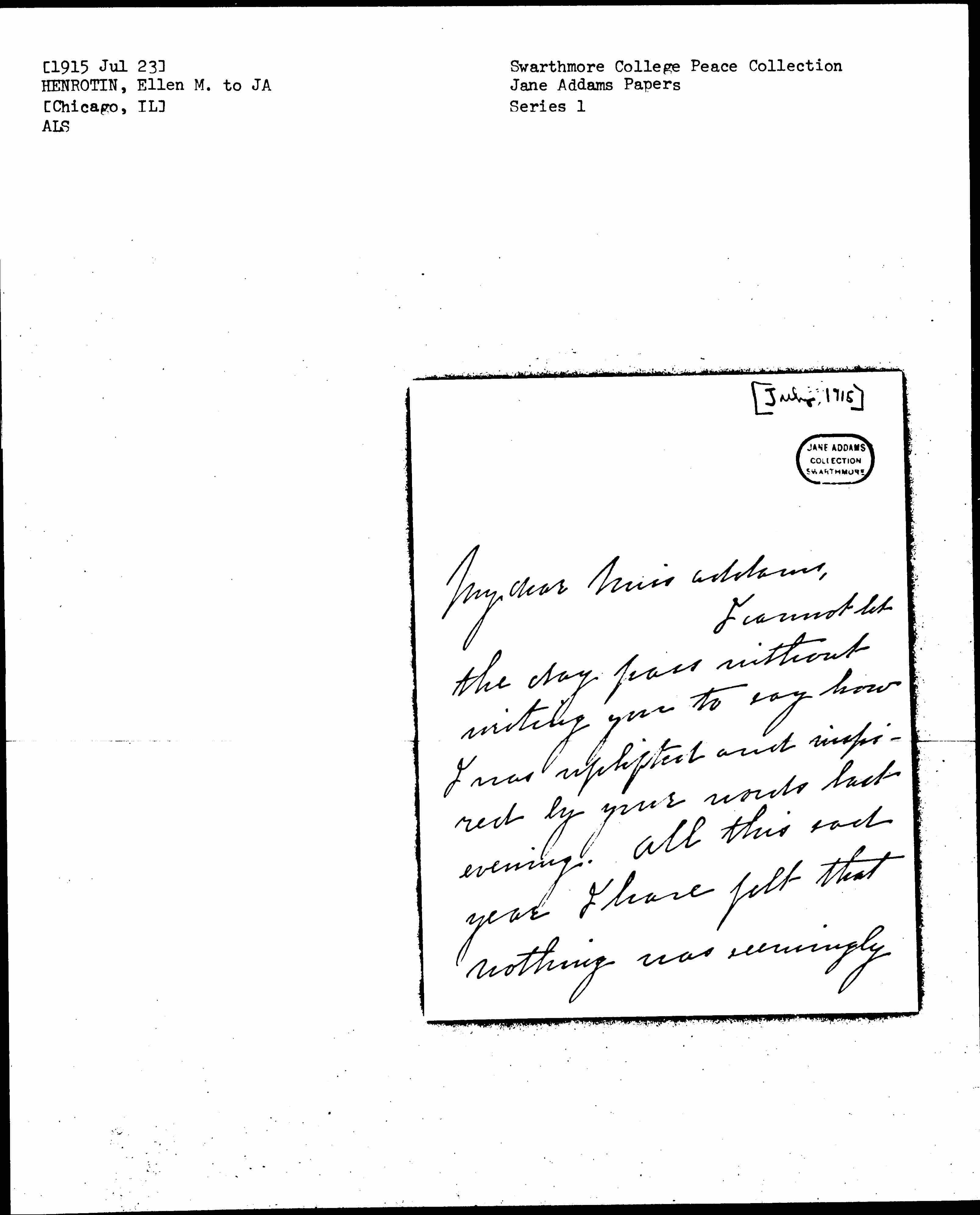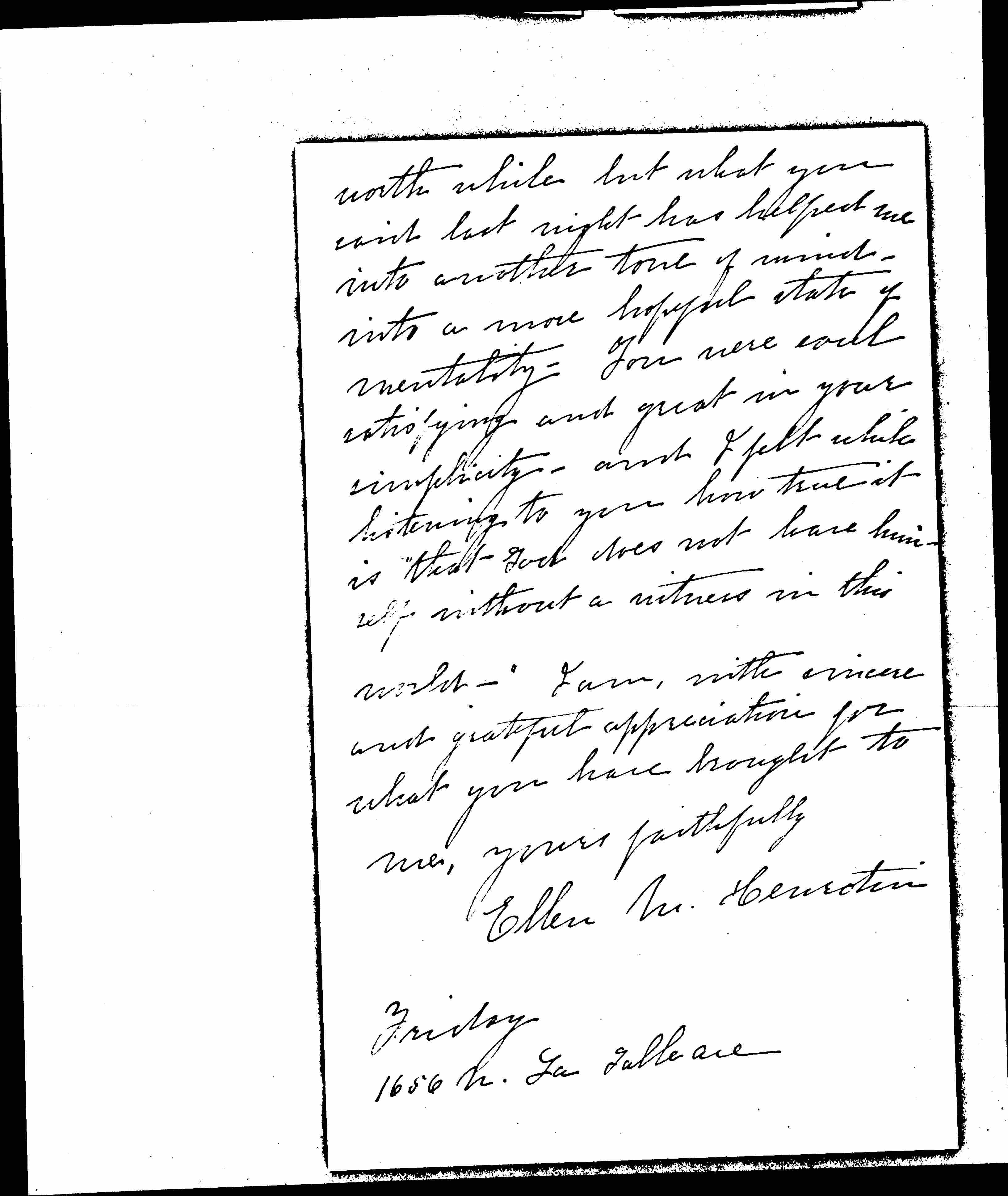 I cannot let the day pass without writing you to say how I was uplifted and inspired by your words last evening. All this sad year I have felt that nothing was seemingly [page 2] [worthwhile] but what you said last night has helped me into another tone of mind -- into a more hopeful state of mentality. You were soul satisfying and great in your simplicity, and I felt while listening to you how true it is "that God does not leave himself without a witness in this world."