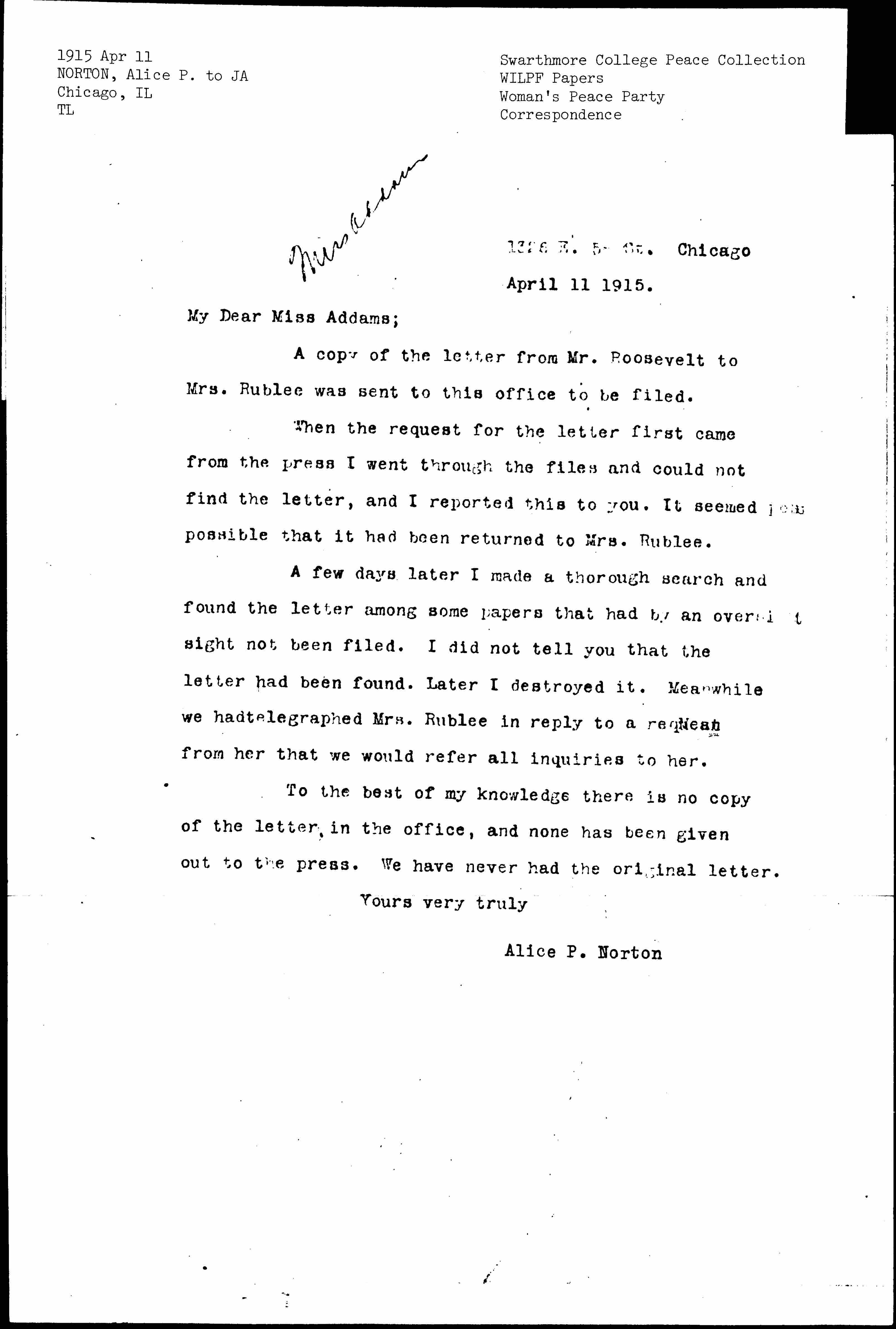 A few days later I made a thorough search and found the letter among some papers that had by an oversight not been filed. I did not tell you that the letter had been found. Later I destroyed it. Meanwhile we had telegraphed Mrs. Rublee in reply to a request from her that we would refer all inquiries to her.