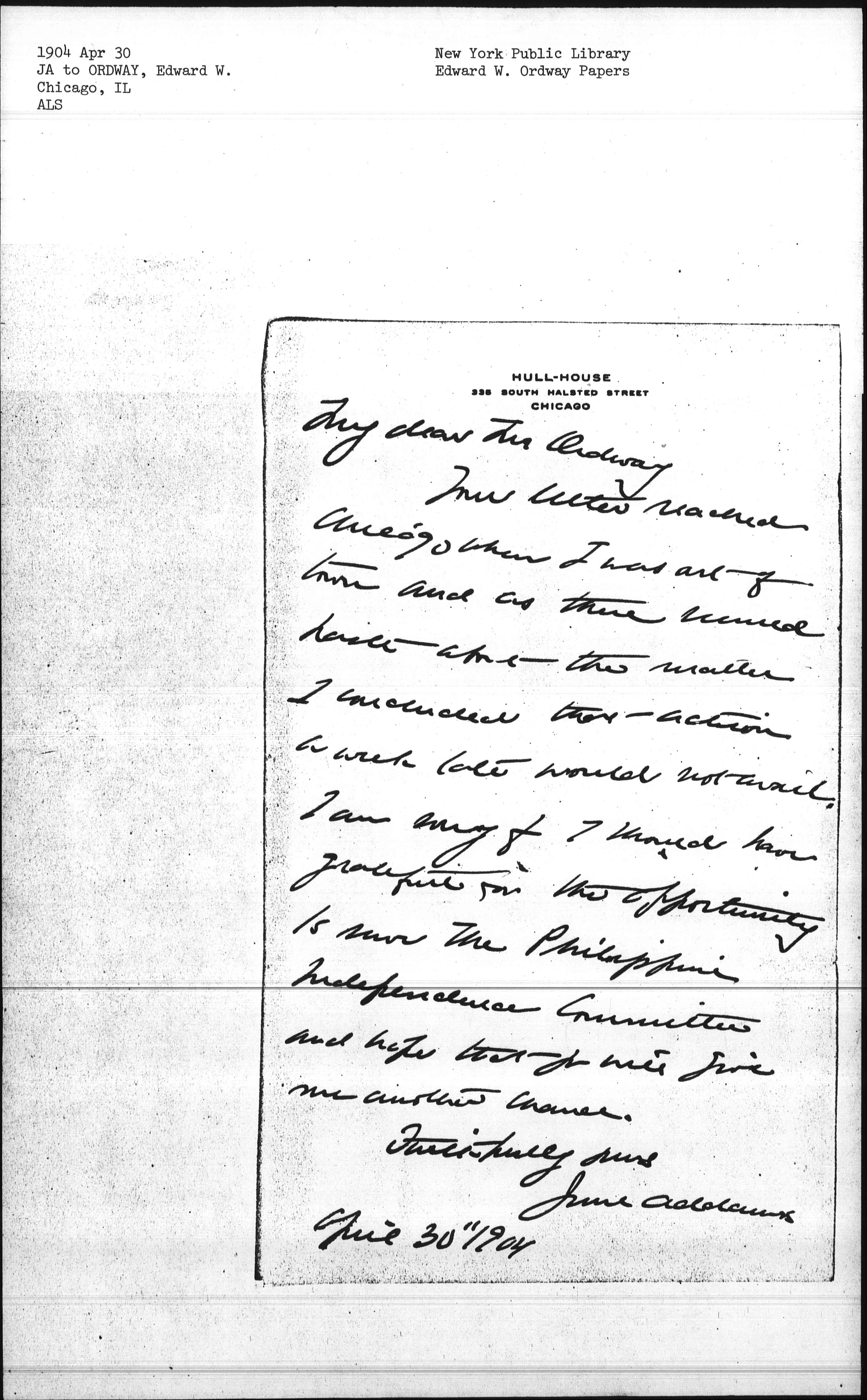 Your letter reached Chicago when I was out of town and as there seemed haste about the matter I concluded that action a week late would not avail. I am sorry for I should have grateful for the opportunity to save the Philippine Independence Committee and hope that you will give me another chance.