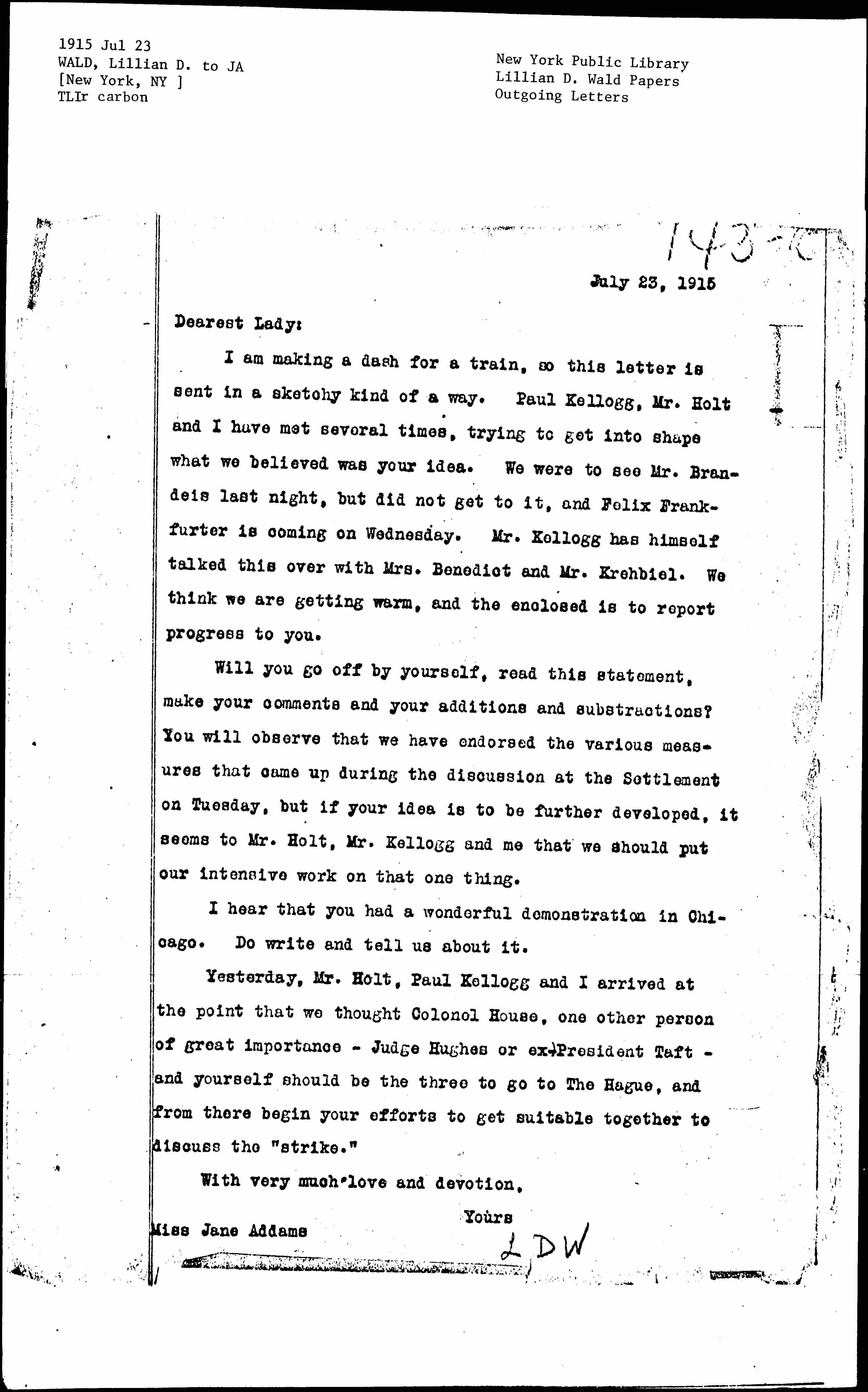 I am making a dash for a train, so this letter is sent in a sketchy kind of a way. Paul Kellogg, Mr. Holt and I have met several times, trying to get into shape what we believed was your idea. We were to see Mr. Brandeis last night, but did not get to it, and Felix Frankfurter is coming on Wednesday. Mr. Kellogg has himself talked this over with Mrs. Benedict and Mr. Krehbiel. We think we are getting warm, and the enclosed is to report progress to you.