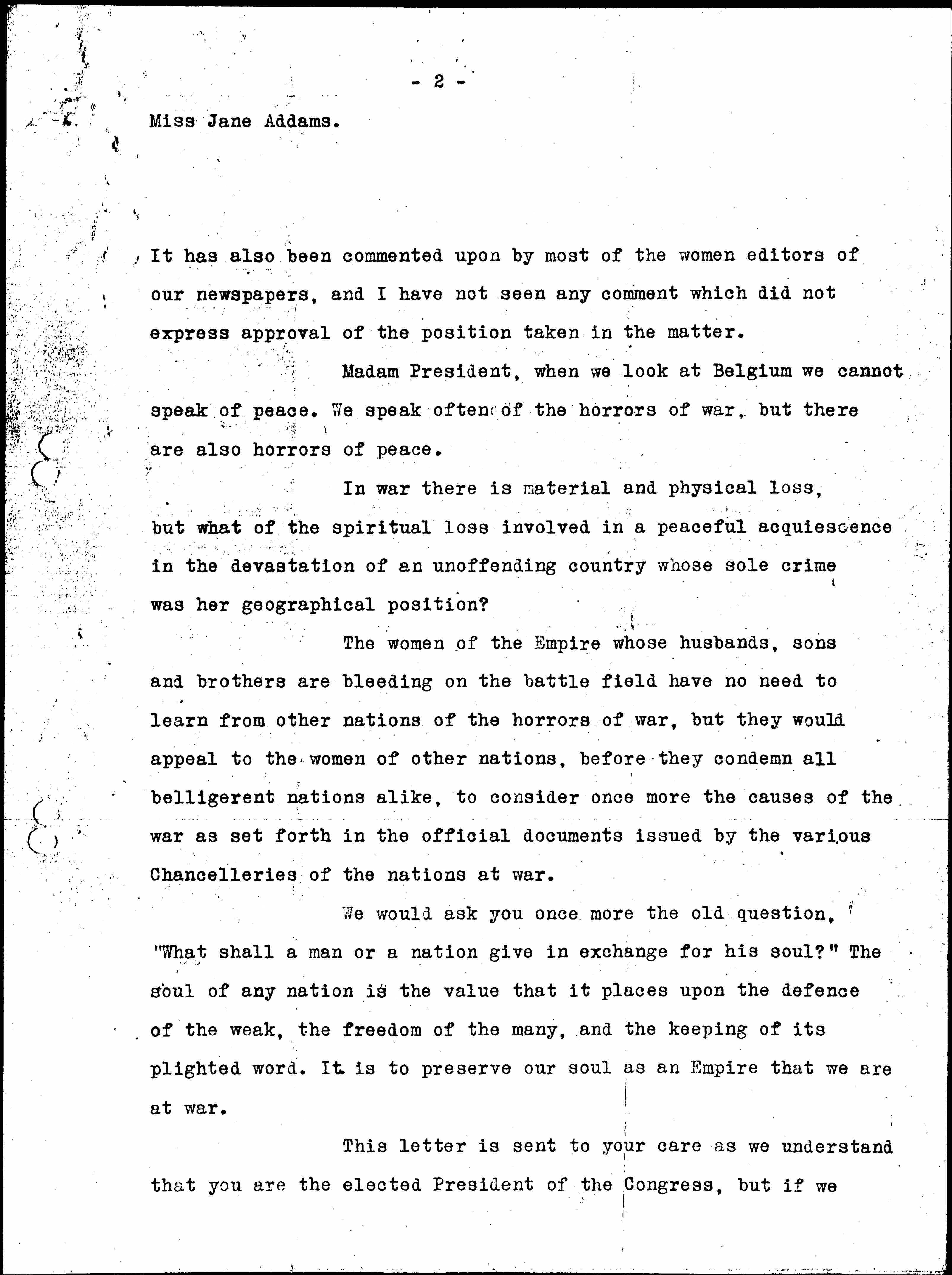 The enclosed Open Letter concerning Peace has been issued by thousands amongst the women of Canada, and we have received many resolutions endorsing the views therein expressed. [page 2]