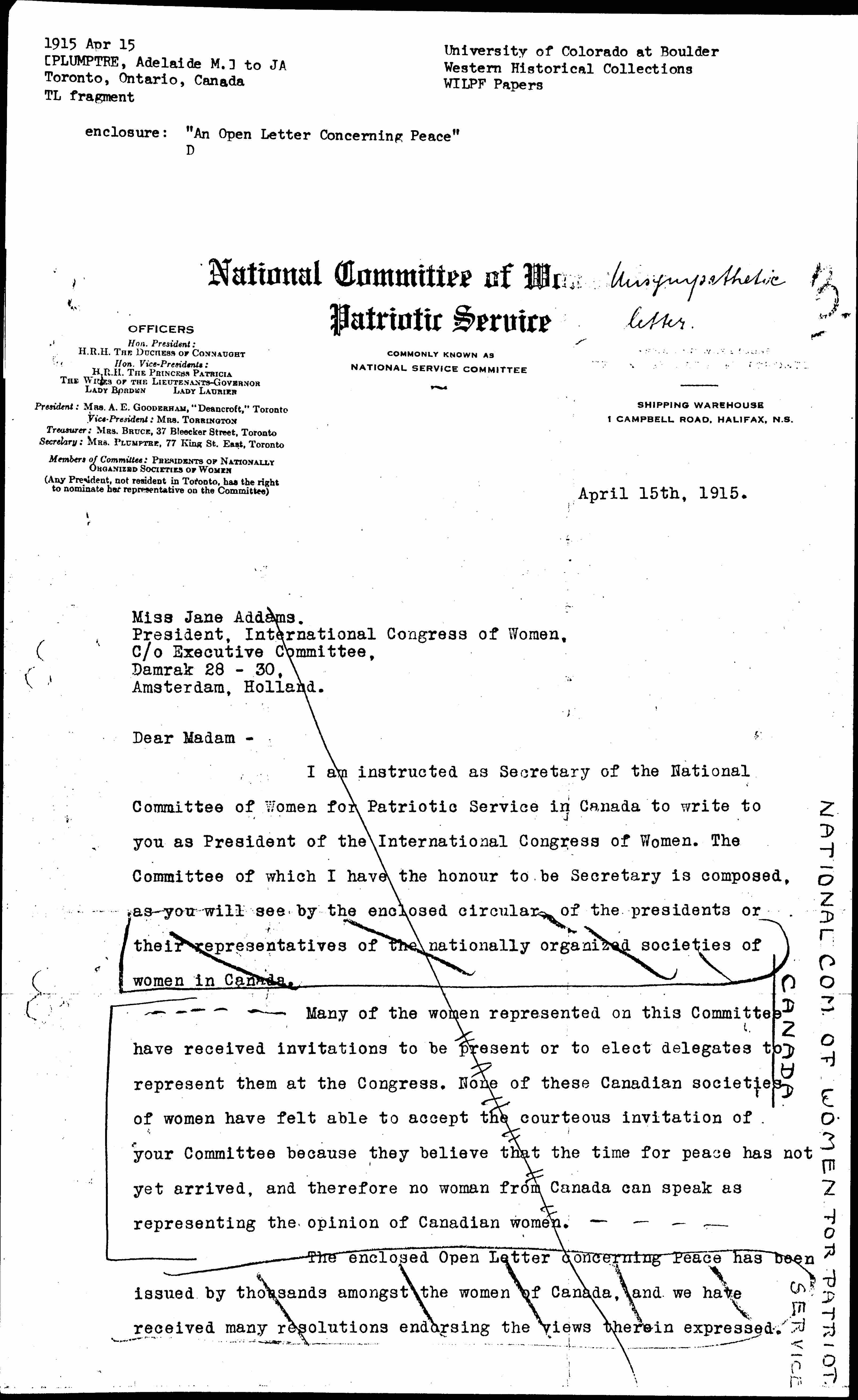 I am instructed as Secretary of the National Committee of Women for Patriotic Service in Canada to write to you as President of the International Congress of Women. The Committee of which I have the [honor] to be Secretary is composed, as you will see by the enclosed circular of the presidents or their representatives of the nationally organized societies of women in Canada.