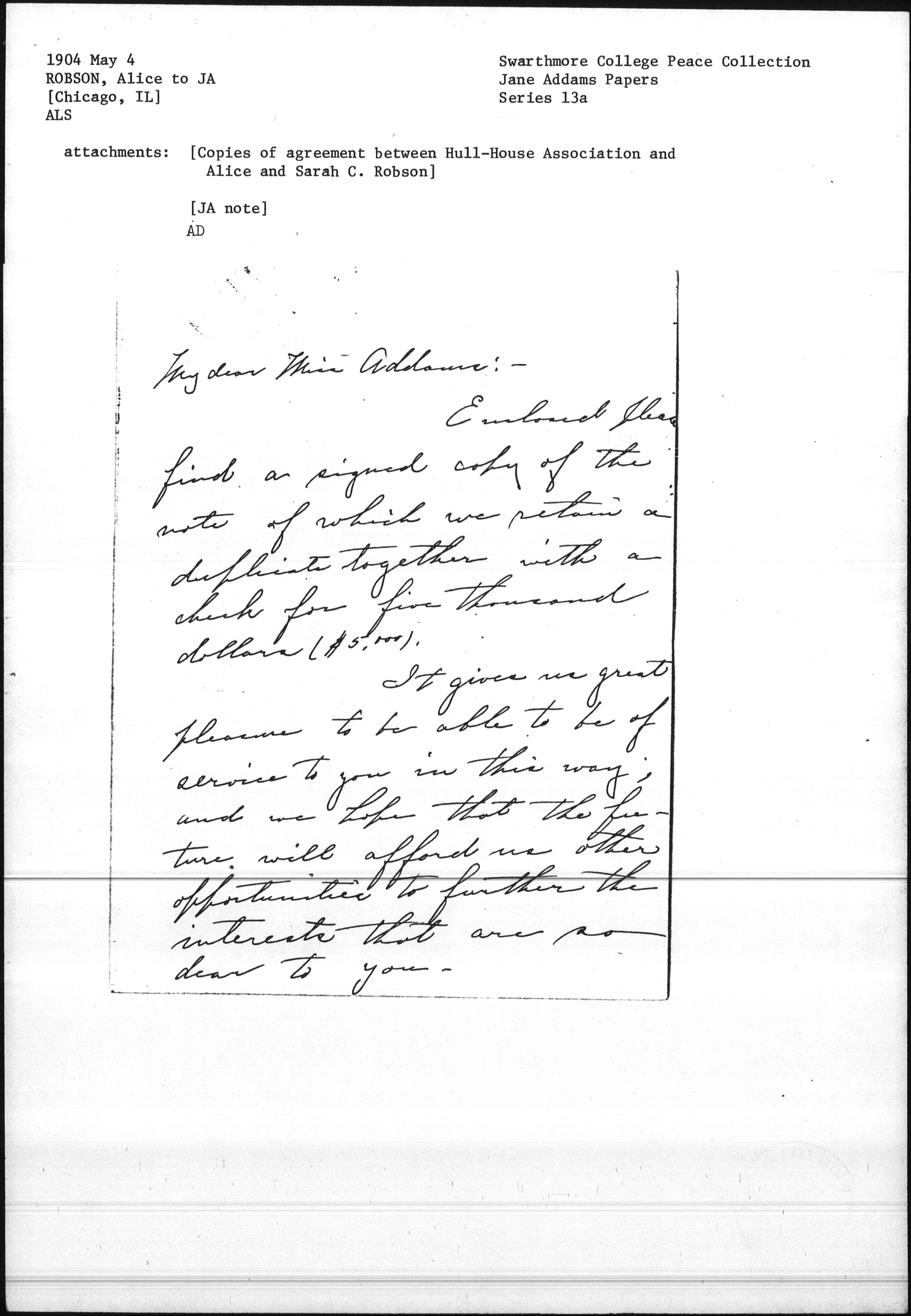 Enclosed please find a signed copy of the note of which we retain a duplicate together with a check for five thousand dollars ($5,000).
