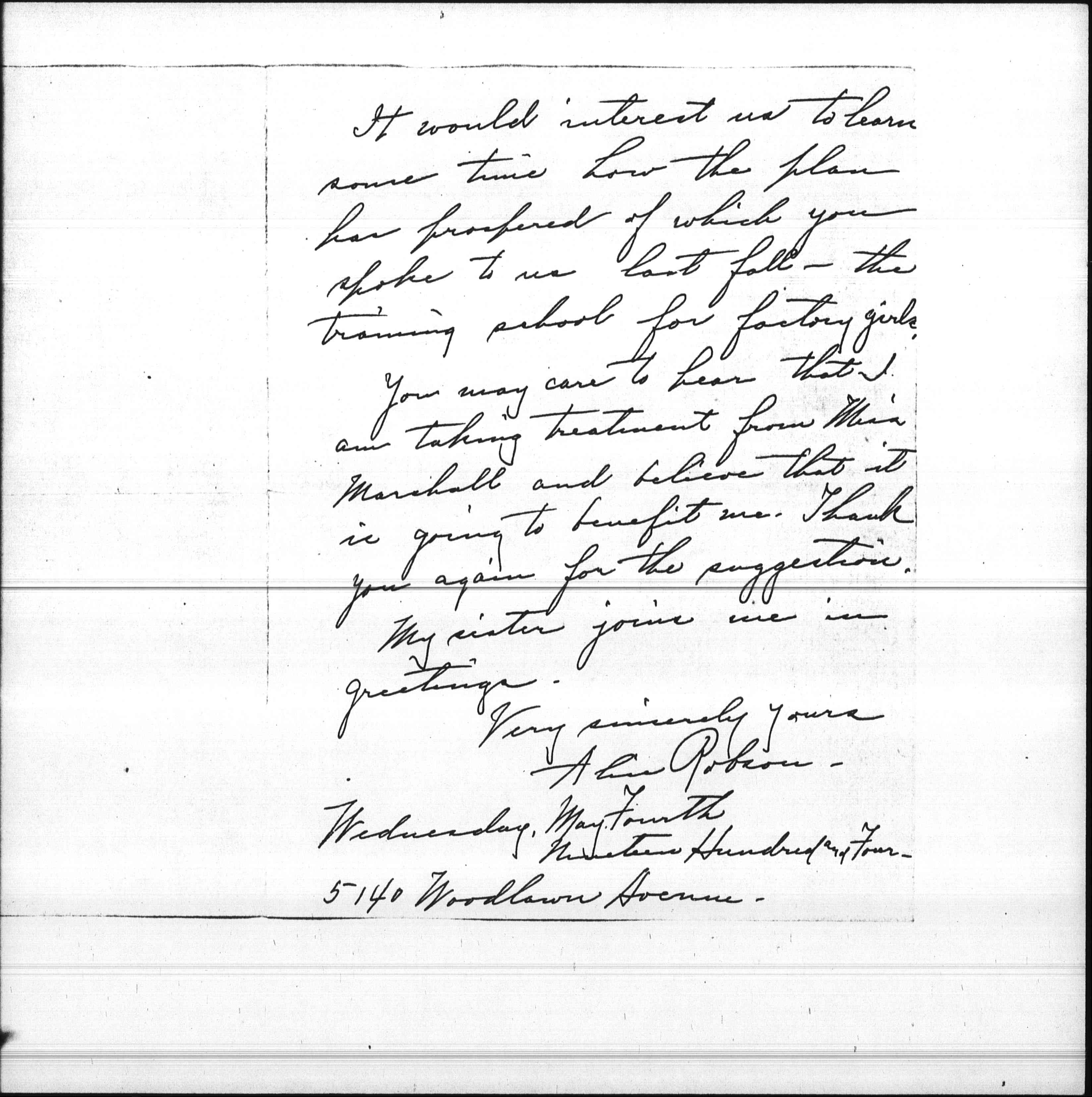 You may care to hear that I am taking treatment from Miss Marshall and believe that it is going to benefit me. Thank you again for the suggestion.