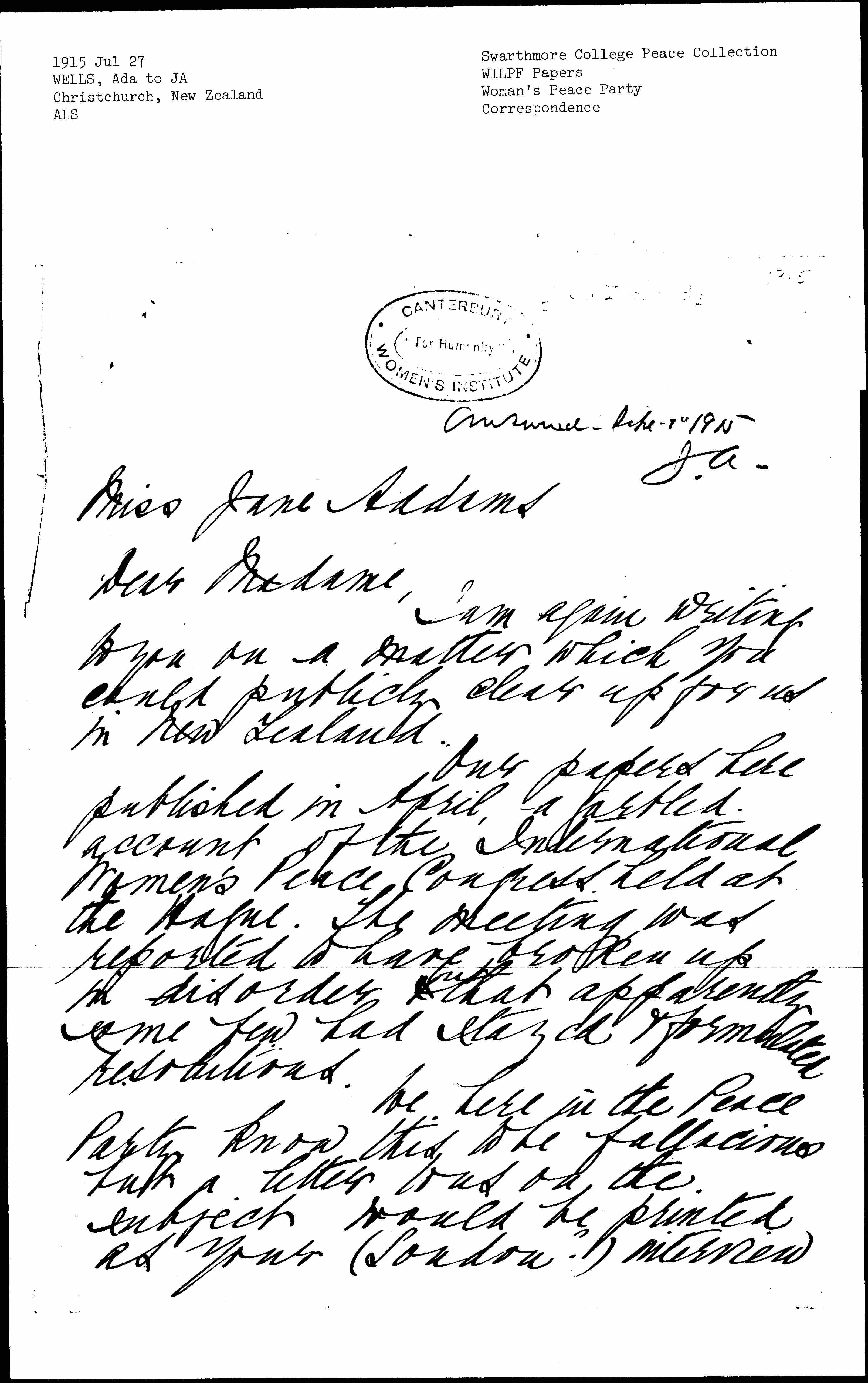 Our papers here published in April, a garbled account of the International Women's Peace Congress held at The Hague. The meeting was reported to have broken up in disorder & <but> that apparently some few had stayed & formulated resolutions.