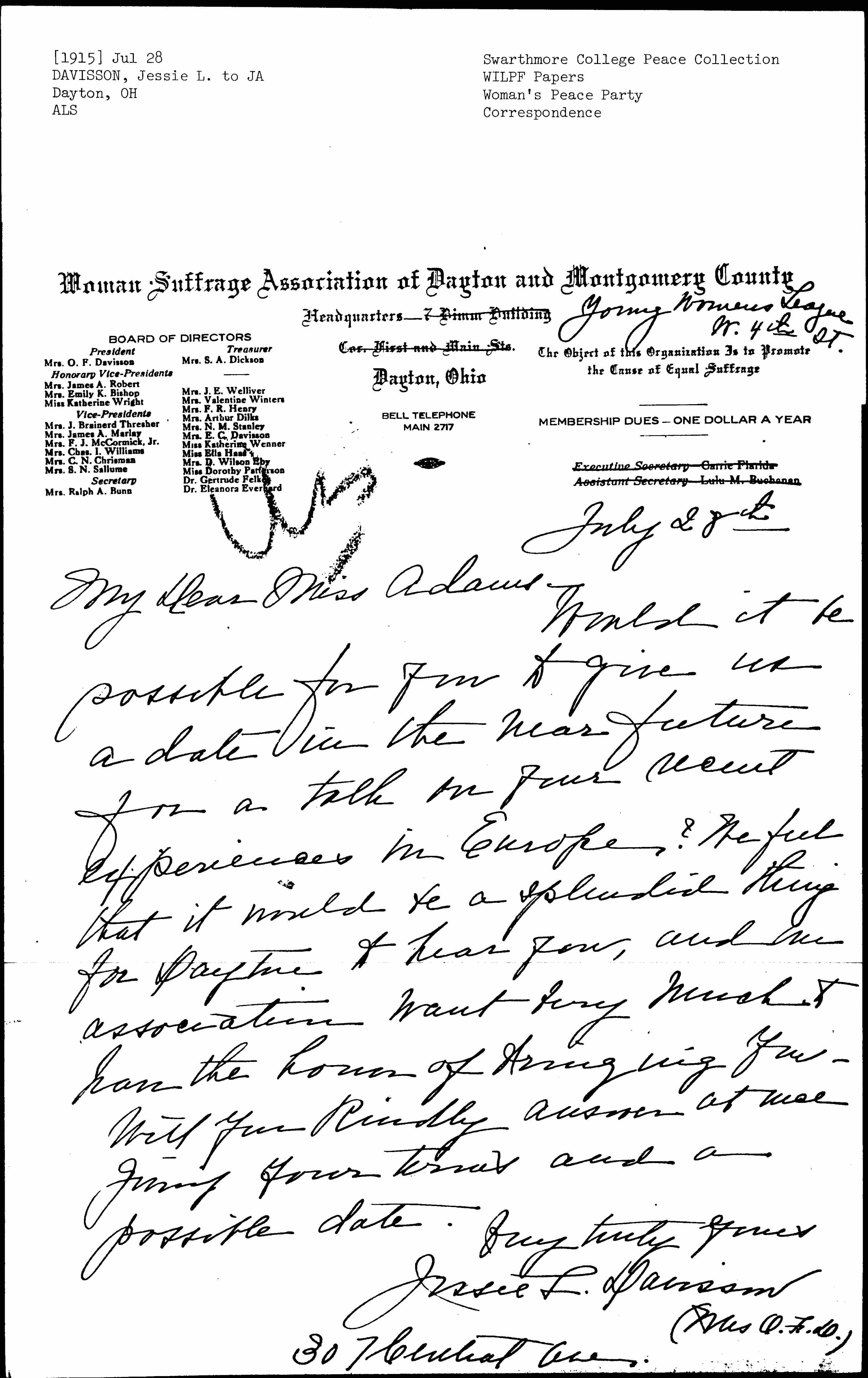 Would it be possible for you to give us a date in the near future for a talk on your recent experiences in Europe? We feel that it would be a splendid thing for Dayton to hear you, and our association want very much to have the honor of bringing you. Will you kindly answer at once giving your terms and a possible date.