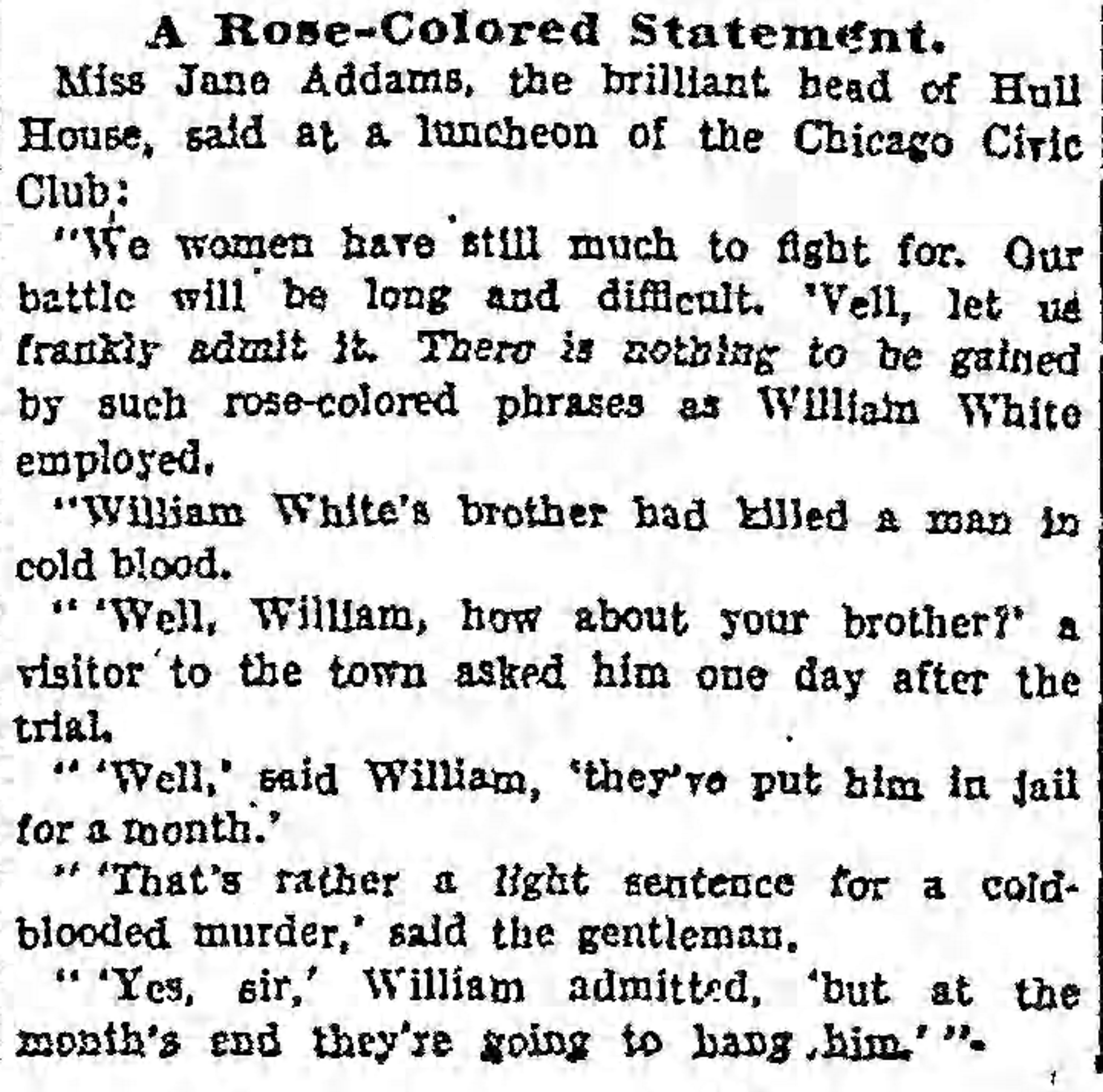 Miss Jane Addams, the brilliant head of Hull House, said at a luncheon of the Chicago Civic Club: