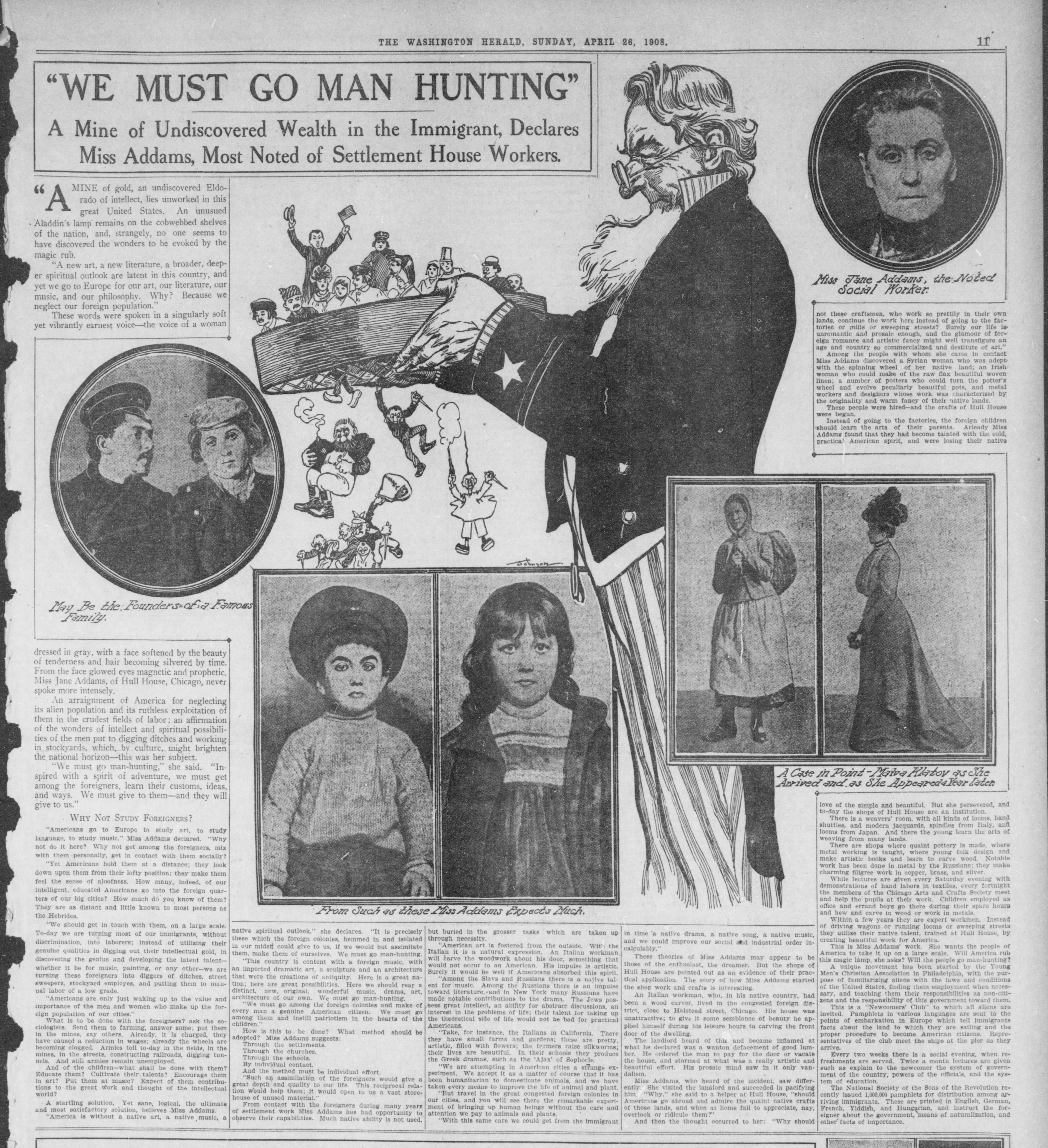 "Americans go to Europe to study art, to study language, to study music," Miss Addams declared. "Why not do it here? Why not get among the foreigners, mix with them personally, get in contact with them socially?