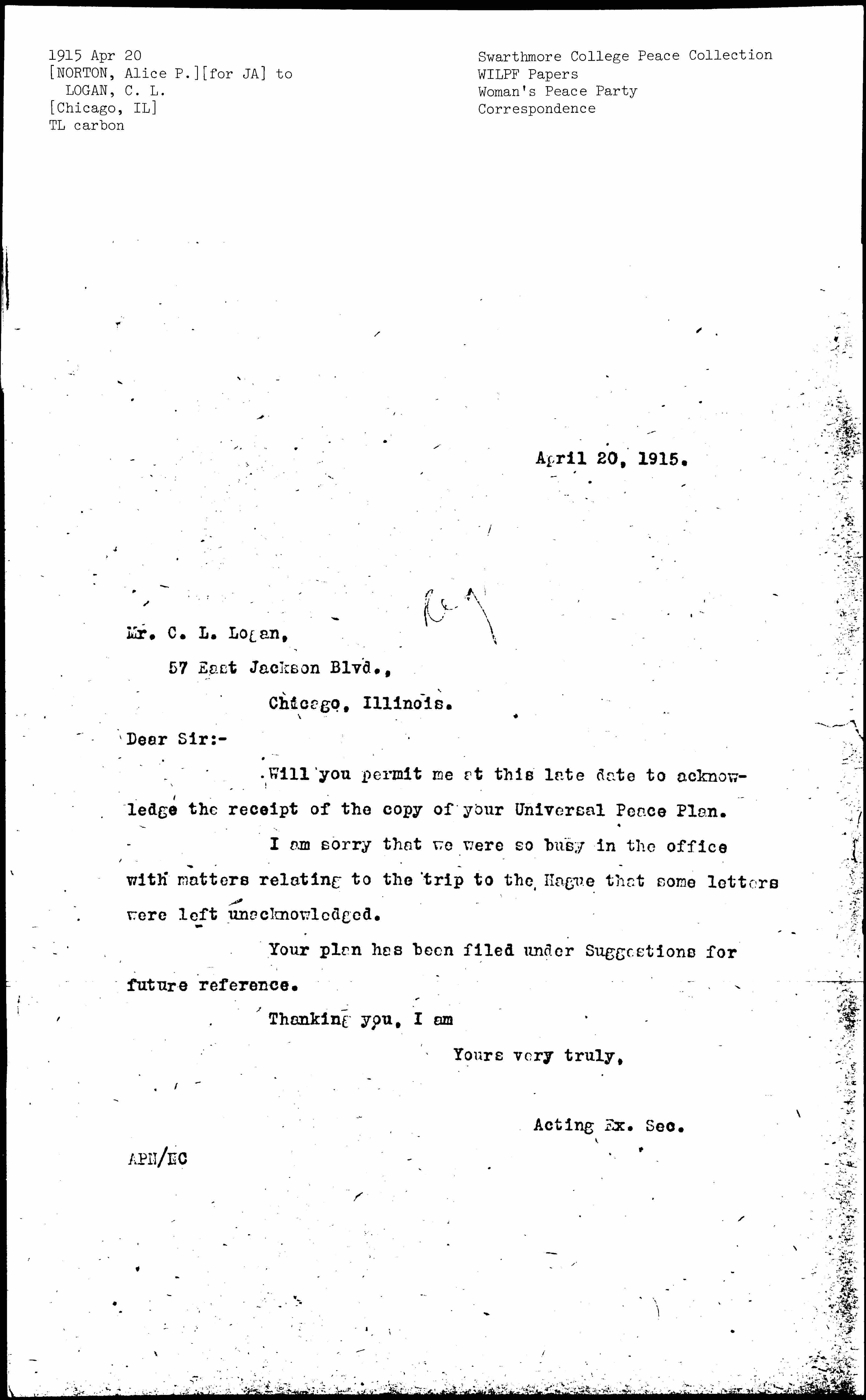 Will you permit me at this late date to acknowledge the receipt of the copy of your Universal Peace Plan.