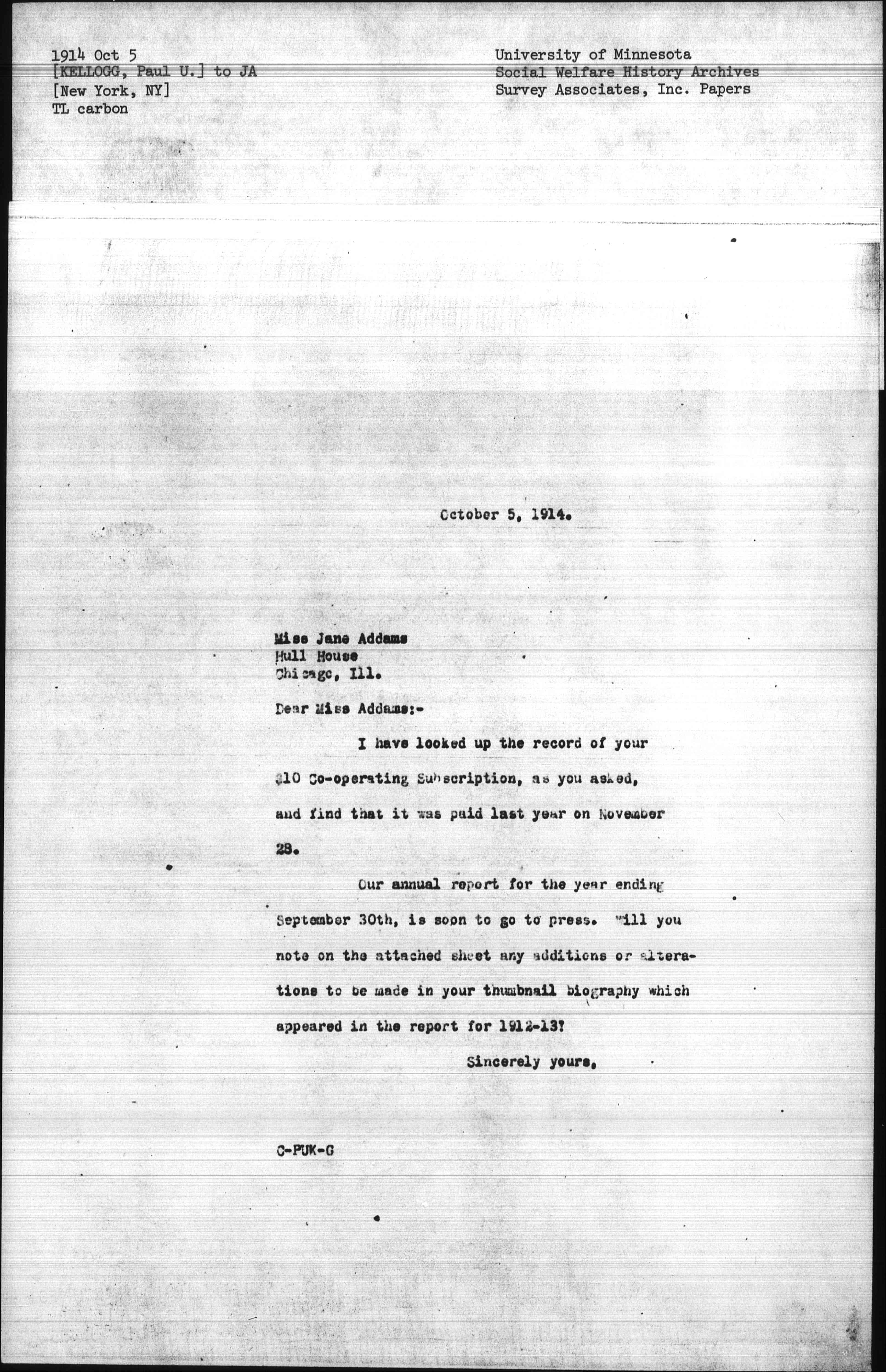 Our annual report for the year ending September 30th, is soon to go to press. Will you note on the attached sheet any additions or alterations to be made in your thumbnail biography which appeared in the report for 1912-13?