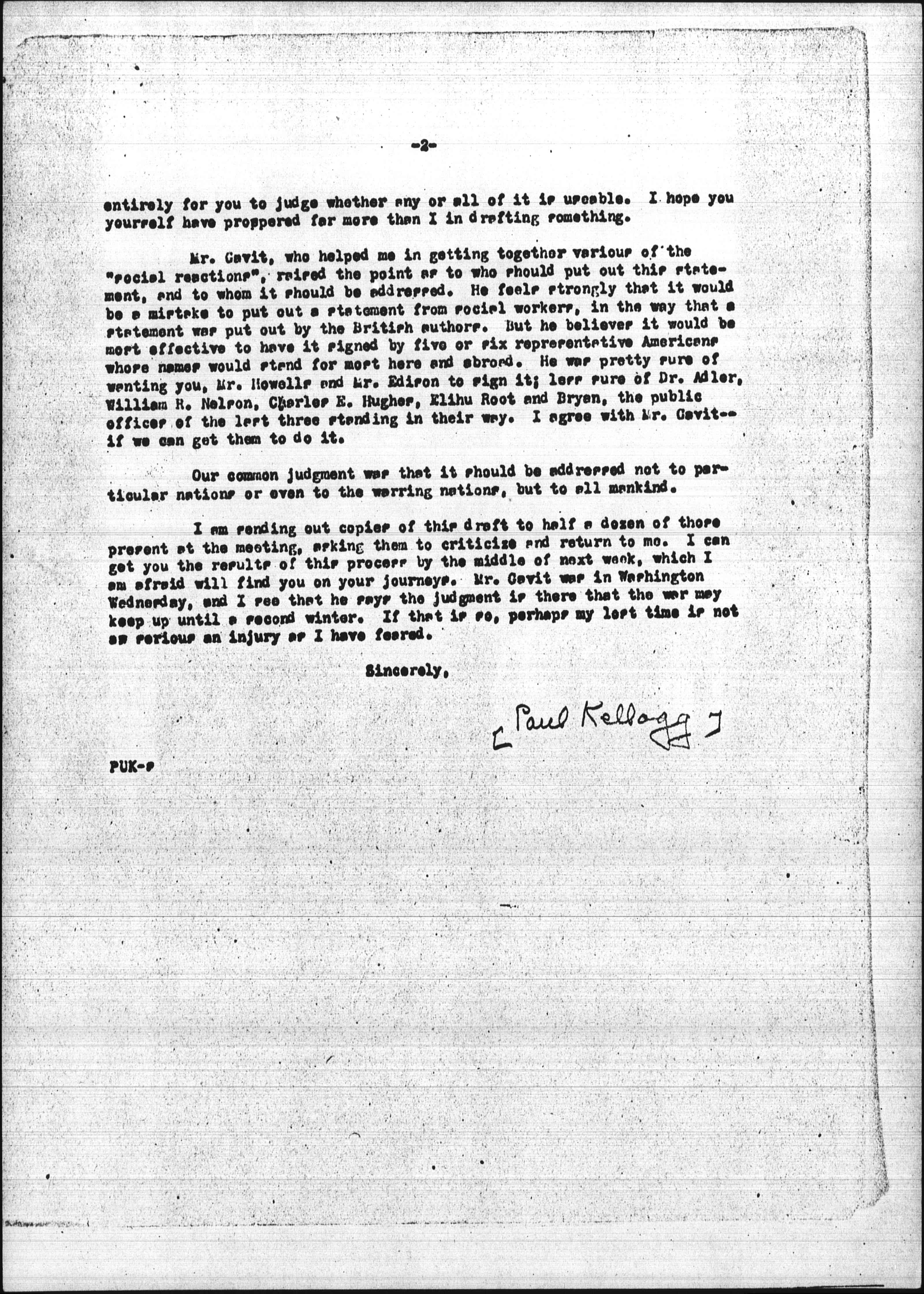 Mr. Gavit, who helped me in getting together various of the "social reactions", raised the point as to who should put out this statement, and to whom it should be addressed. He feels strongly that it would be a mistake to put out a statement from social workers, in the way that a statement was put out by the British authors. But he believes it would be most effective to have it signed by five or six representative Americans whose names would stand for most here and abroad. He was pretty sure of wanting you, Mr. Howells and Mr. Edison to sign it; less sure of Dr. Adler, William R. Nelson, Charles E. Hughes, Elihu Root and Bryan, the public officer of the last three standing in their way. I agree with Mr. Gavit -- if we can get them to do it.