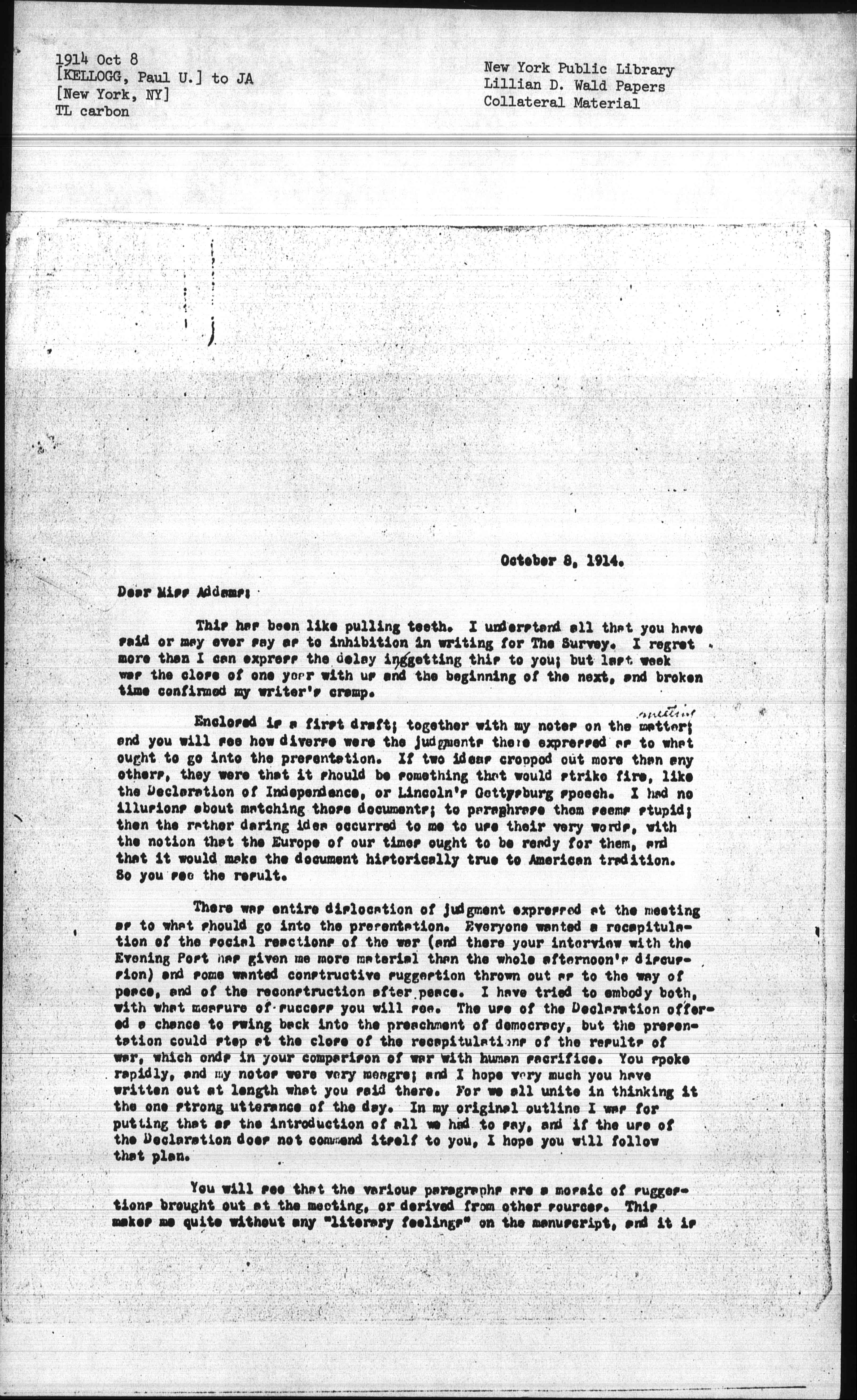 There was entire dislocation of judgment expressed at the meeting as to what should go into the presentation. Everyone wanted a recapitulation of the social reactions of the war (and there your interview with the Evening Post has given me more material than the whole afternoon's discussion) and some wanted constructive suggestion thrown out as to the way of peace, and of the reconstruction after peace. I have tried to embody both, with what measure of success you will see. The use of the Declaration offered a chance to swing back into the preachment of democracy, but the presentation could stop at the close of the recapitulations of the results of war, which ends in your comparison of war with human sacrifice. You spoke rapidly, and my notes were very [meager]; and I hope very much you have written out at length what you said there. For we all unite in thinking it the one strong utterance of the day. In my original outline I was for putting that as the introduction of all we had to say, and if the use of the Declaration does not commend itself to you, I hope you will follow that plan.