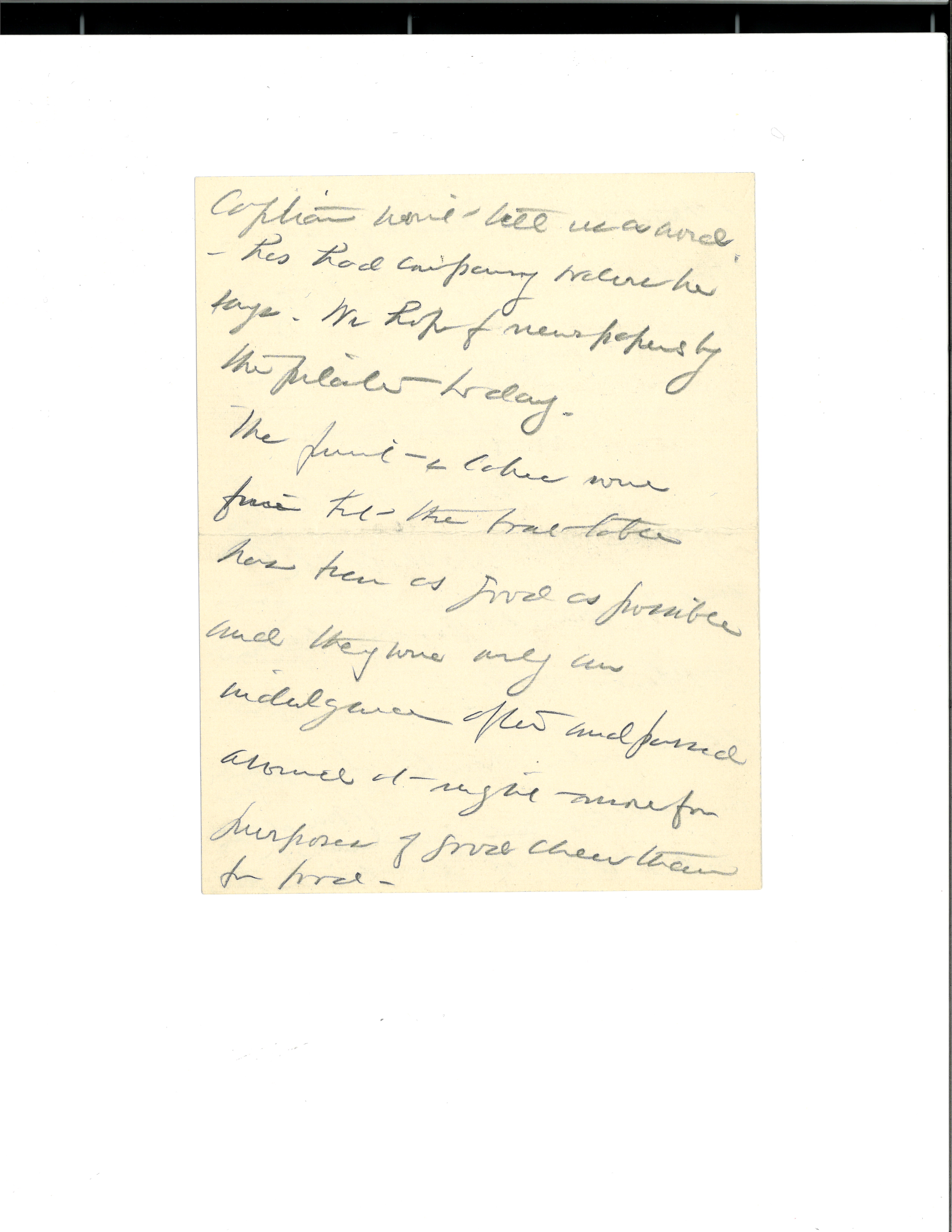 I am quite frantic for letters and [although] our wireless <apparatus> ticks all of the time, the [page 4] Captain won't tell us a word -- he's had company orders he says. We hope for newspapers by the [pilots] today.