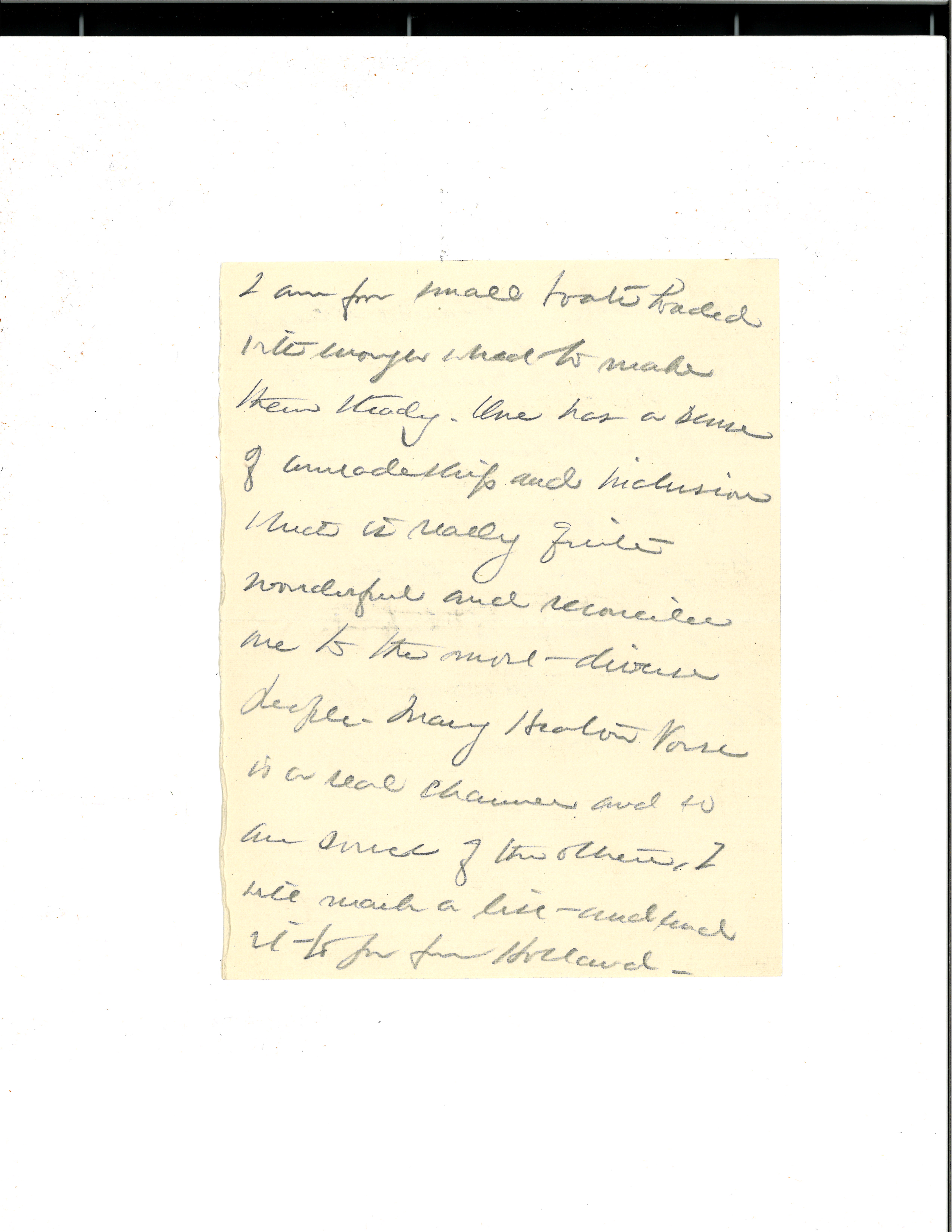 I am for small boats loaded with enough [which] to make them steady. One has a sense of comradeship and inclusion that is really quite wonderful and reconciles one to the most diverse people. Mary Heaton Vorse is a real charmer and so are [some] of the others, I will [mark] a list and send it to you from Holland. [page 6]