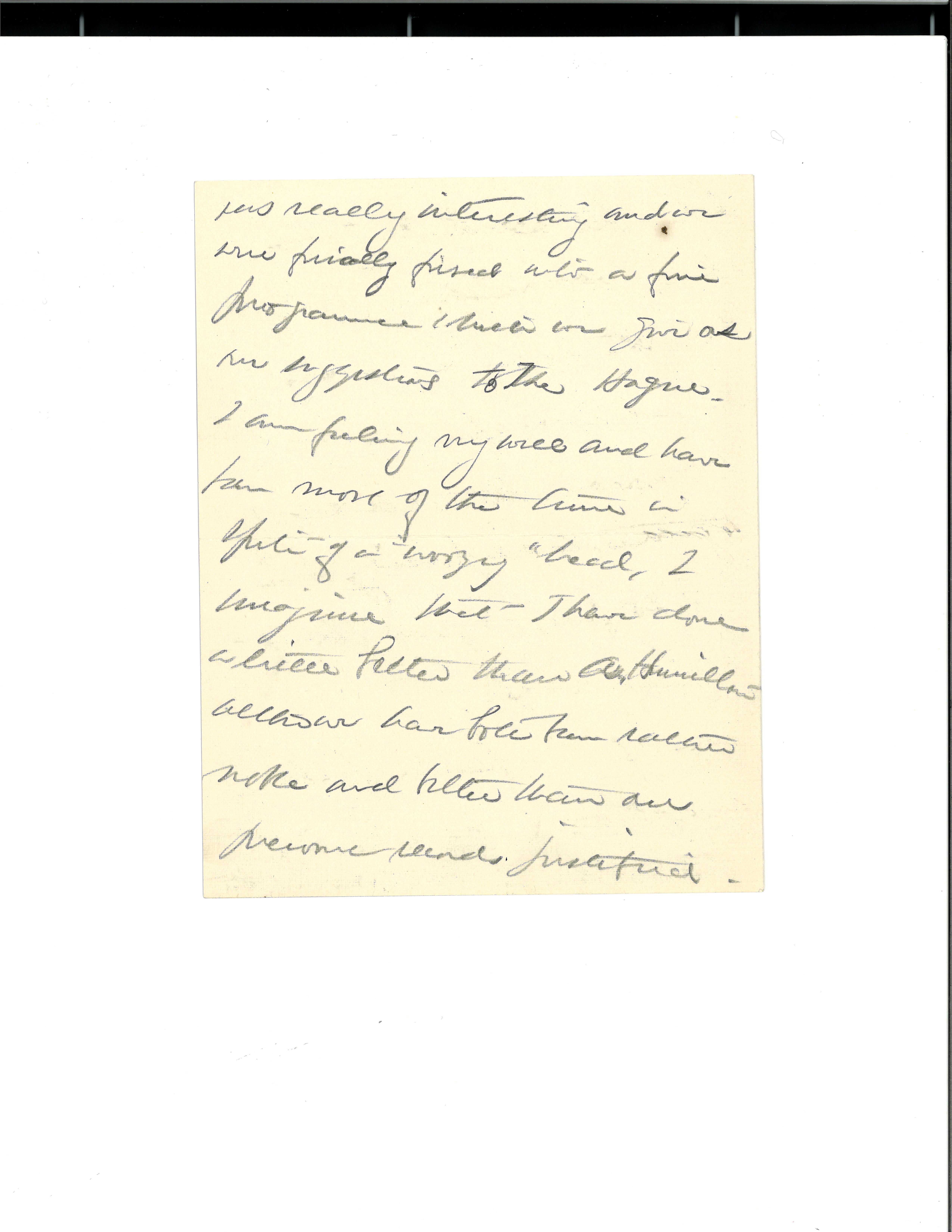 A class every day at 11 o'clock, almost every day at 3 o'clock, and every evening at 8 o'clock sounds pretty awful but [page 2] was really interesting and we were finally fixed into a fine [program] which we give out our suggestions to The Hague. I am feeling very well and have been most of the time in spite of a "woozy" head, I imagine that I have done a little better than A. Hamilton [although] we have both been rather [noble] and better than our [previous] records justified. [page 3] I have felt all kinds of ways about the mission itself but the women on the whole are as nice & friendly as 40 women, thrown suddenly together, could possibly be -- and so far, so good, whatever happens next.