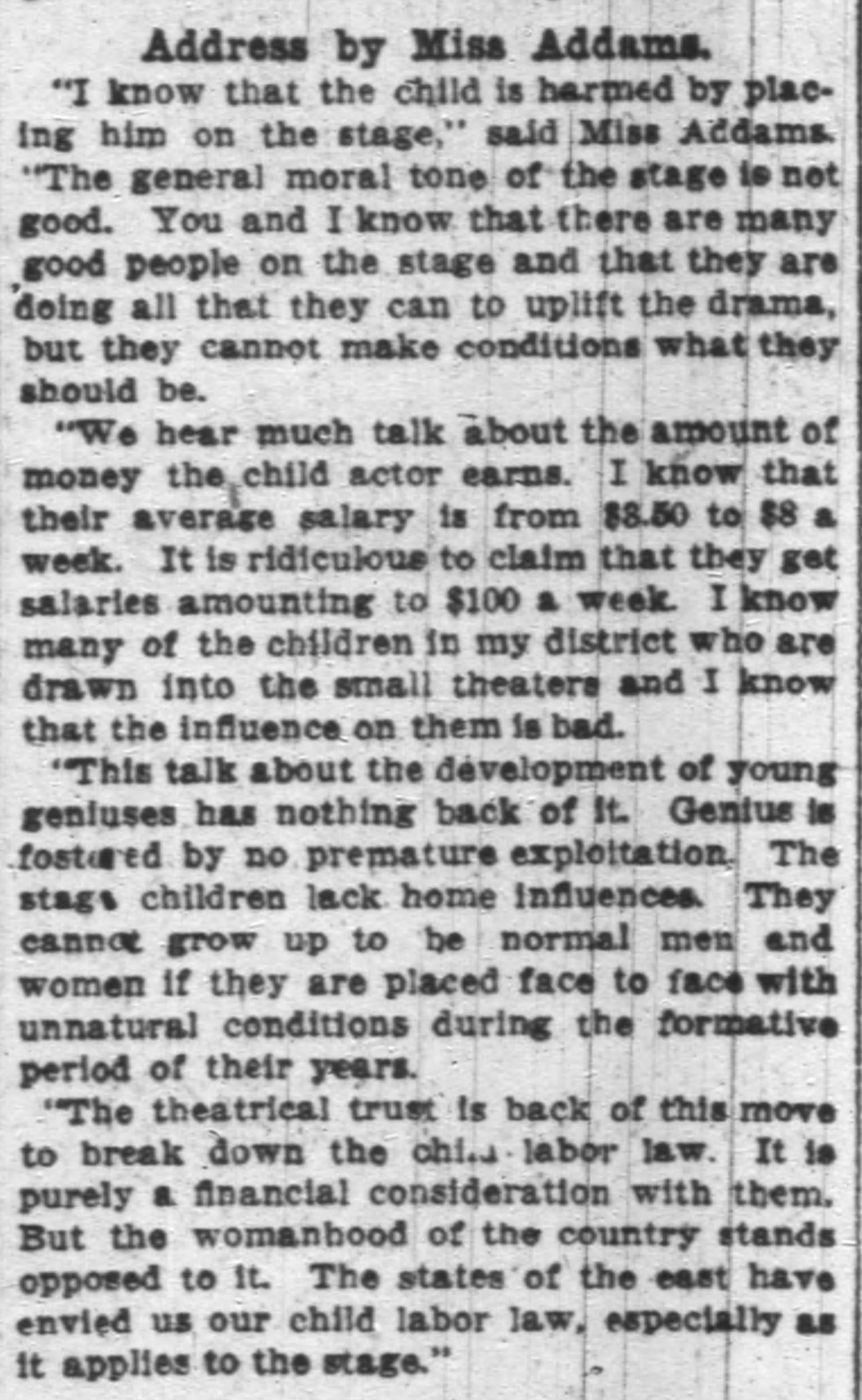 "I know that the child is harmed by placing him on the stage," said Miss Addams. "The general moral tone of the stage is not good. You and I know that there are many good people on the stage and that they are doing all that they can to uplift the drama, but they cannot make conditions what they should be.